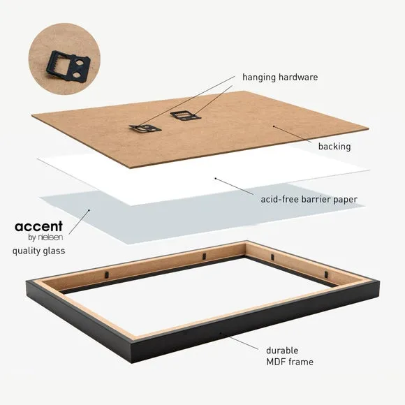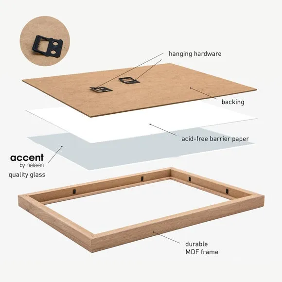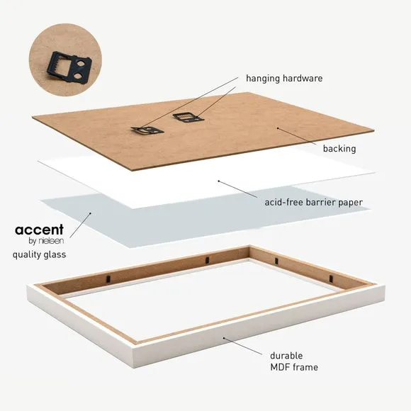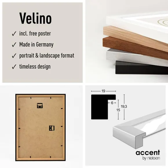 * Wooden photo frame* Mix and match style* 2mm glass* Hang portrait or landscape Freshen up your walls with the Velino picture frame – a sleek and stylish piece that’s ready to hang straight out of the box. With its clean lines, smooth MDF finish and included abstract poster print, it works beautifully on its own or as part of a gallery wall mix. The clear glass front keeps your artwork protected and looking sharp, while the handy sawtooth hangers on the back make it easy to mount either portrait or landscape.