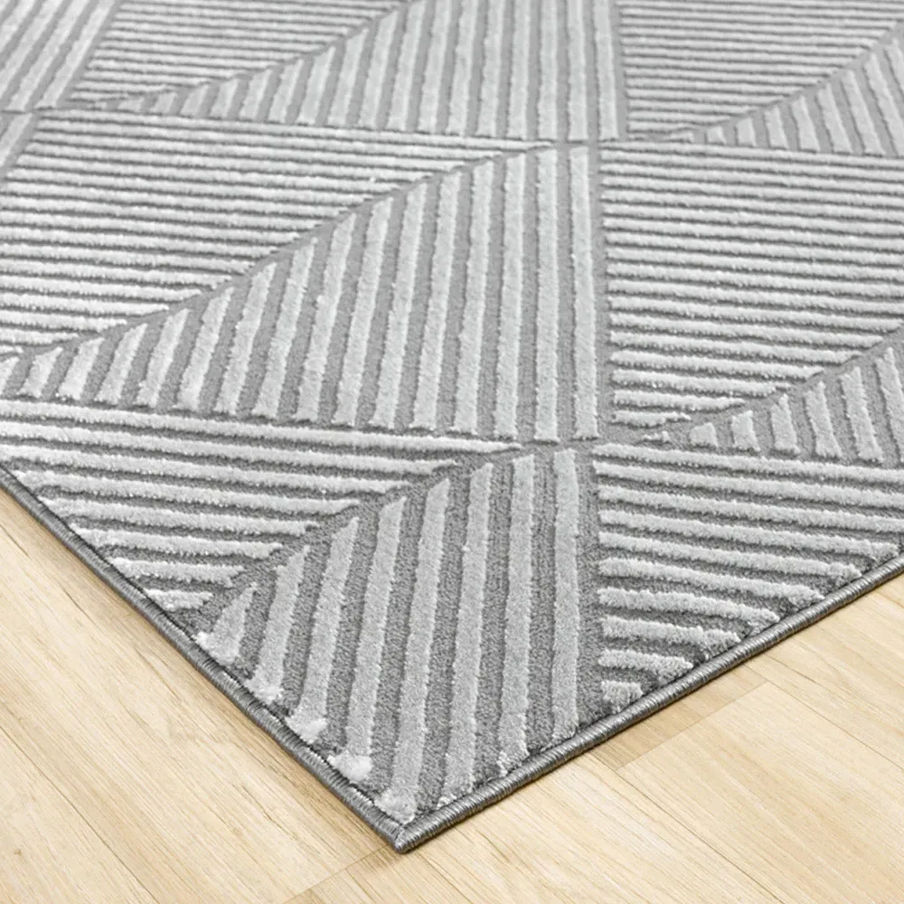 The Vellure rug combines striking pyramid design with metallic sheen accents. Its 11mm embossed cut-shrink pile provides luxurious underfoot comfort while creating subtle 3D texture. Made from a 50% polypropylene and 50% polyester blend, it delivers softness and durability for everyday use. The natural jute backing ensures stability and keeps the rug securely in place. W60 x D220 cm.