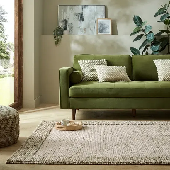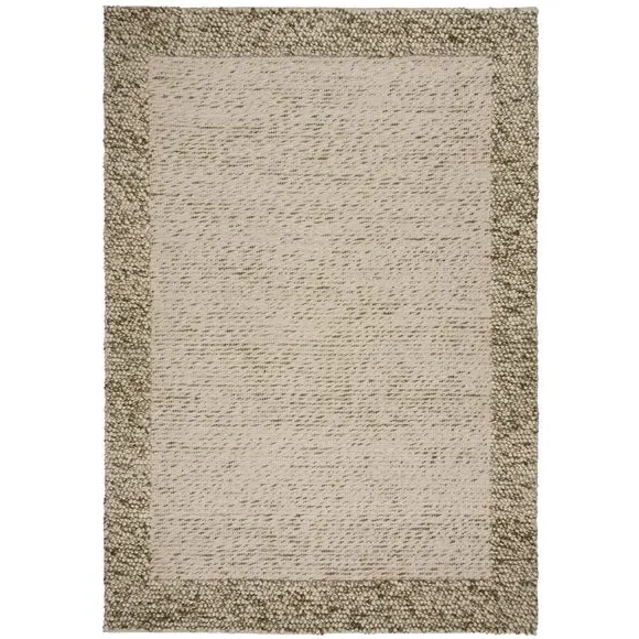 Hand-woven by rug artisans in India, the Pebble Border Wool Rug pairs a bobbled-effect with semi-plain border detailing, for a subtle and stylish finish to your flooring. In 70% wool the Pebble Border Wool rug is naturally sound and warmth insulating, perfect for those darker months. Try this design in a bedroom or living room for under-foot comfort. Rug pictured is 160cm x 230cm. This is a hand-made flatweave rug. When opening, re-roll your rug pile out and leave in a warm room for 24 hours before putting in place, this will help to reduce wrinkles and curling from packing. Do not pull any loose threads, please cut them carefully with scissors to remove. Avoid prolonged exposure to direct sunlight as this may cause fading of the colour. Turn your rug regularly to ensure even wear and to reduce pressure marks from furniture. Wool fibres may shed when new and during use, this is a characteristic of this product and is not a defect and should reduce with normal use and regular vacuuming. Before using any cleaning products on your rug, test on an inconspicuous area first to ensure it does not affect the colour. Clean spills immediately by blotting with a clean dry white cloth - do not rub as this may stain the fibres. Vacuum your rug regularly to remove everyday dirt, we recommend the use of a suction type vacuum cleaner as a rotating vacuum brush can cause damage to the pile surface. We recommend the use of an anti-slip mat beneath your rug to prevent it from slipping and sliding out of place. Latex is used on the back of this rug. Please do not leave babies or young children unsupervised on this rug.