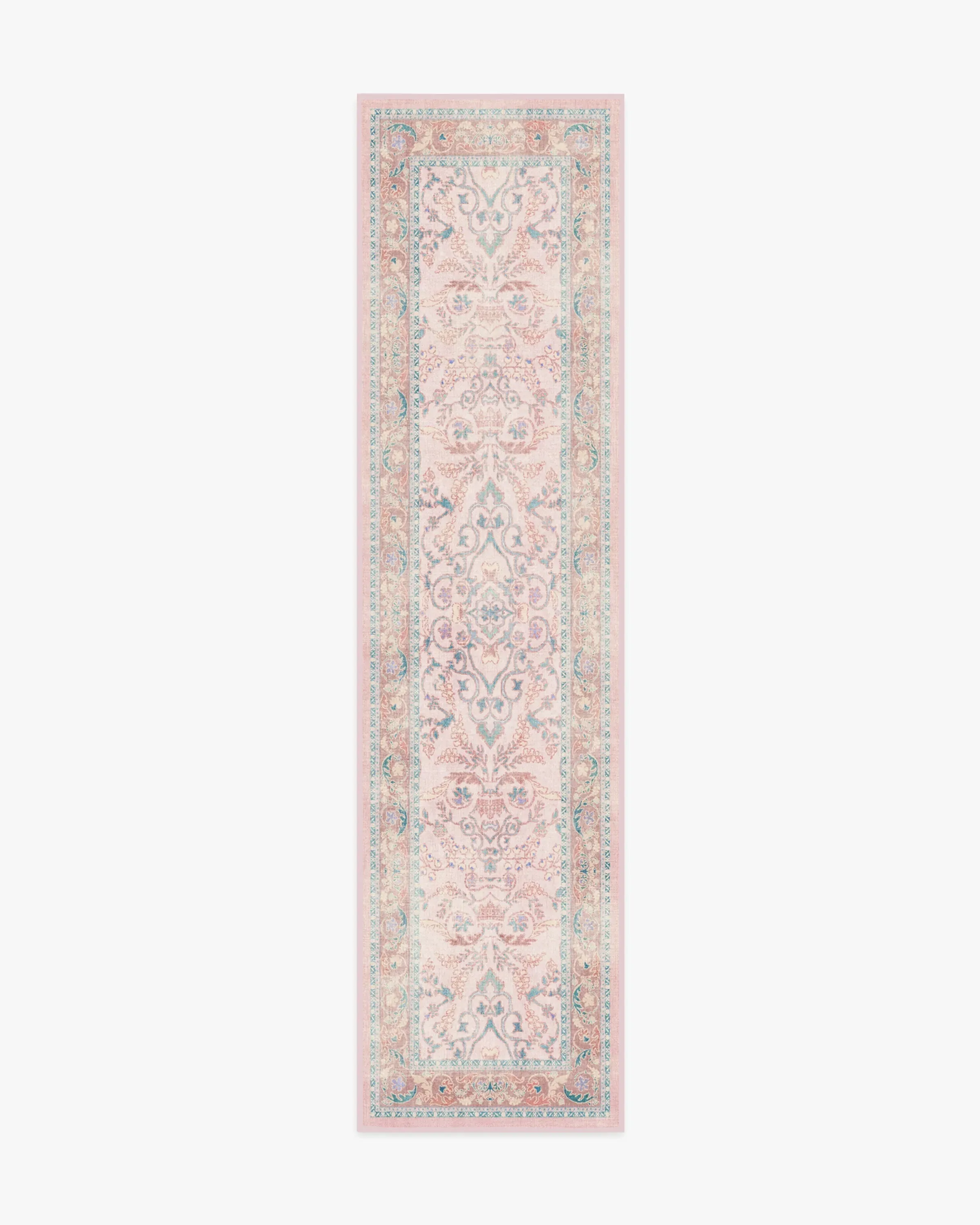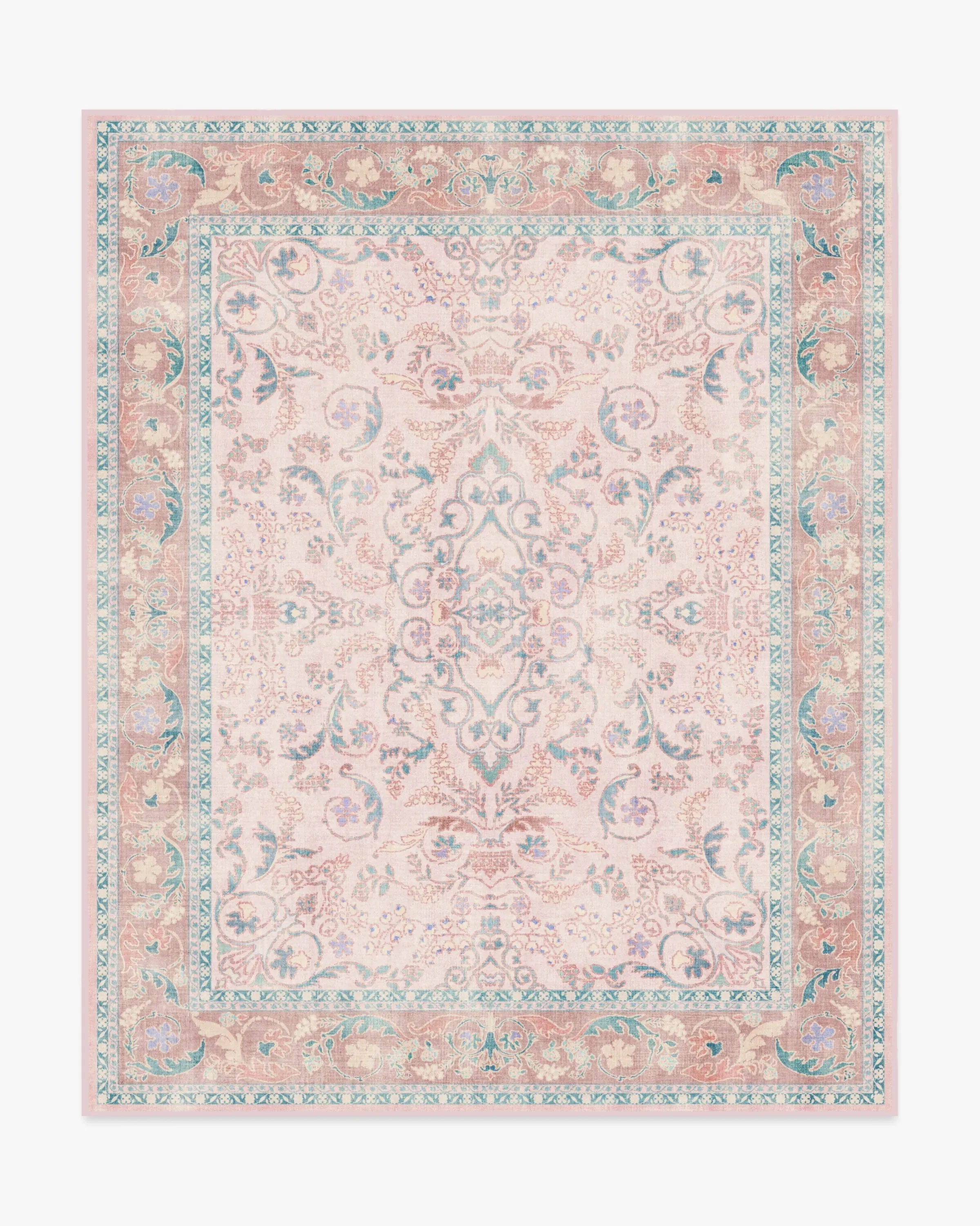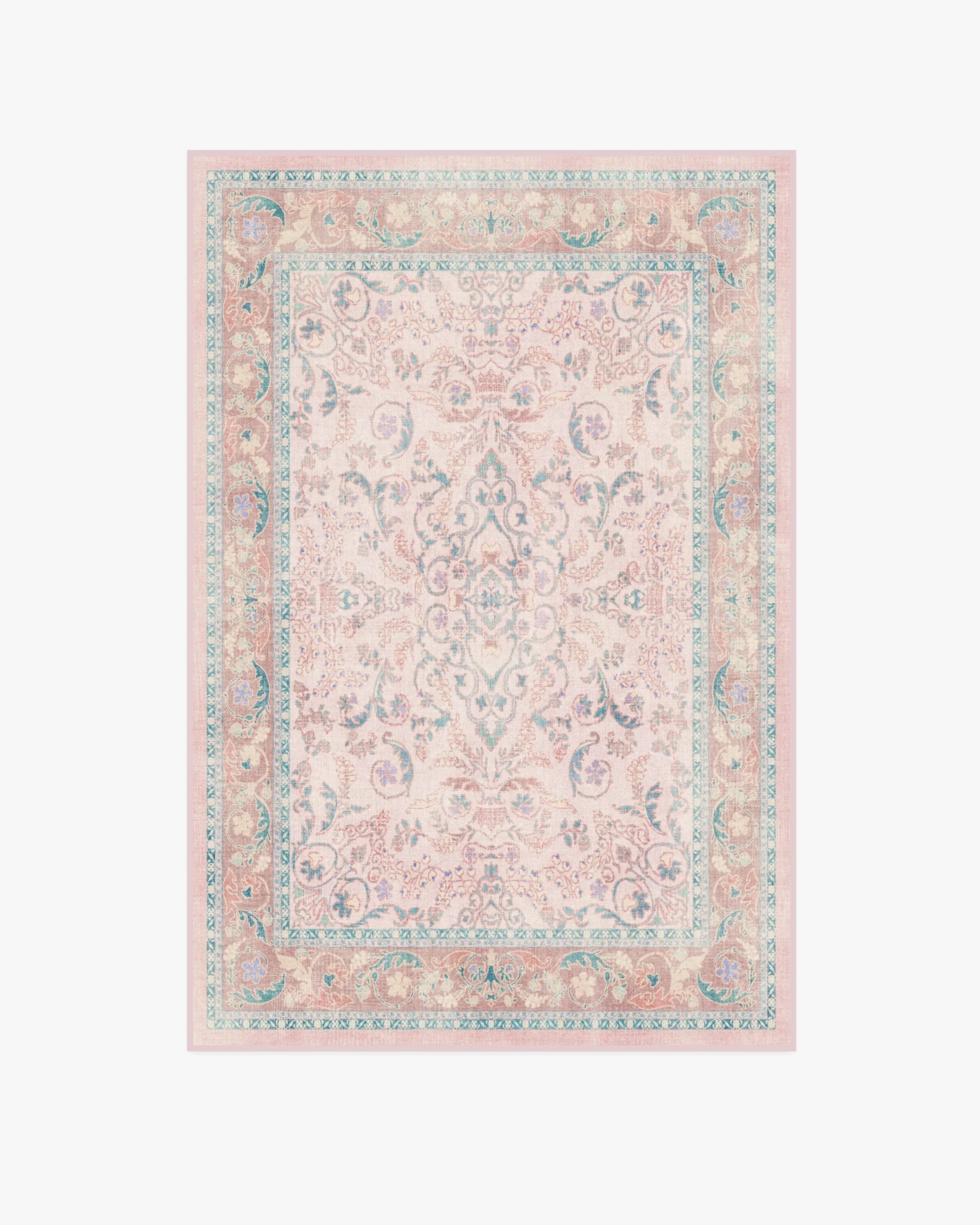 Make a grand entrance with our Bridgerton Fit for a Queen Soft Rose Rug. Inspired by ornate and embellished Regency-era interiors, this traditional rug design has lovely floral motifs reminiscent of royal garden parties. The antiqued and distressed style features soft purples, powder blues, soft rose pinks, and royal teal blues against a blush pink background. Water-resistant, stain-resistant, and machine-washable. Rug colours may vary slightly according to your device and the lighting in your space. 60x90 | Machine Washable Area Rug | Kid & Pet Friendly | Indoor Rugs | Fit For A Queen Soft Rose Rug by Bridgerton Pink | Ruggable