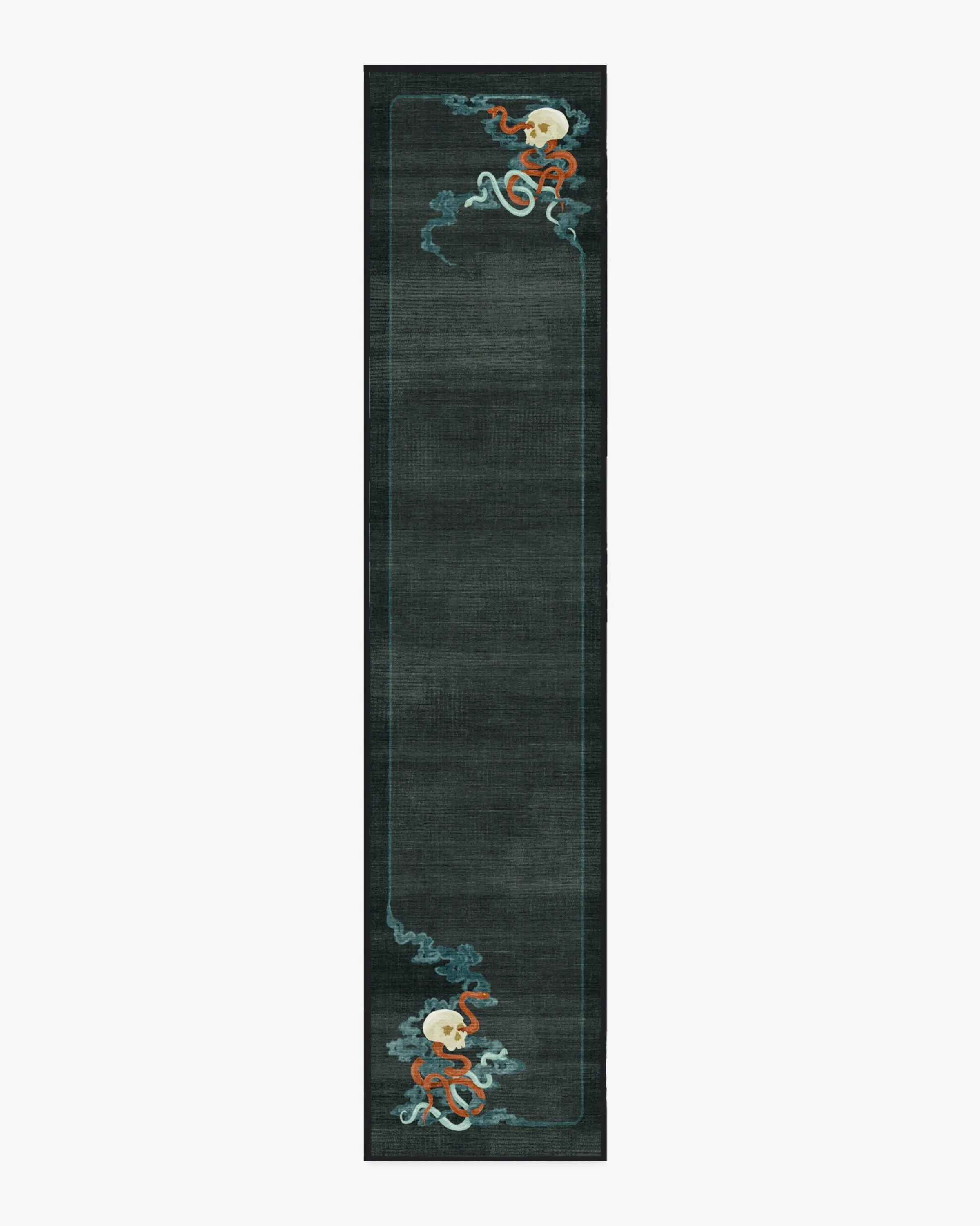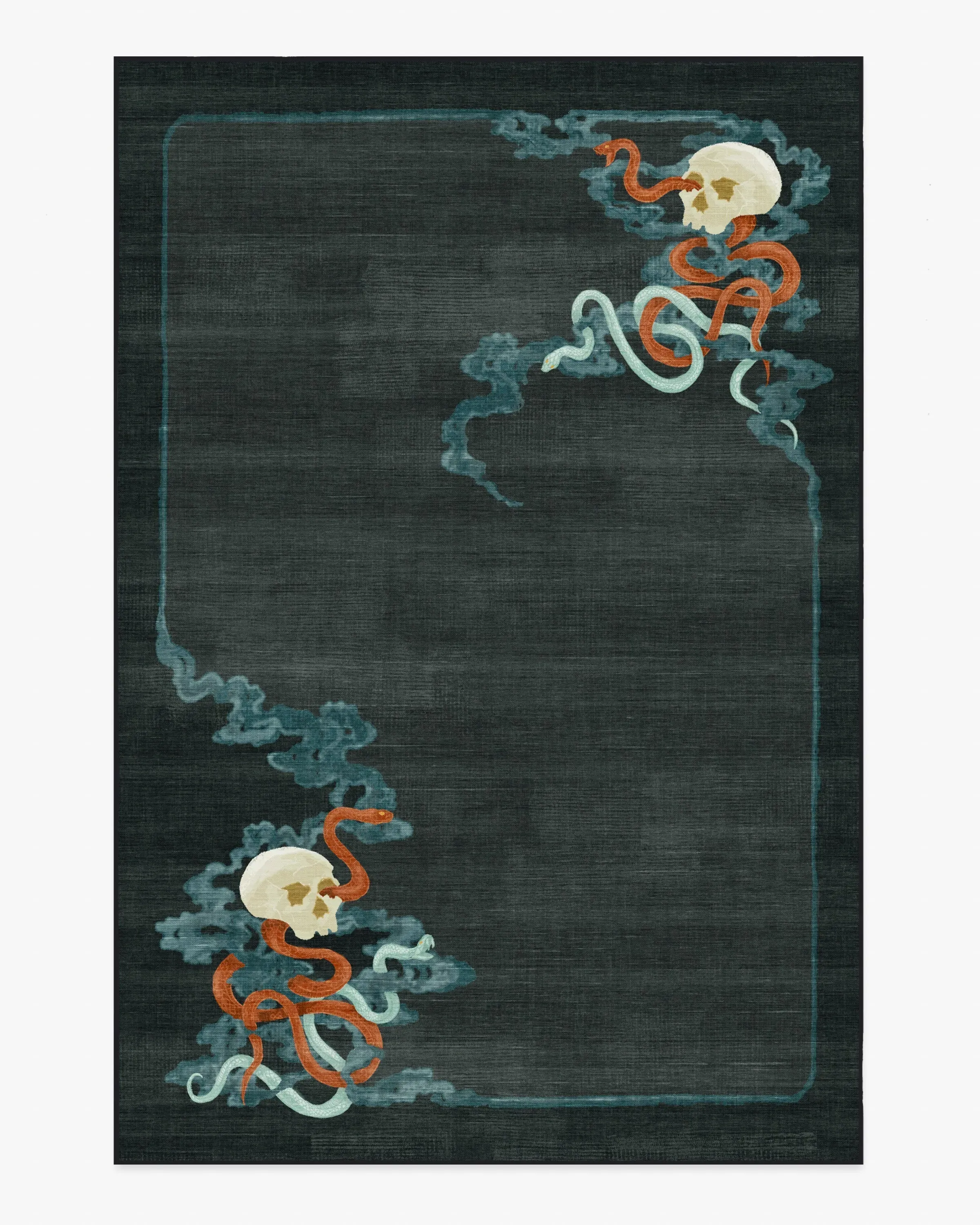 Snakes and skulls and smoke—oh my. The Serpentine Charcoal Rug perfectly pairs reds, blues, creams, and teals on a charcoal and black ground for a sophisticated yet supernatural vibe. Water-resistant, stain-resistant, and fully machine-washable. Colours may vary by device and lighting. 60x90 | Machine Washable Area Rug | Kid & Pet Friendly | Indoor Rugs | Serpentine Charcoal Flatwoven Rug | Ruggable