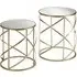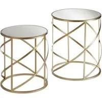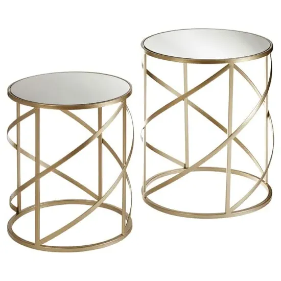 Antique copper circles and ovals interlink to form the frame of this pair of contemporary tables. FEATURES : Material : Iron, Mirrored Glass Finish : Clear, Champagne The round mirrored tabletops are inset into a strong metal frame The frames have an antique copper finish, distressed to provide added character Their wire-like construction allows for the delicate oval and circular pattern to emerge, while the smaller table can be placed within the larger one when not in use They look great displayed next to a sofa in the living room Available at an affordable price Images shown are for illustration purpose only DIMENSIONS : Height : 51cm Width : 48cm Depth : 48cm
