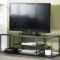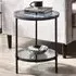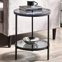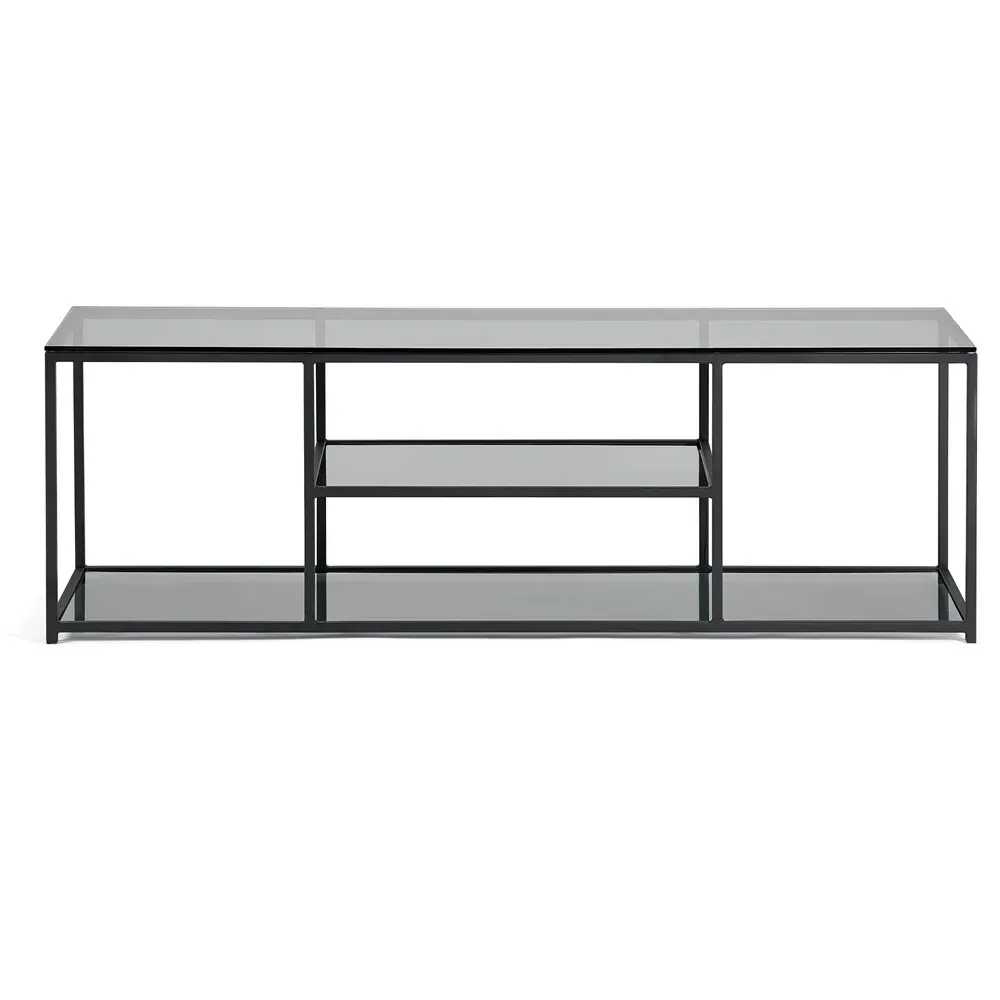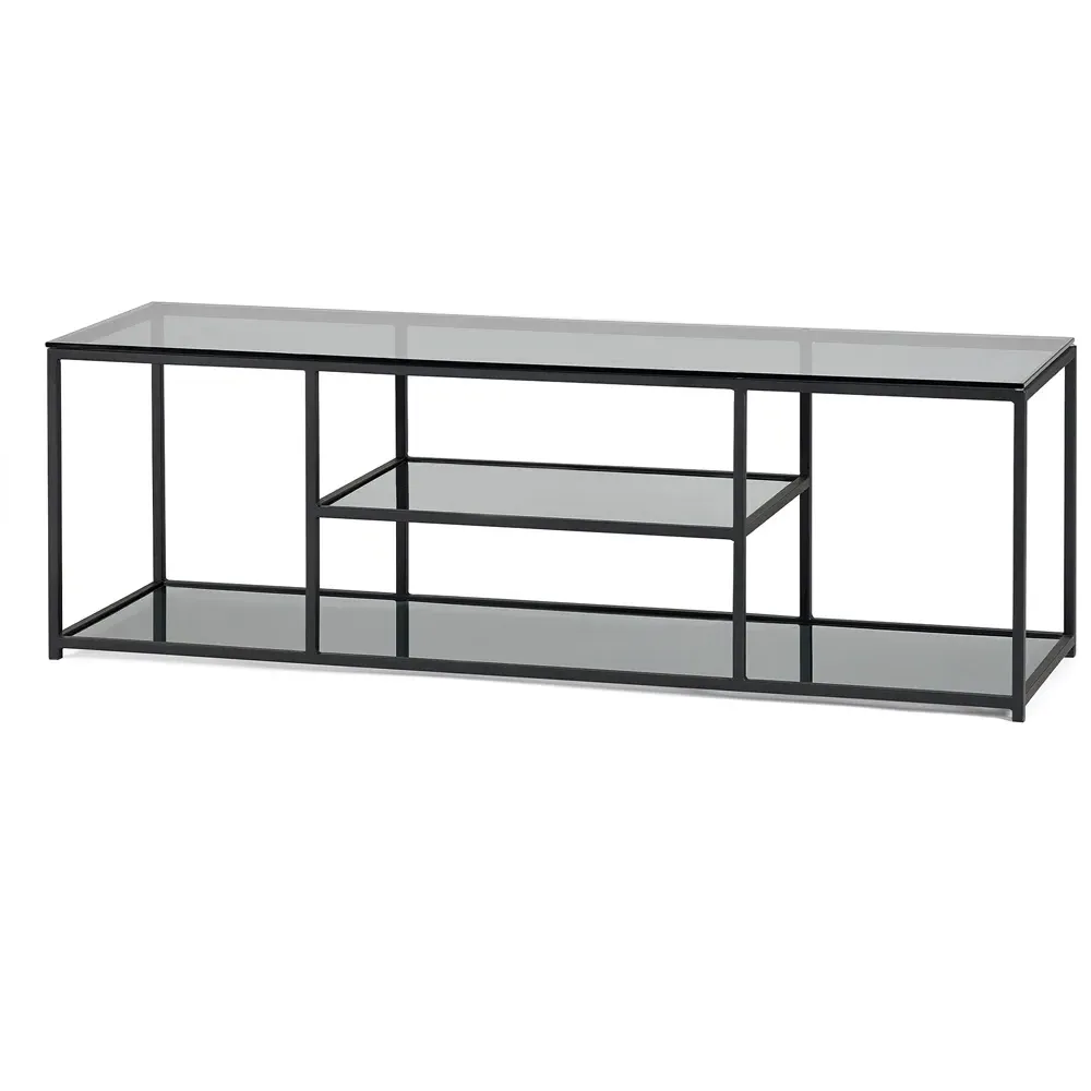 The side table features two smoked glass shelves within a compact black metal frame design. Its narrow profile fits tight spaces while providing display and storage options, and the transparent shelving maintains visual flow. The tall construction maximizes vertical storage, while the sturdy frame ensures stability for decorative items and essentials.