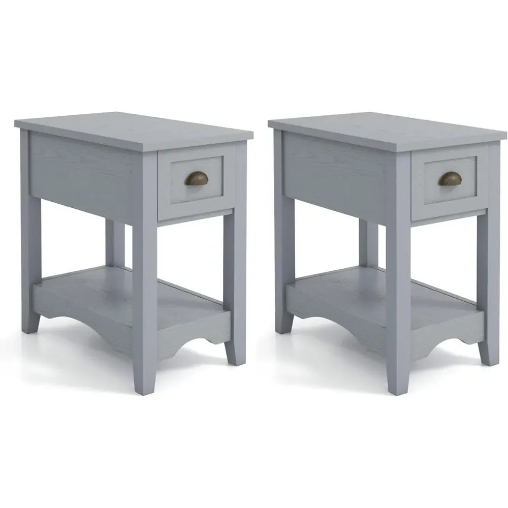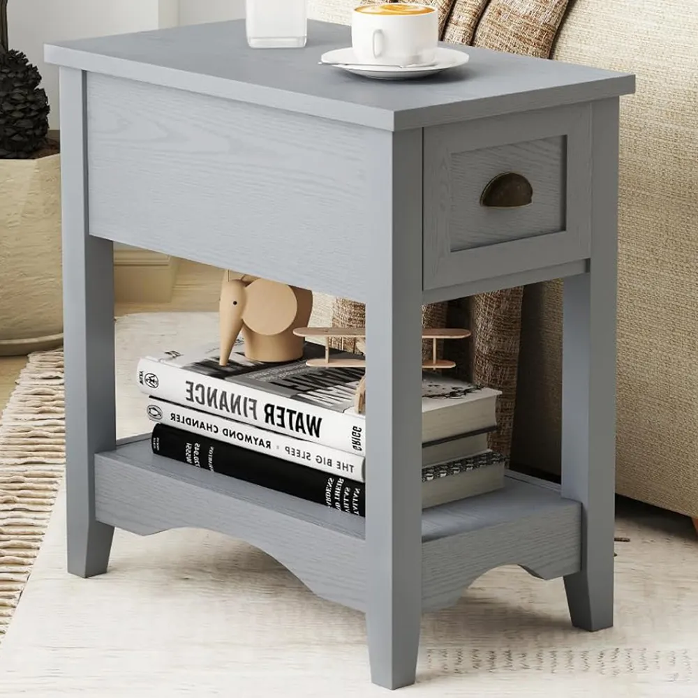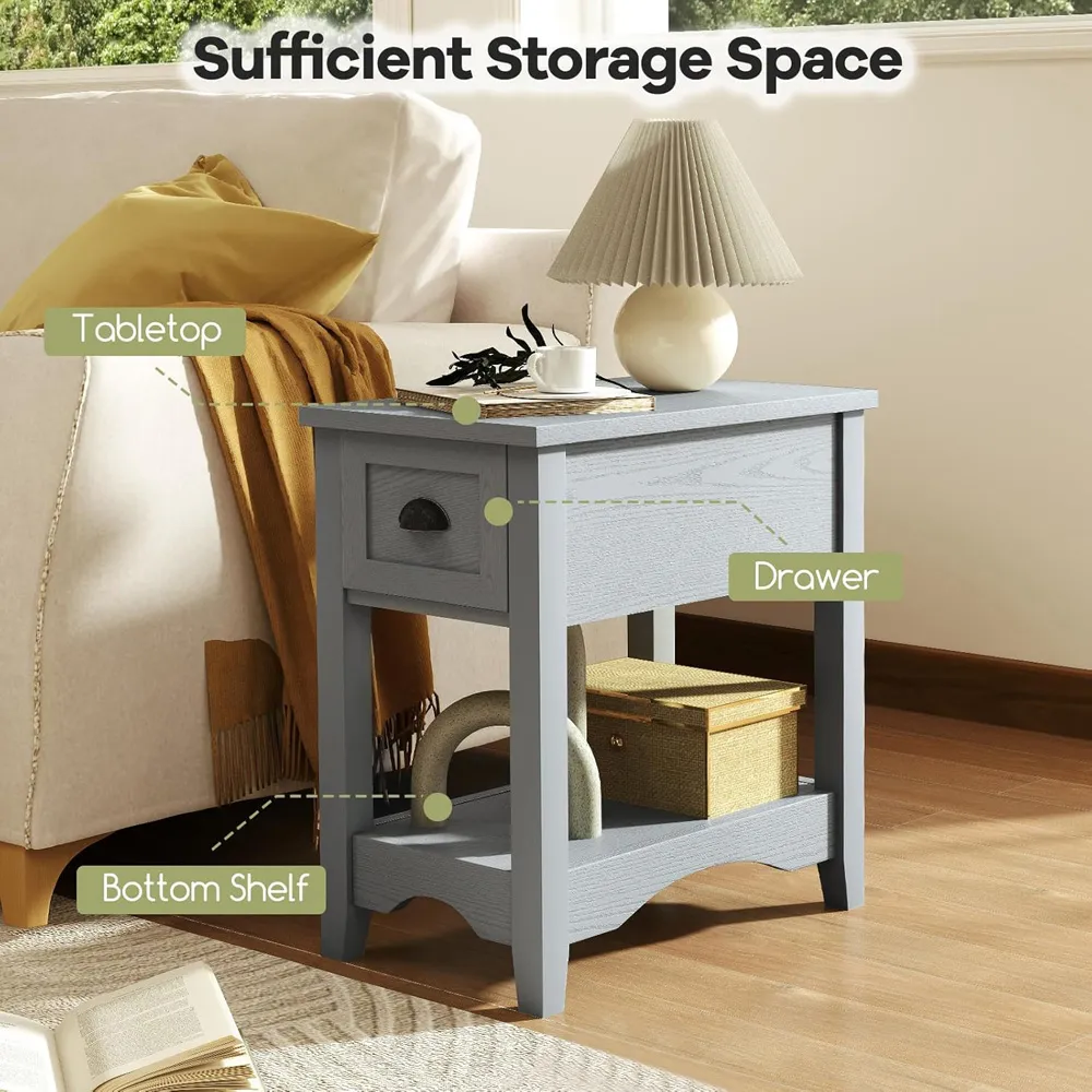 The nightstand offers compact storage with its two-tier design, featuring a top surface for essentials and a handy drawer for personal items. Its open shelf provides additional space for books or decorative items, while the robust structure with anti-slip foot pads ensures stability. The clean lines add functionality to small spaces, and the durable construction supports everyday use.