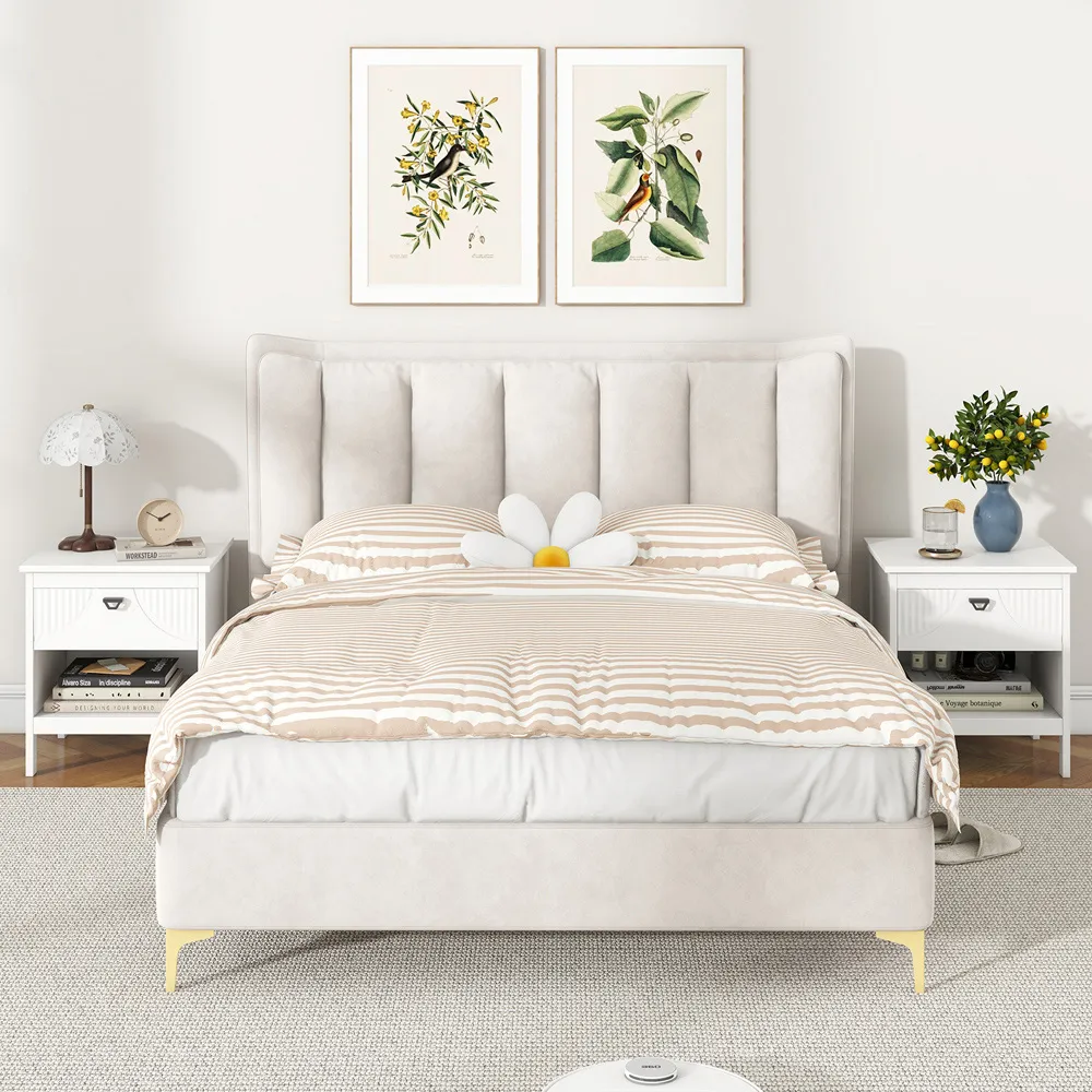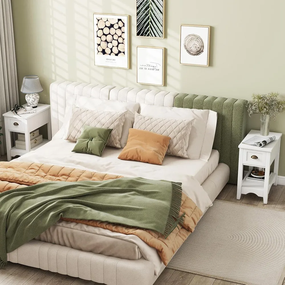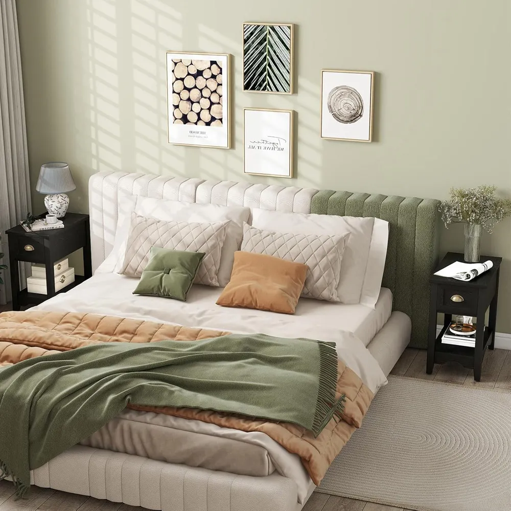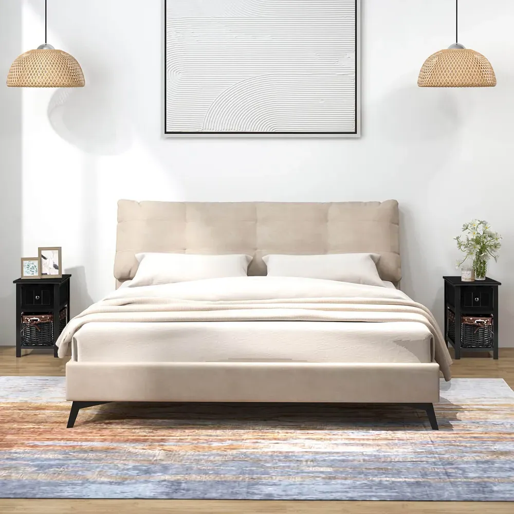 The nightstand offers compact storage with its two-tier design, featuring a top surface for essentials and a handy drawer for personal items. Its open shelf provides additional space for books or decorative items, while the robust structure with anti-slip foot pads ensures stability. The clean lines add functionality to small spaces, and the durable construction supports everyday use.