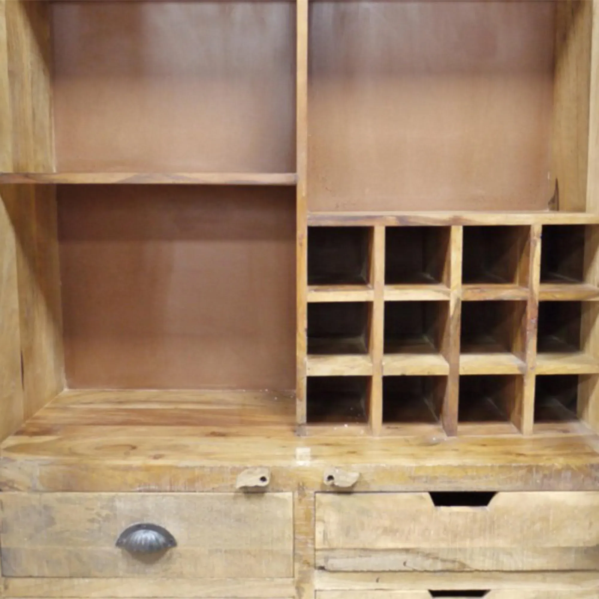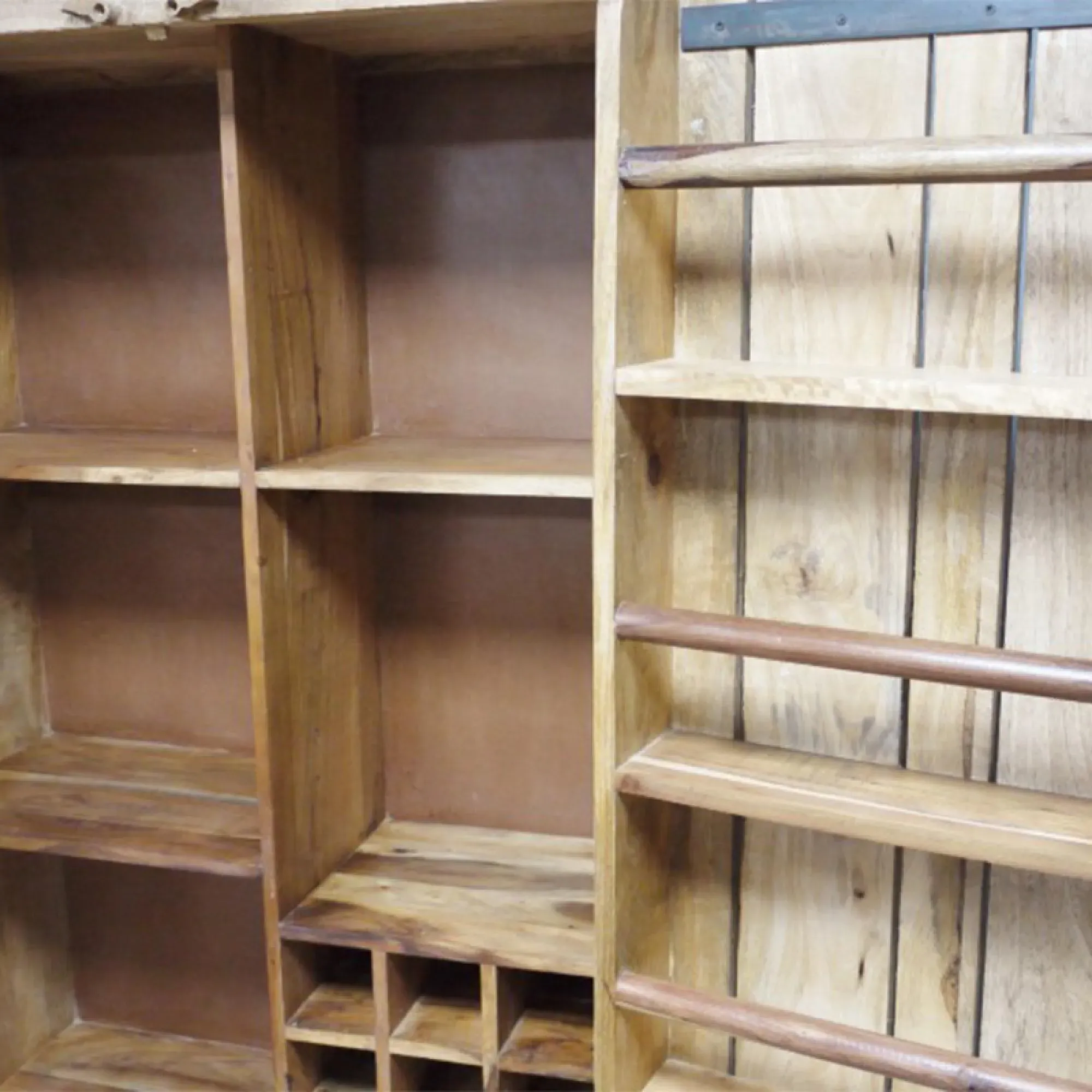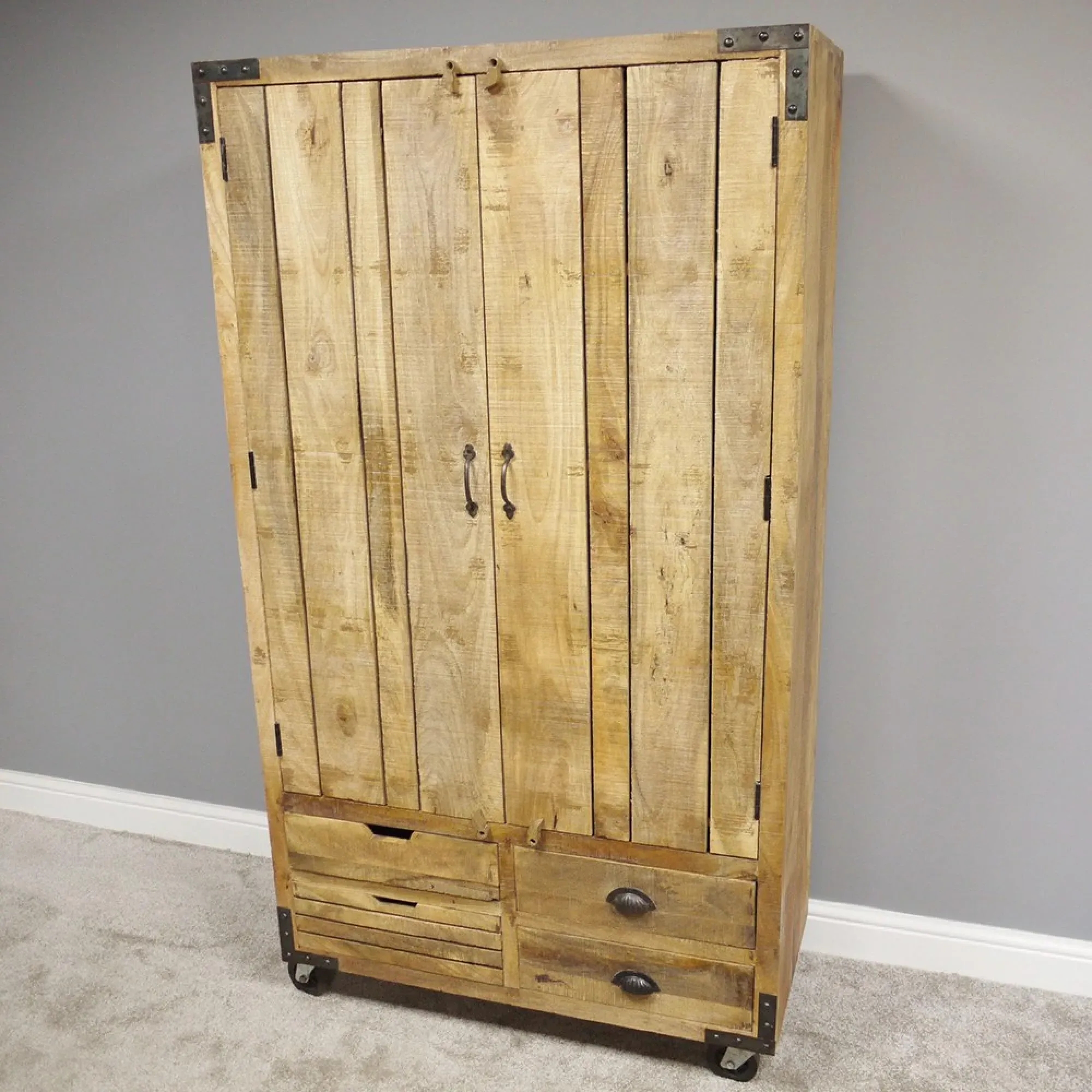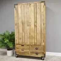 The storage cabinet combines natural wood with metal detailing, featuring a narrow profile for space-efficient storage. Its solid wood construction provides durability, while the metal accents add industrial appeal. The compact design suits tight spaces, and the natural finish complements various interior styles.