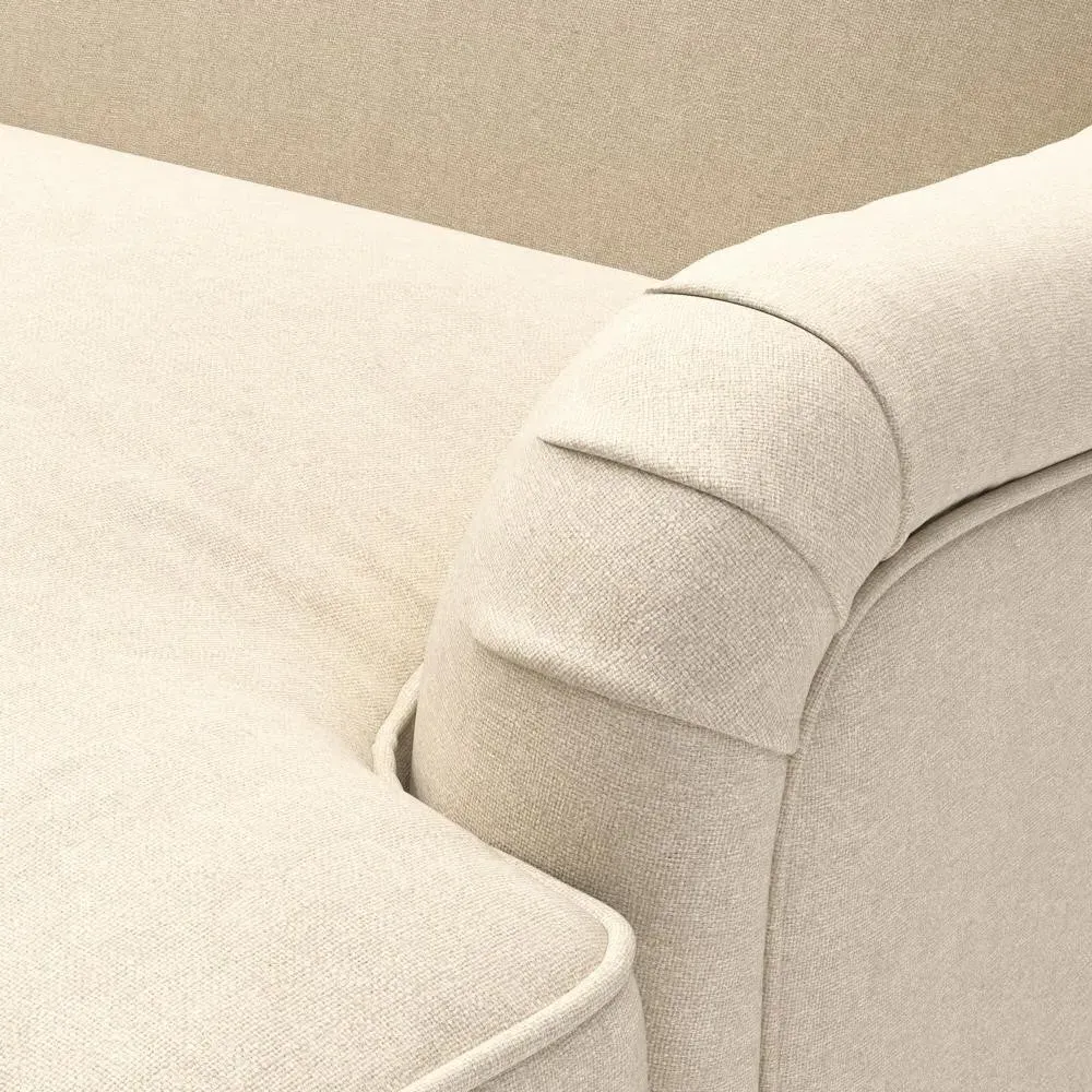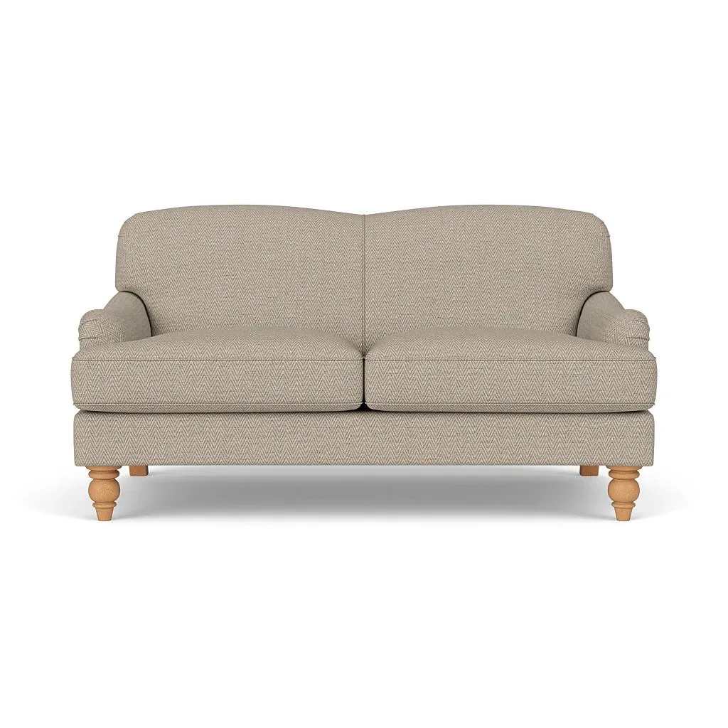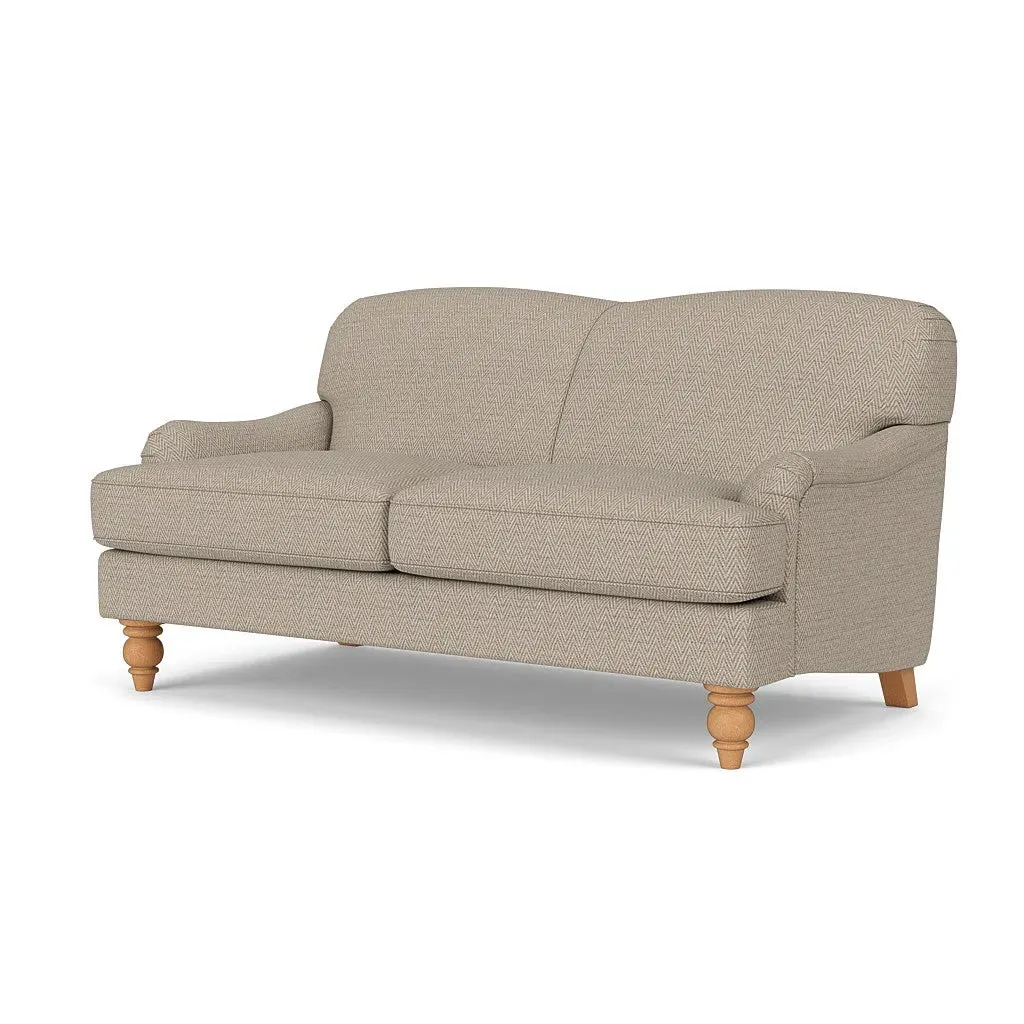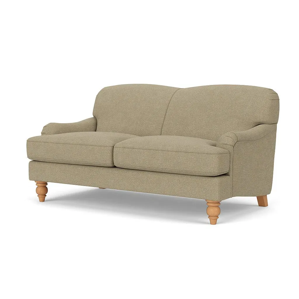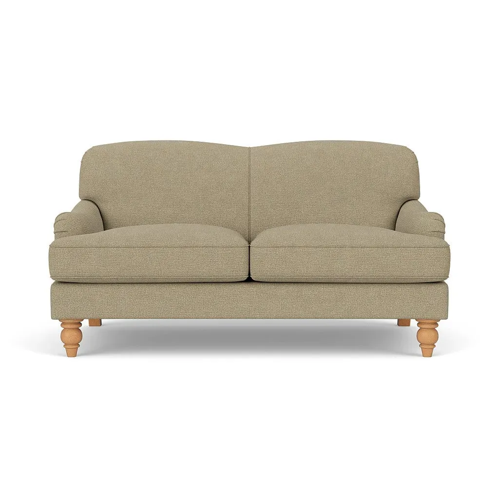 The sofa features a neatly tailored sprung back with gentle curves throughout its design. Its arm detail provides visual appeal, while the hand-turned feet add character and stability. The house weave fabric offers durability and texture, and the sprung back construction ensures comfortable support.