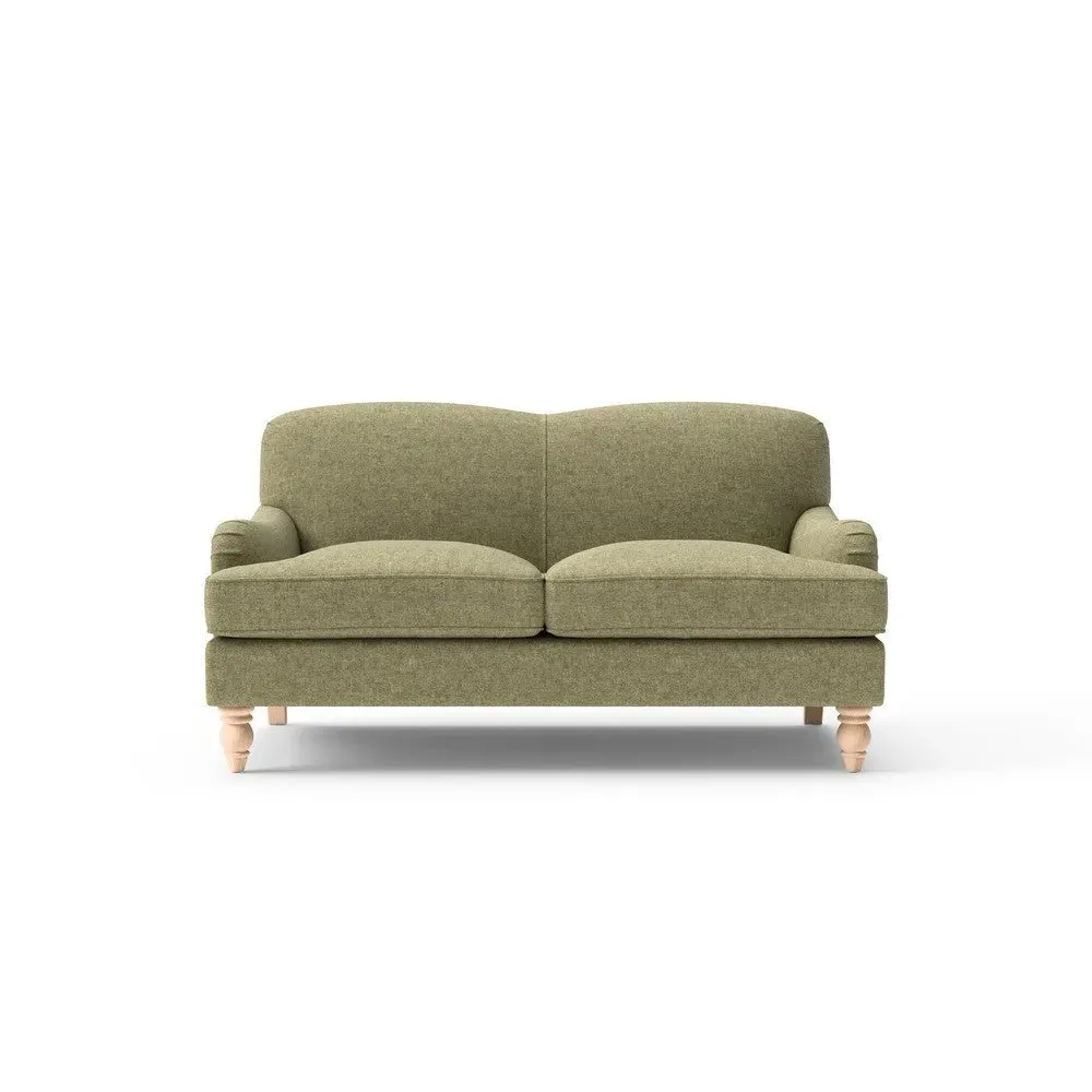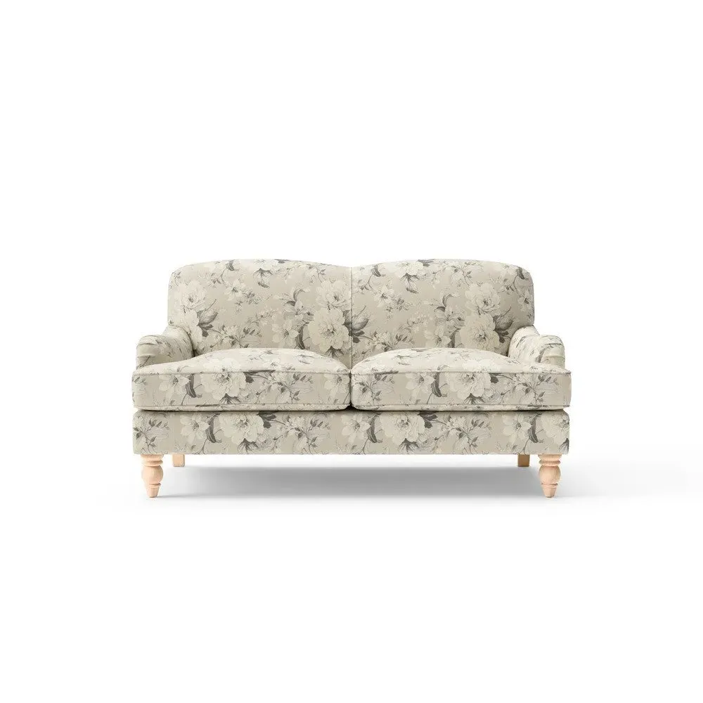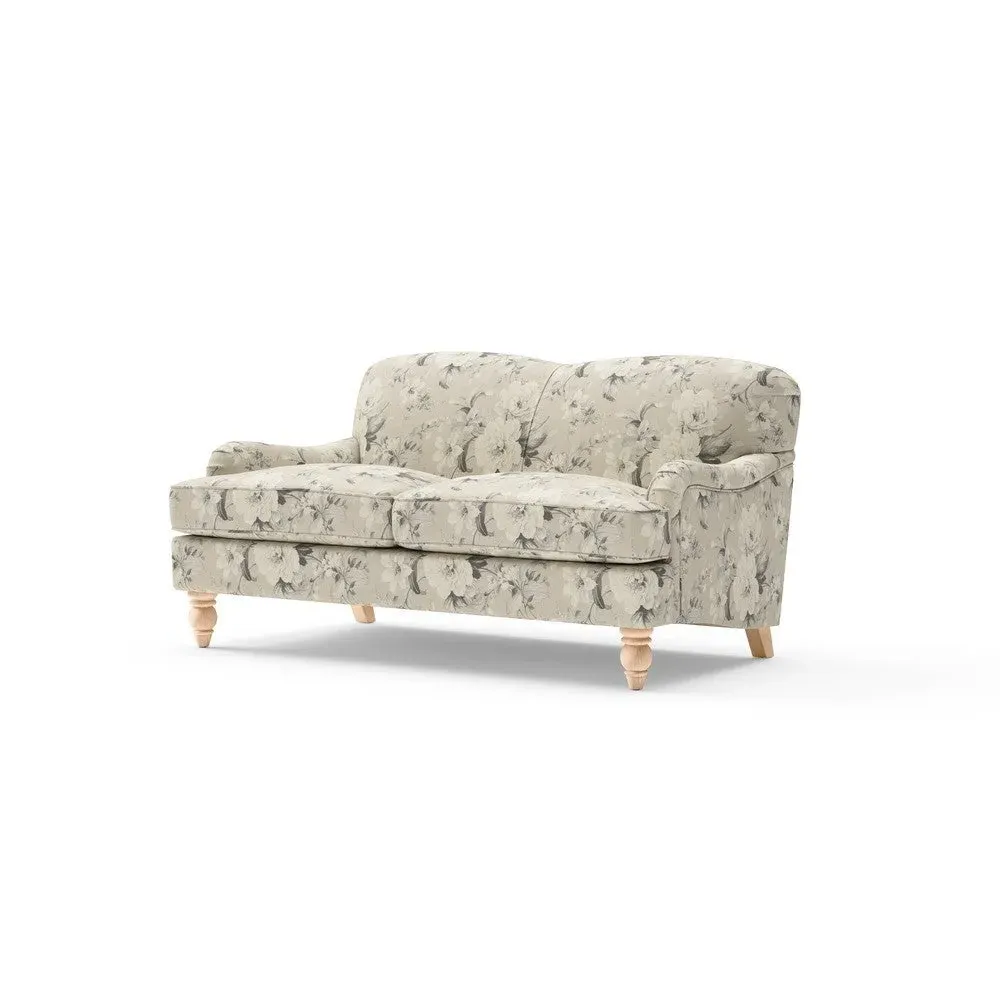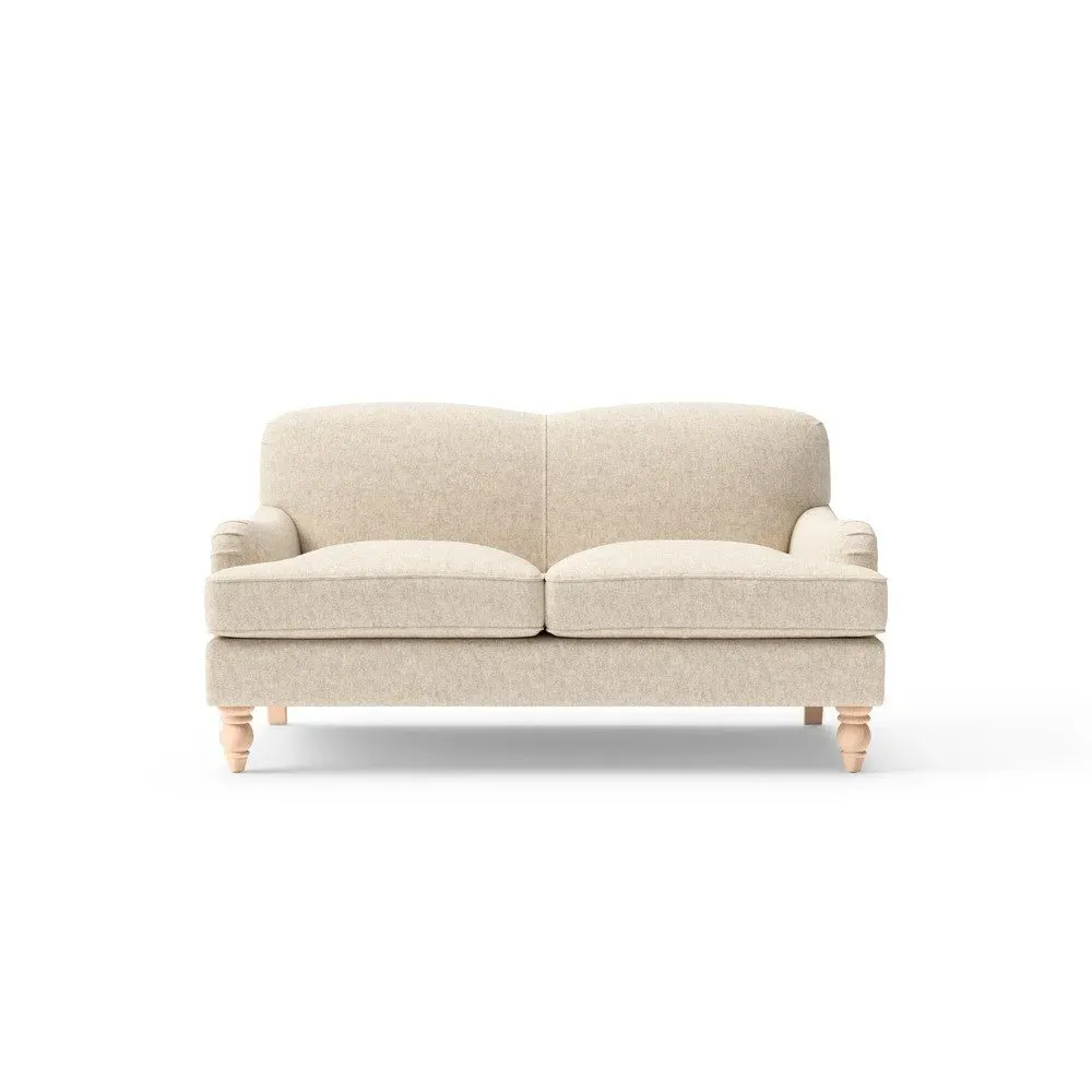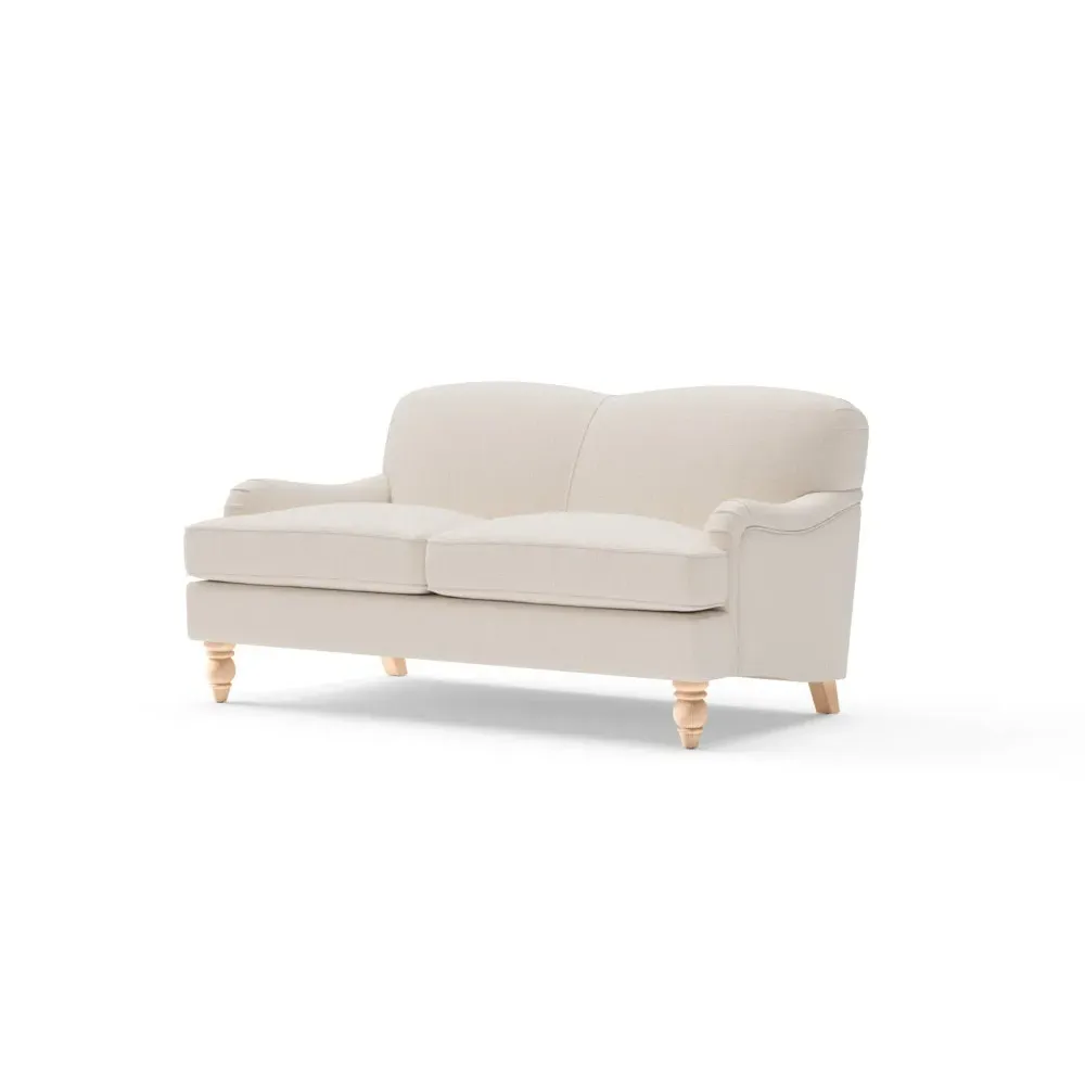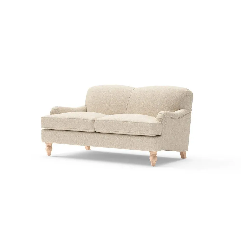 The sofa features a neatly tailored sprung back with gentle curves throughout its design. Its arm detail provides visual appeal, while the hand-turned feet add character and stability. The house weave fabric offers durability and texture, and the sprung back construction ensures comfortable support.