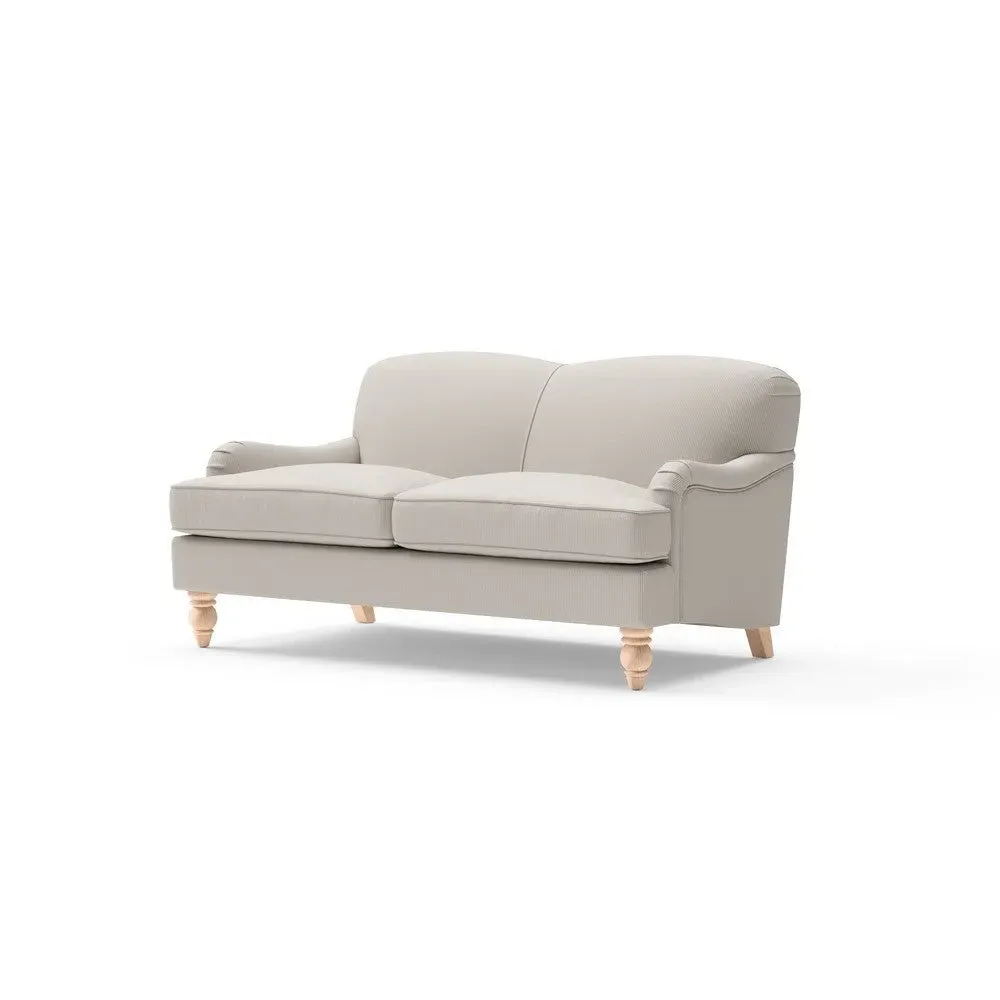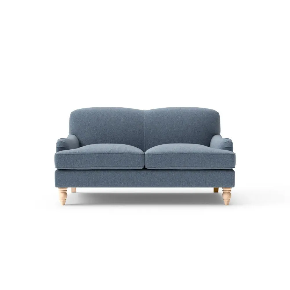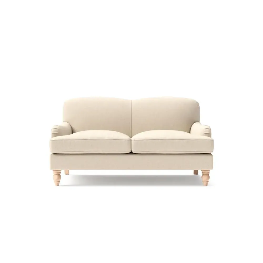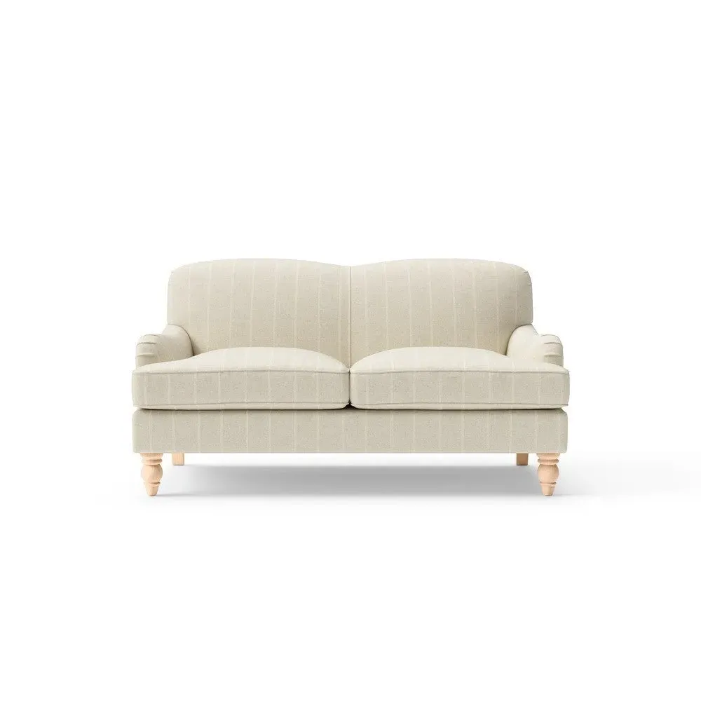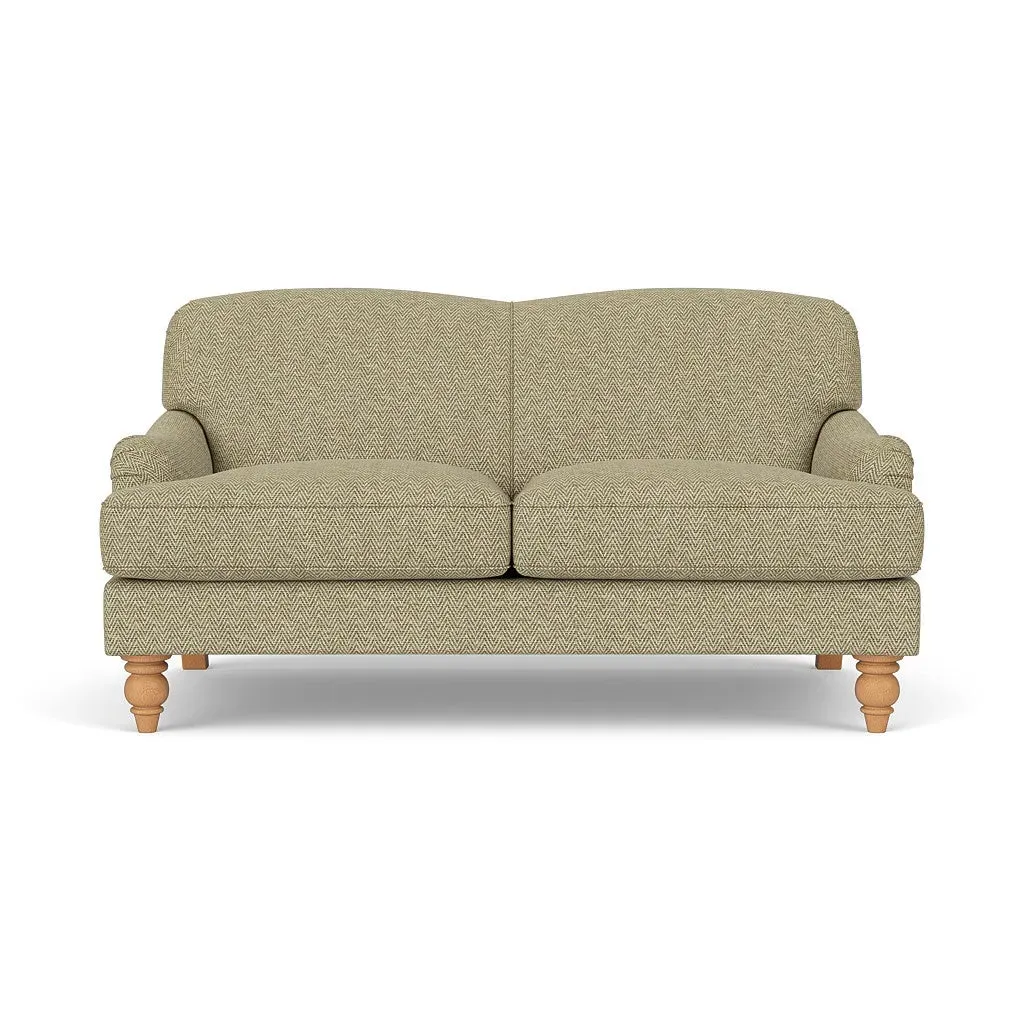 The sofa features a neatly tailored sprung back with gentle curves throughout its design. Its arm detail provides visual appeal, while the hand-turned feet add character and stability. The house weave fabric offers durability and texture, and the sprung back construction ensures comfortable support.