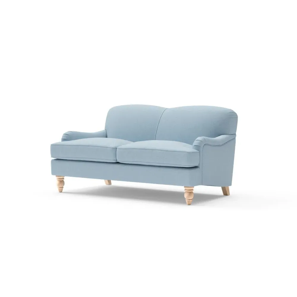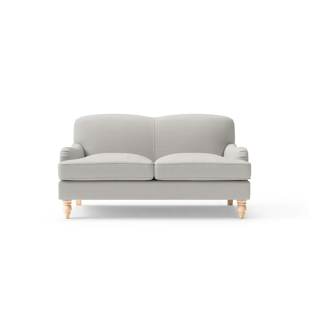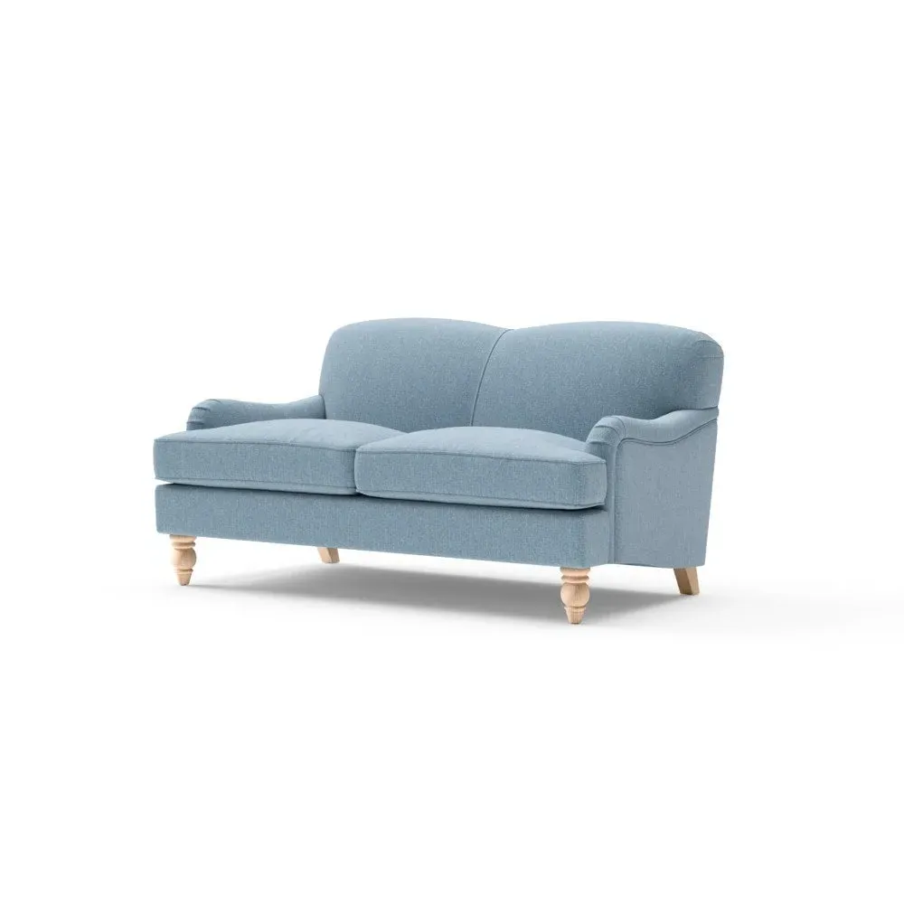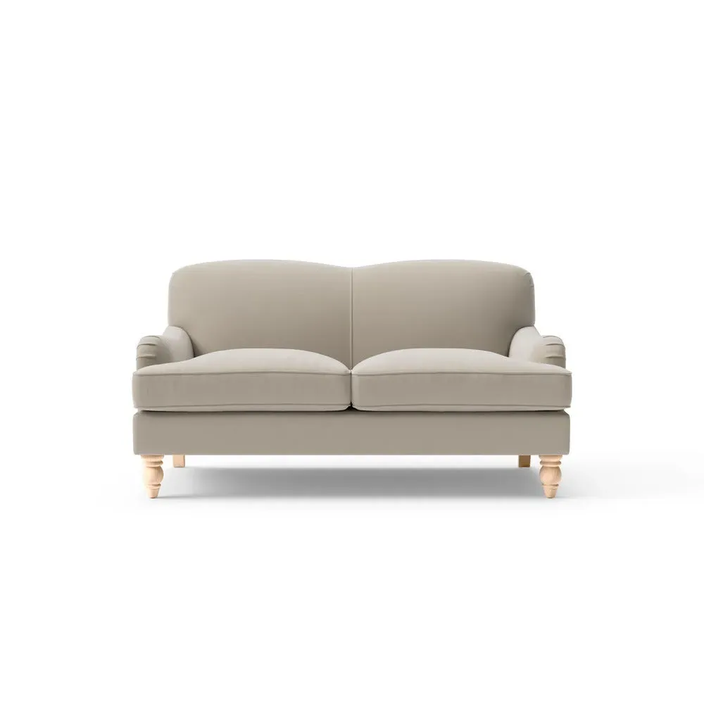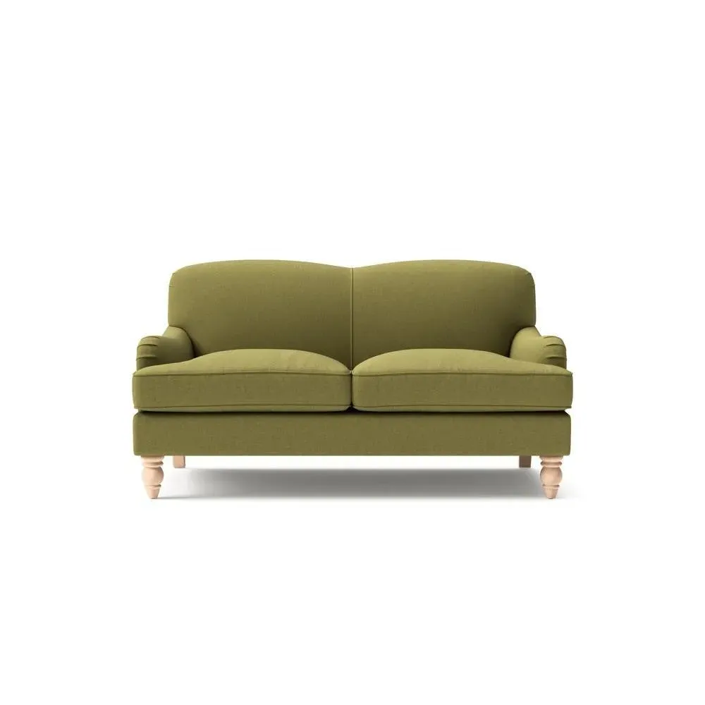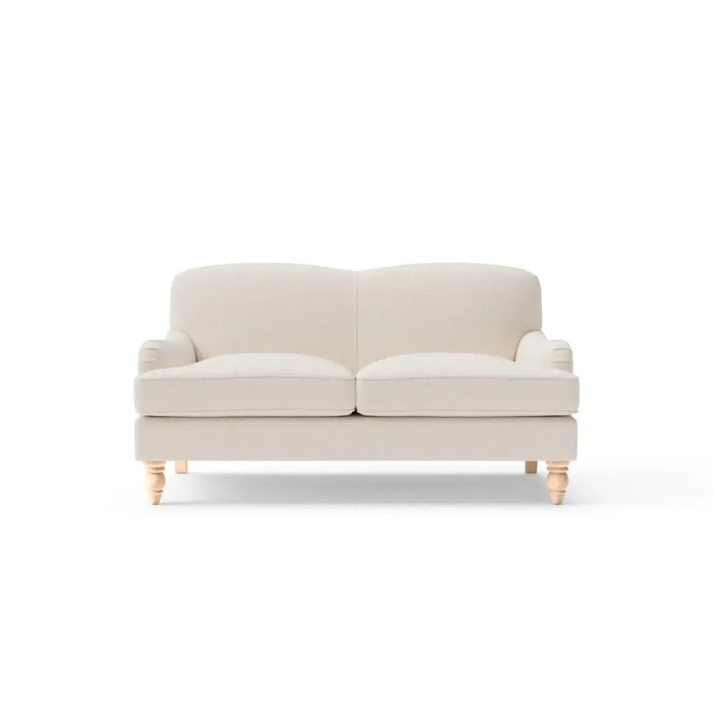 The sofa features a neatly tailored sprung back with gentle curves throughout its design. Its arm detail provides visual appeal, while the hand-turned feet add character and stability. The house weave fabric offers durability and texture, and the sprung back construction ensures comfortable support.