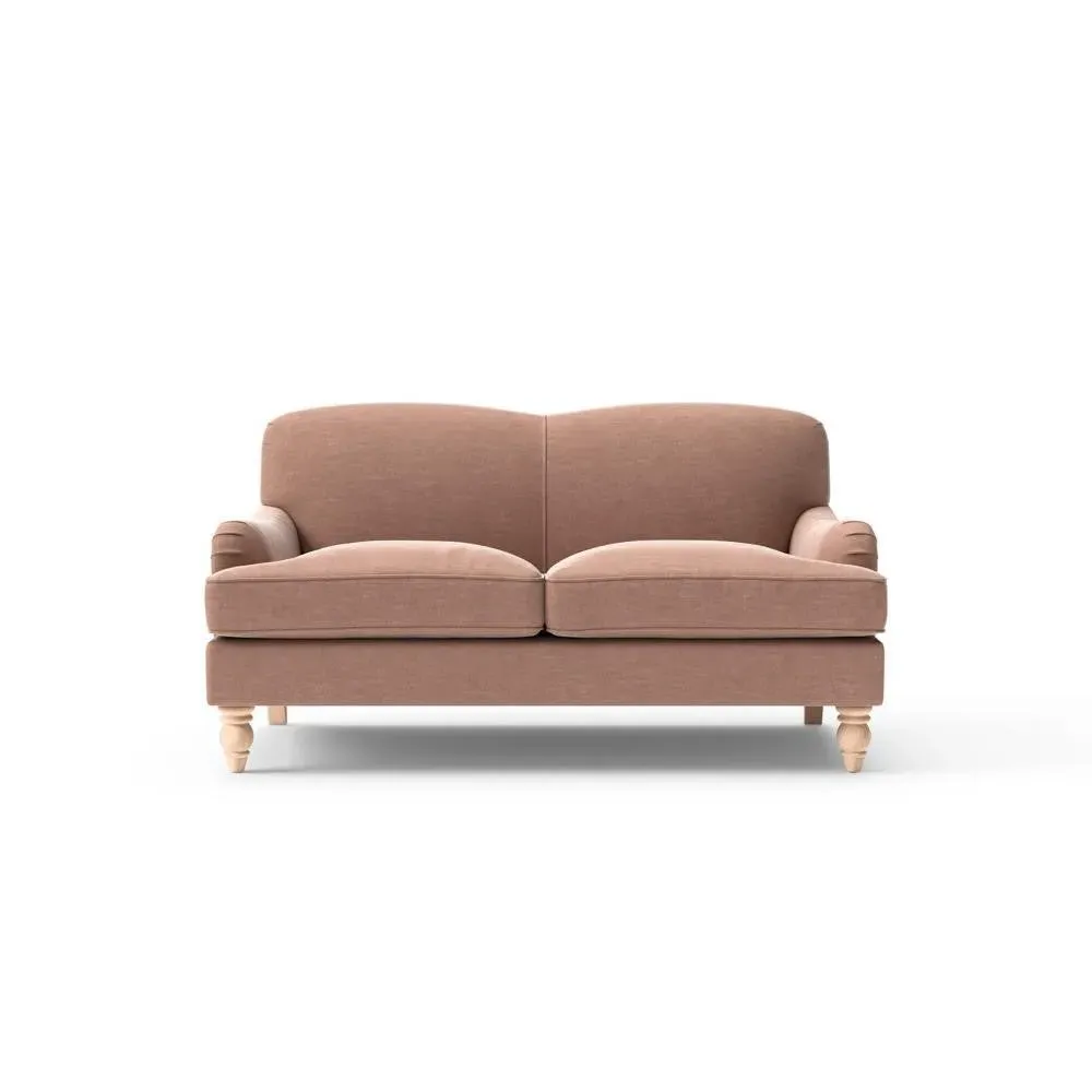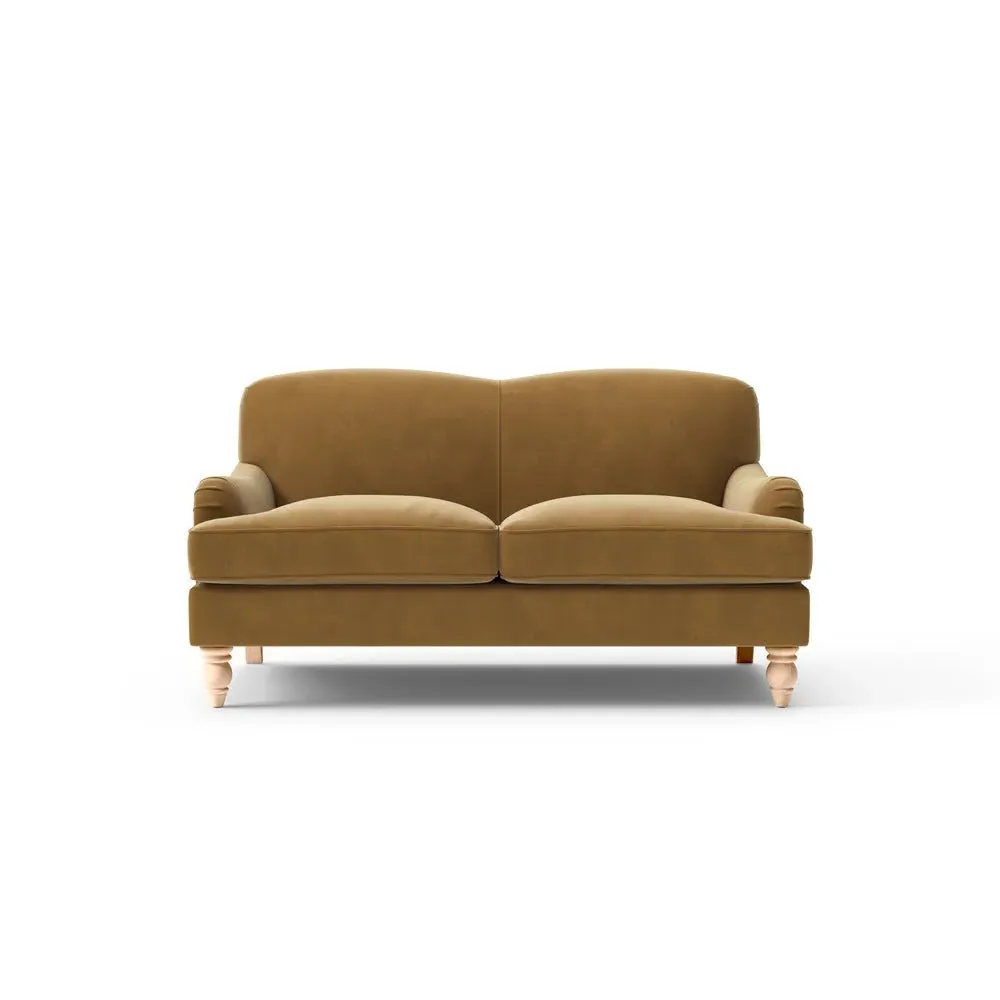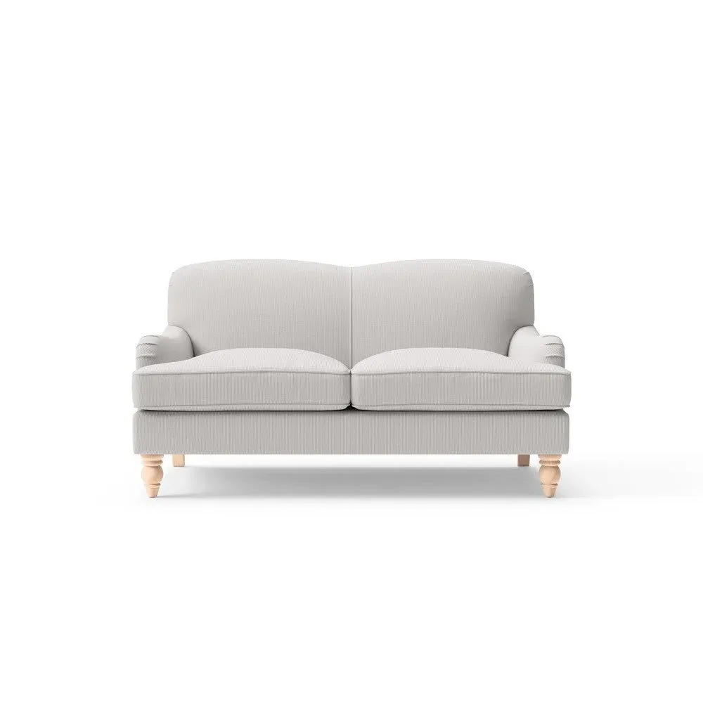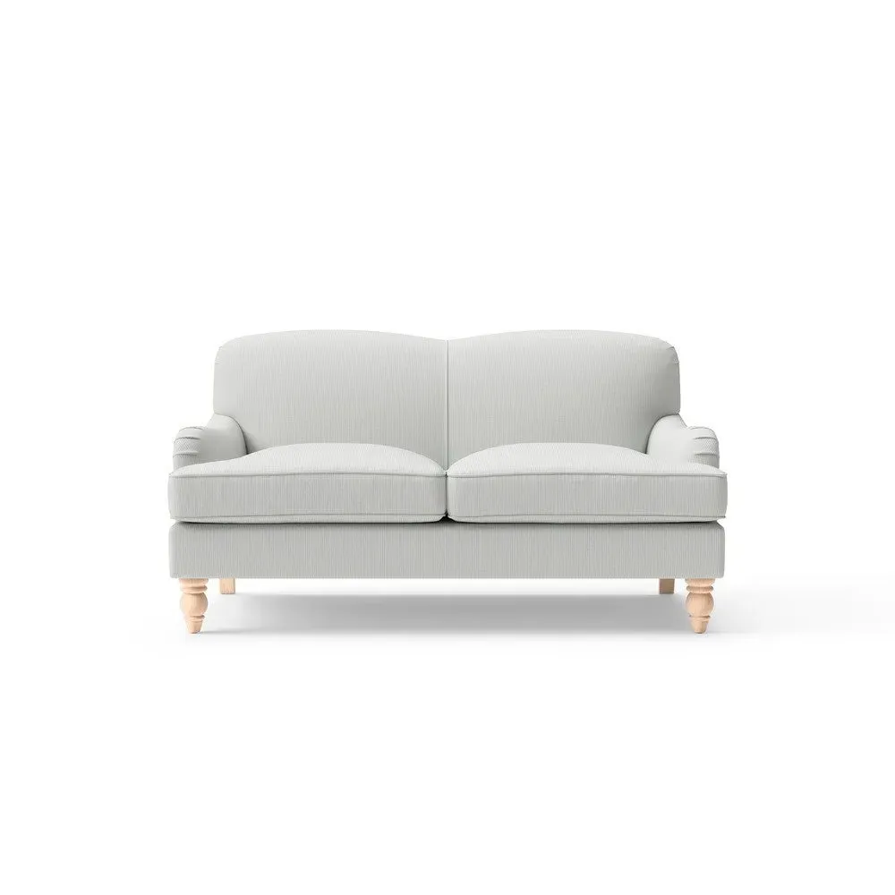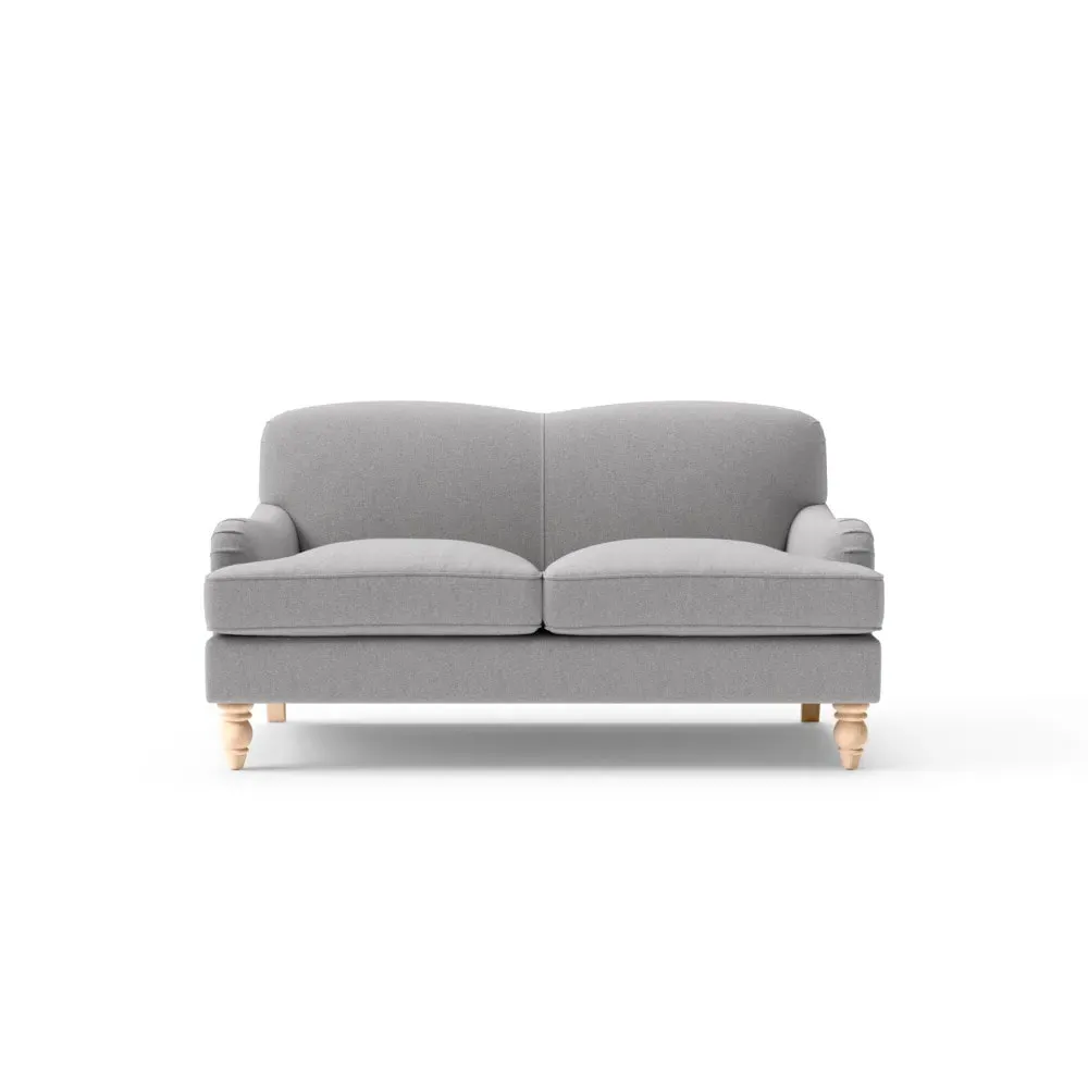 The sofa features a neatly tailored sprung back with gentle curves throughout its design. Its arm detail provides visual appeal, while the hand-turned feet add character and stability. The house weave fabric offers durability and texture, and the sprung back construction ensures comfortable support.