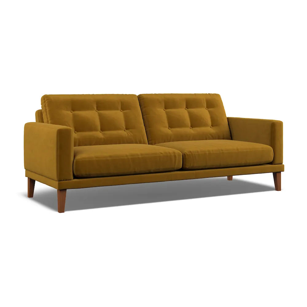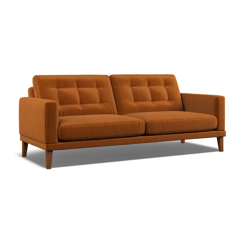 The Fitzroy 3-seater sofa combines mid-century design with button back detailing and tapered legs. Its hardwood frame is glued and screwed for robust construction, while the supportive back and armrests provide comfort. The eco velvet upholstery adds texture and durability, and the handcrafted UK construction ensures lasting quality. W196 x D100 x H86 cm