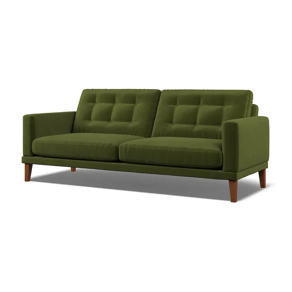 Our Fitzroy 3 seater sofa is perfect for any living space. With its mid-century look and feel, this contemporary seating range features tapered legs, button back detail, a supportive back and armrests and is ultra-comfortable. Made in the UK Skilfully produced by master upholsterers in UK using premium materials such as a hardwood frame, which has been glued and screwed for a robust build that will last the test of time. 10 Fabrics Available Each item is made to order and upholstered in your choice of either Bouclé (2 colours available) or Easy Clean Eco Velvet (8 colours available). Delivery Times Our Sofas and Armchairs are handmade to order in our UK factory. Once your order is confirmed you can expect delivery in 10-12 weeks. - Fitzroy 3-Seat Sofa In Hunter Eco Velvet by Atkin And Thyme, H86 x W196 x D100 cm