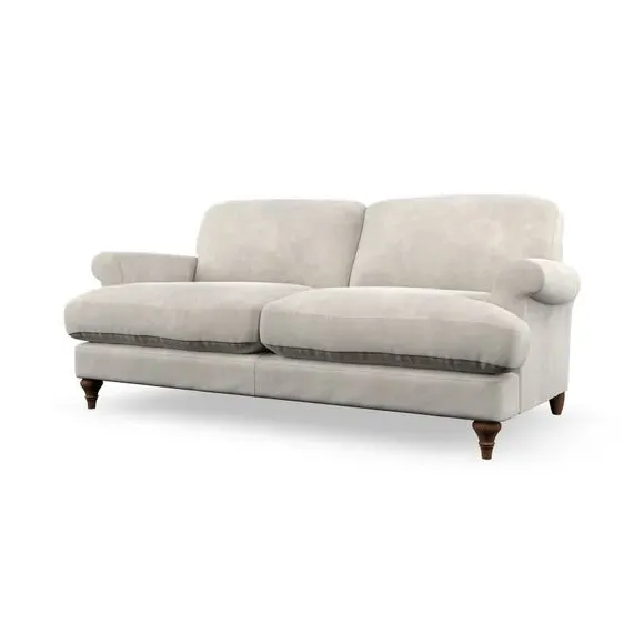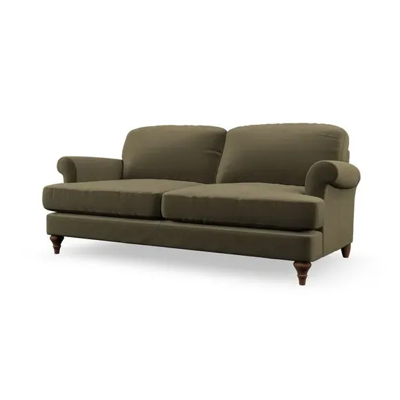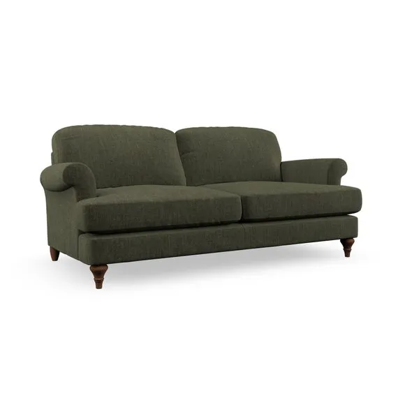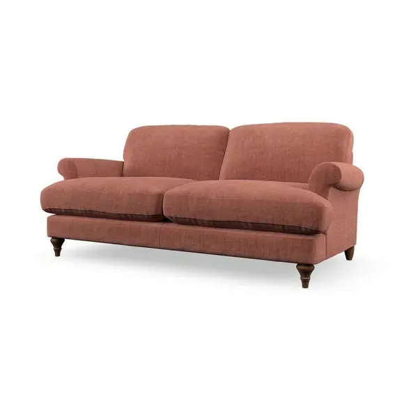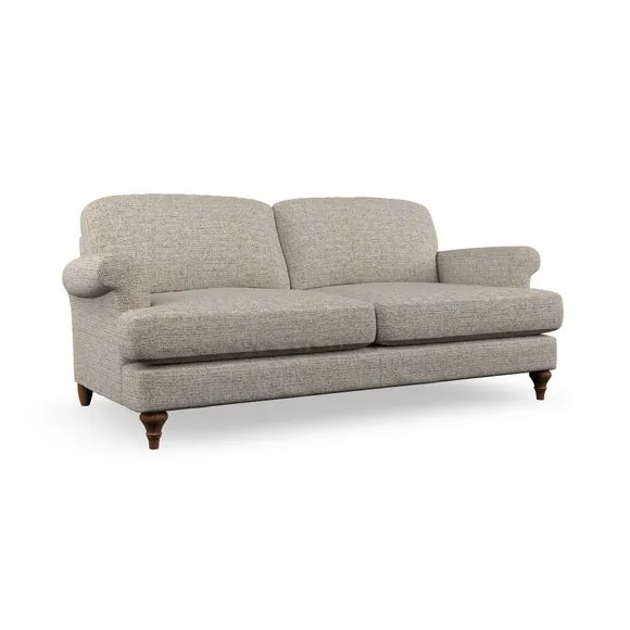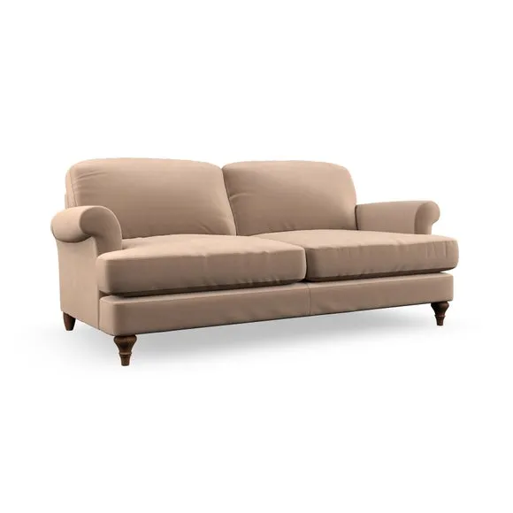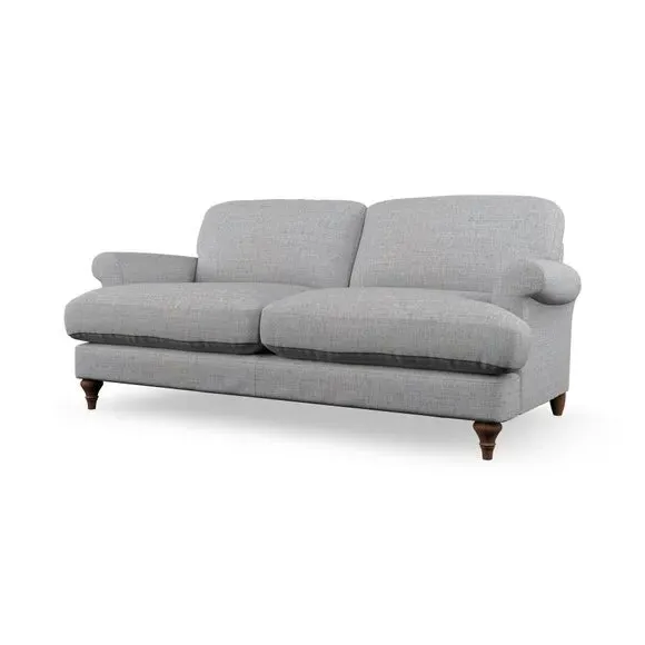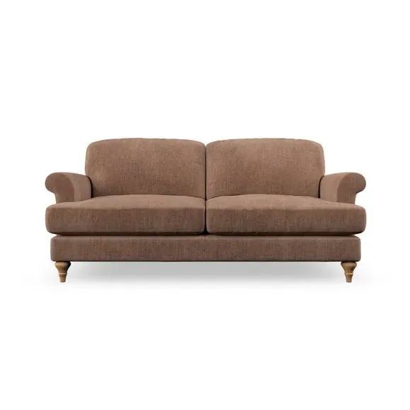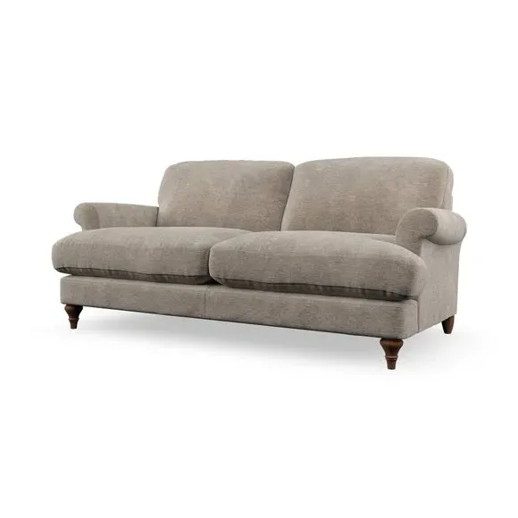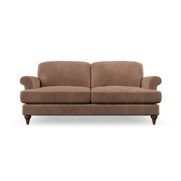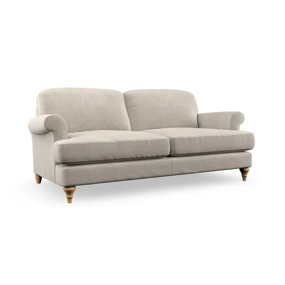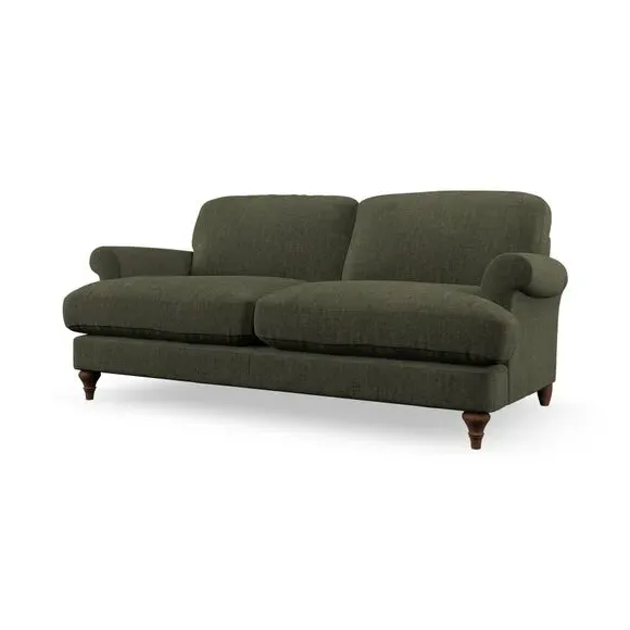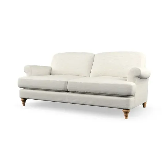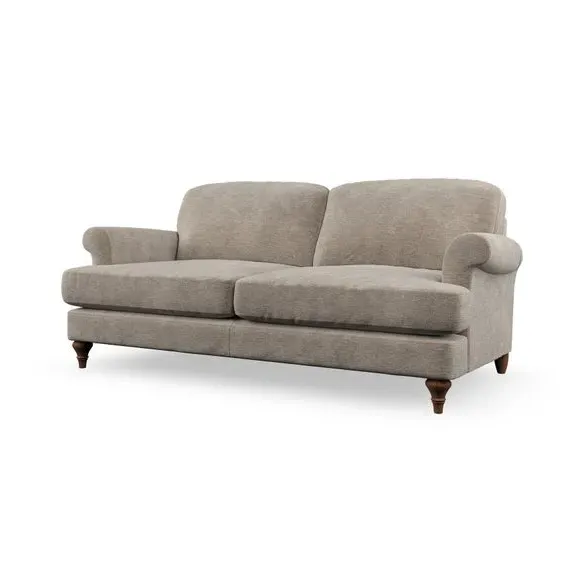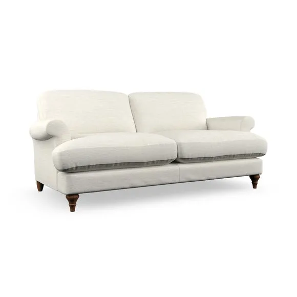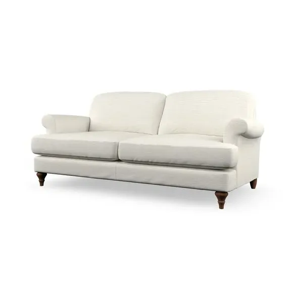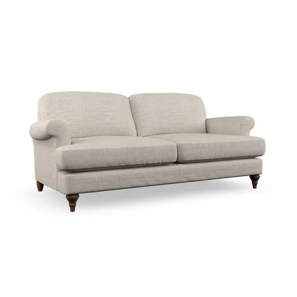 The sofa offers classic comfort with its elegant scroll arms and lugged seat cushions. Serpentine seat springs provide reliable support, while fibre-filled back cushions add softness for daily use. The refined design combines practicality with timeless appeal, and customizable fabric and leg options allow personal styling.