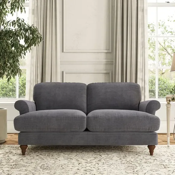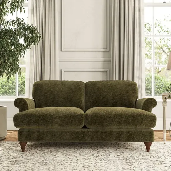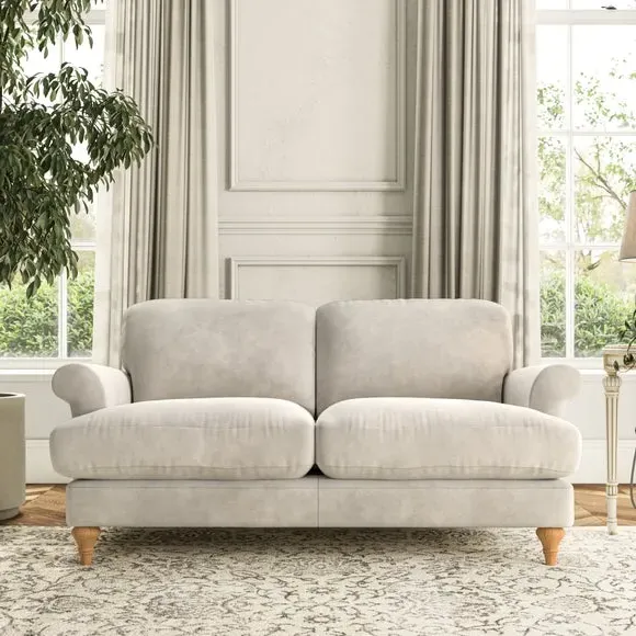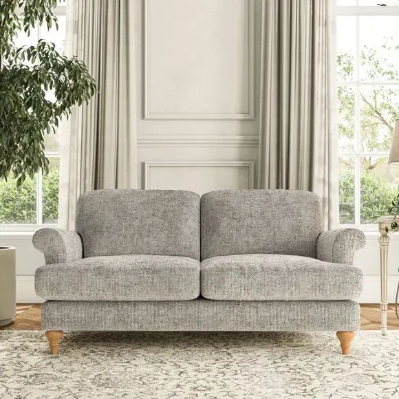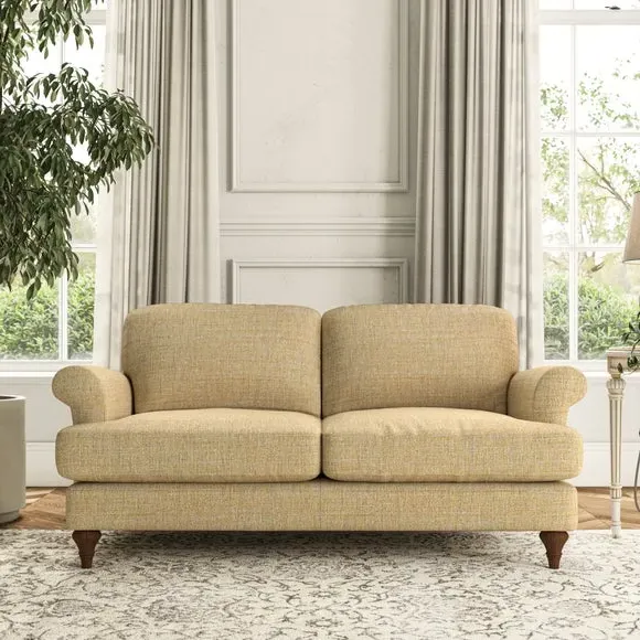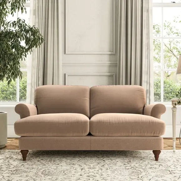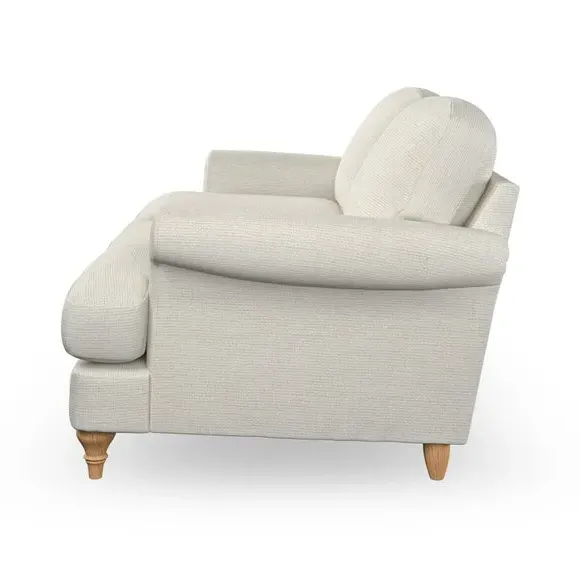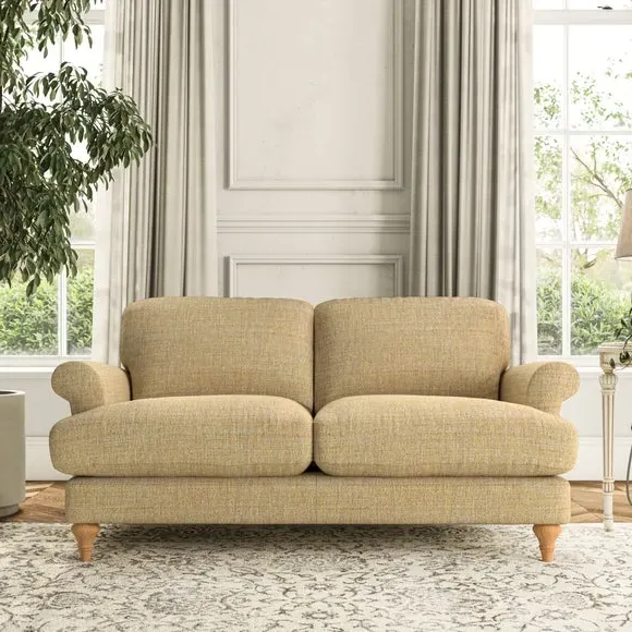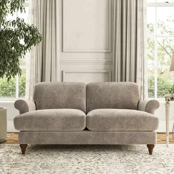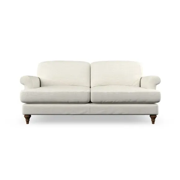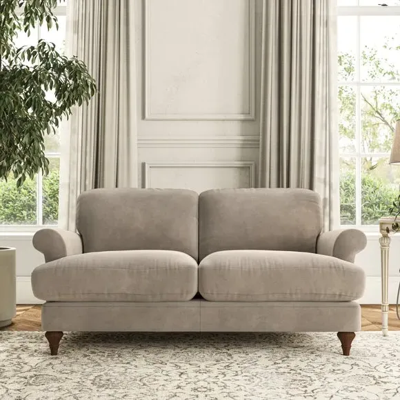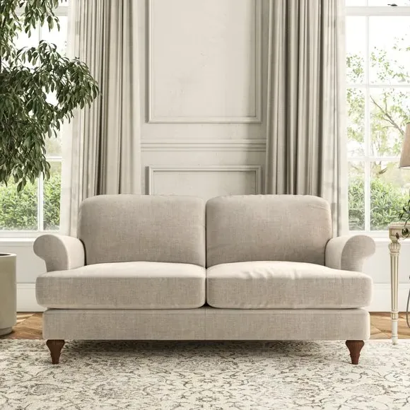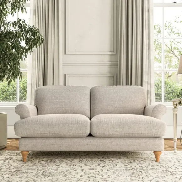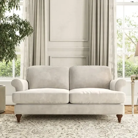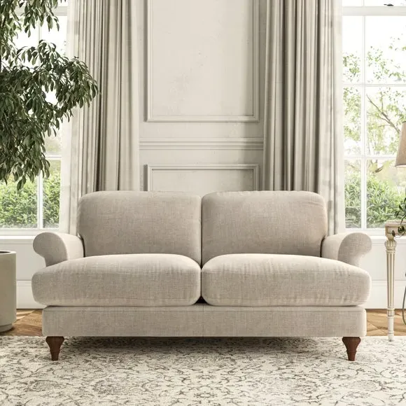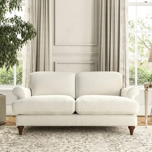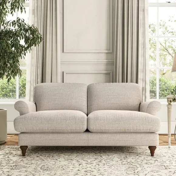 * Elegant, classic design* Scroll Arms* Lugged seat cushion* Serpentine seat springs* Choose your orientation, support, fabric and leg colour The Evie Large 2 Seater Sofa offers a comfortable and refined seating solution for more compact spaces. With its slim scroll arms and neat lugged seat cushions, this sofa combines practicality with a classic design. The fibre-filled back cushions add a soft yet supportive feel, perfect for everyday lounging. Choose your preferred fabric, colour, cushion filling, and leg finish to make this piece truly your own.
