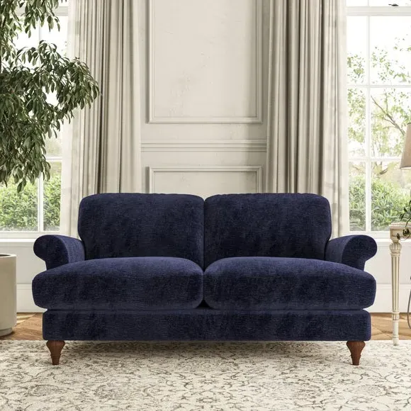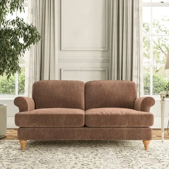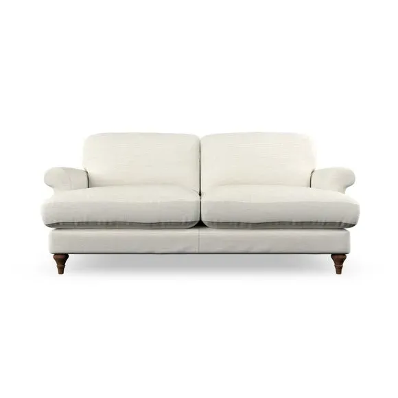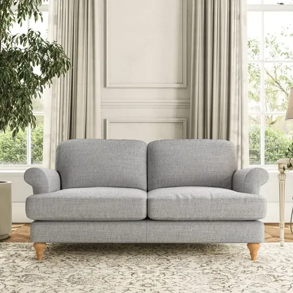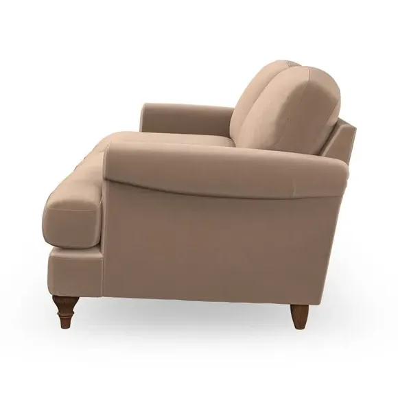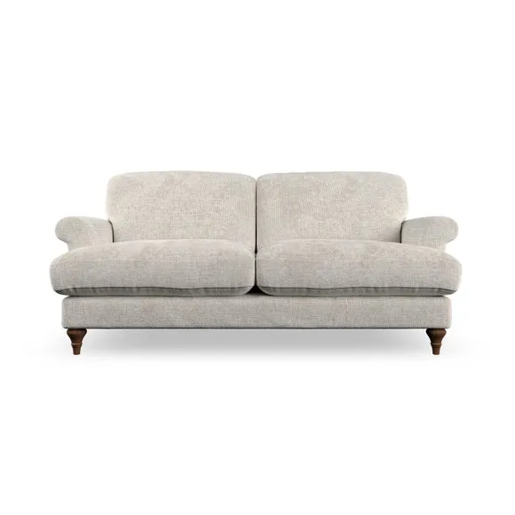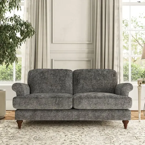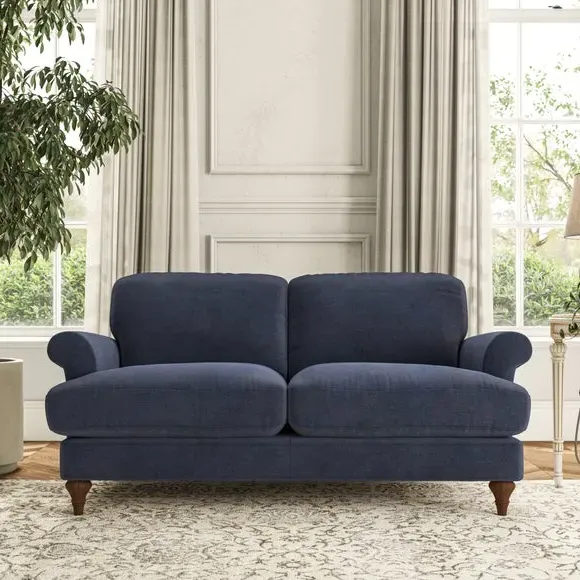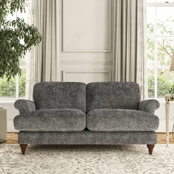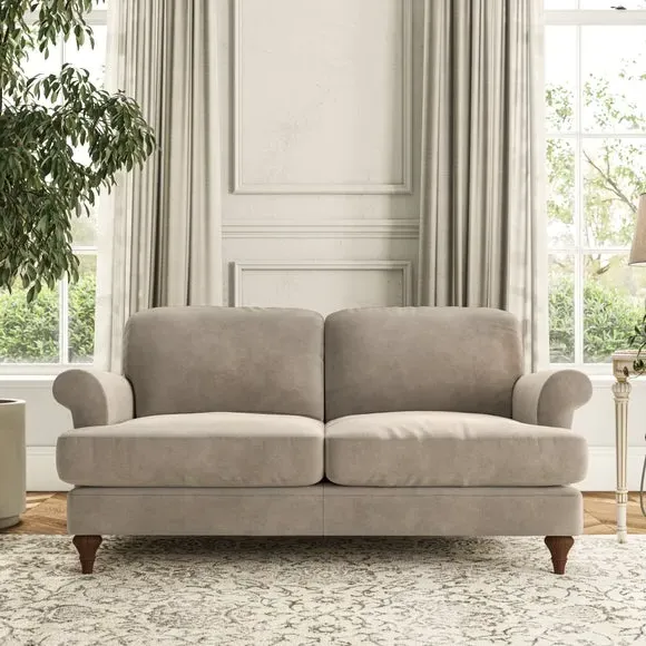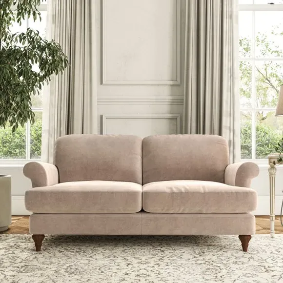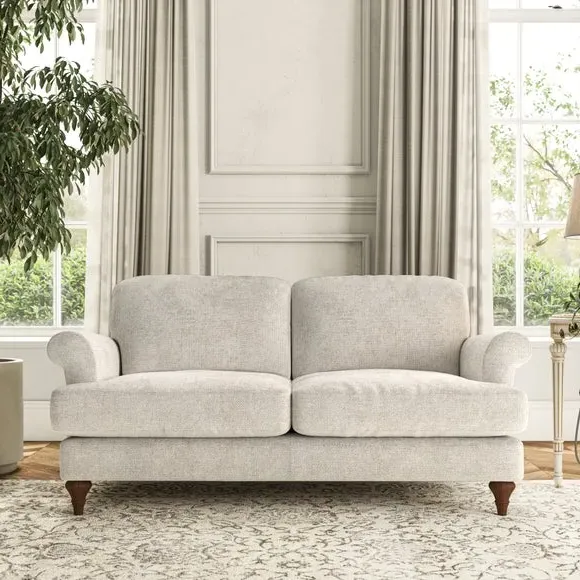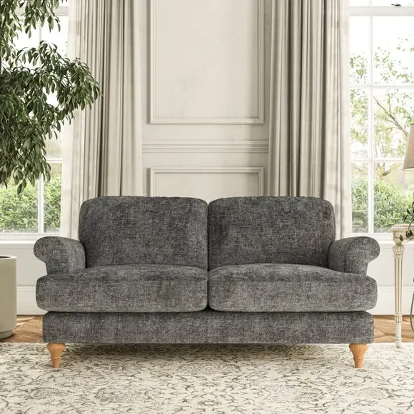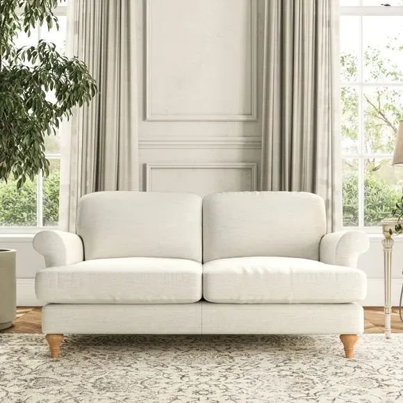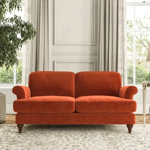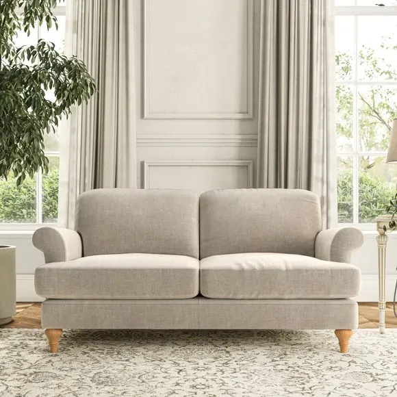 * Elegant, classic design* Scroll Arms* Lugged seat cushion* Serpentine seat springs* Choose your orientation, support, fabric and leg colour The Evie Large 2 Seater Sofa offers a comfortable and refined seating solution for more compact spaces. With its slim scroll arms and neat lugged seat cushions, this sofa combines practicality with a classic design. The fibre-filled back cushions add a soft yet supportive feel, perfect for everyday lounging. Choose your preferred fabric, colour, cushion filling, and leg finish to make this piece truly your own.