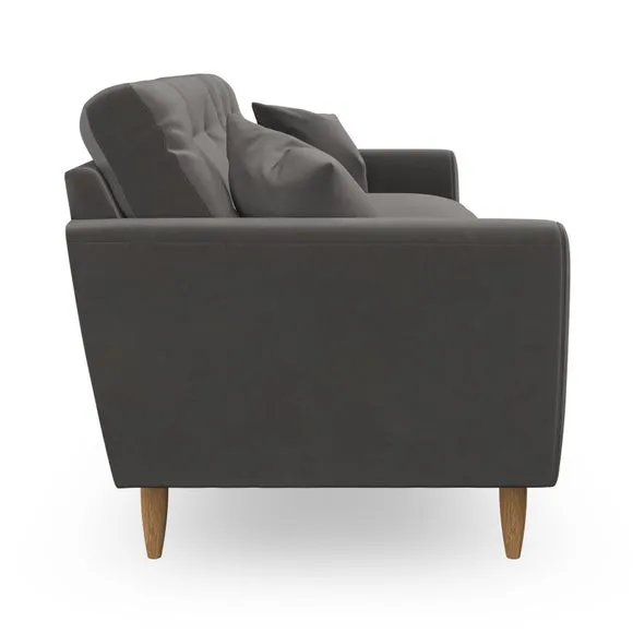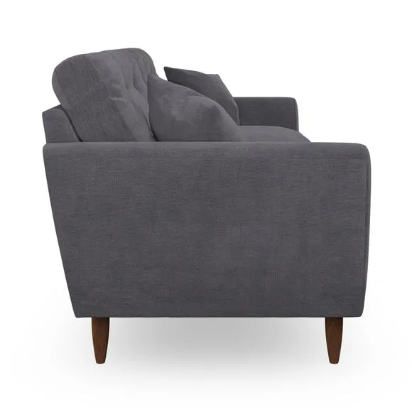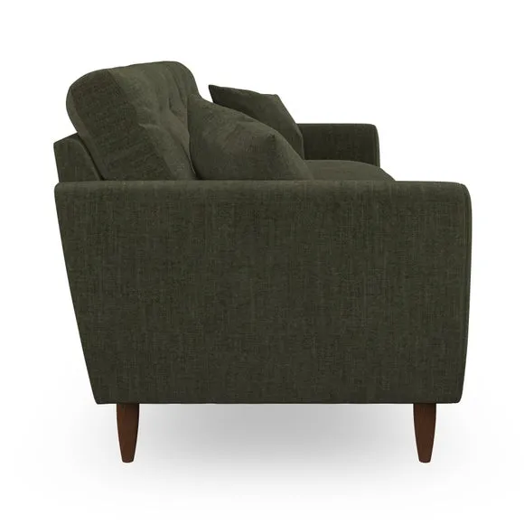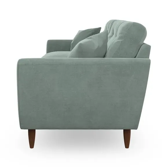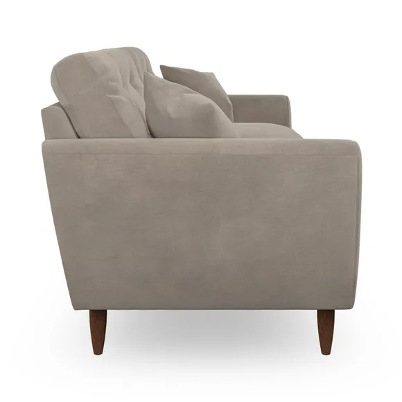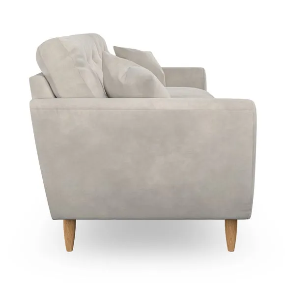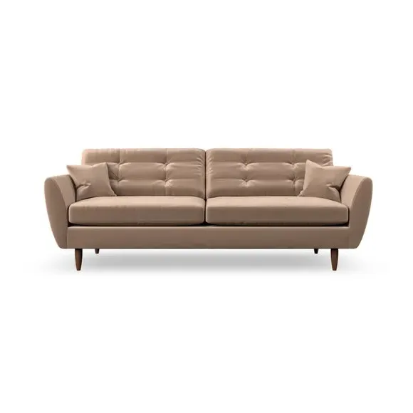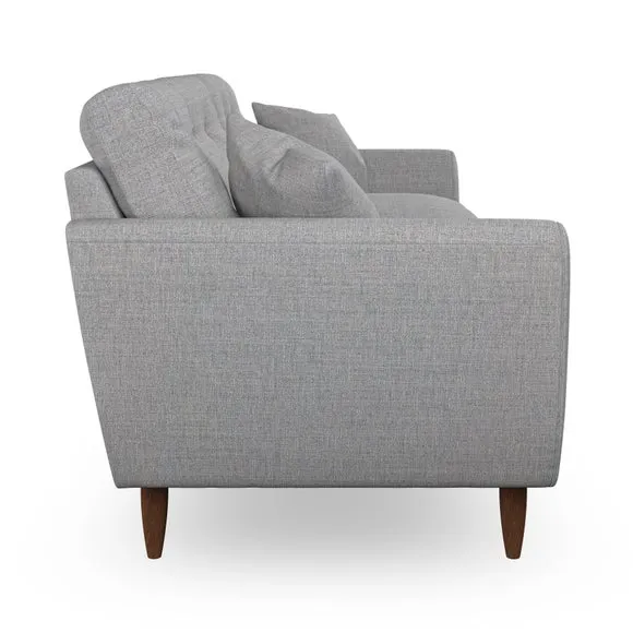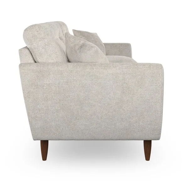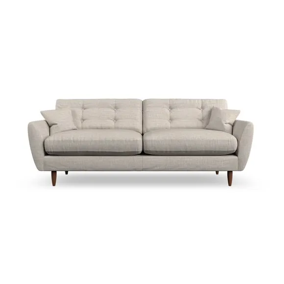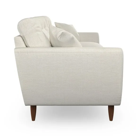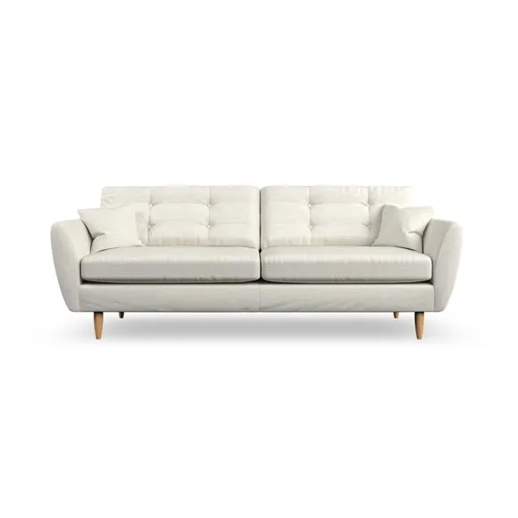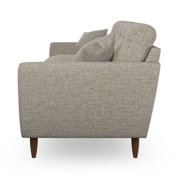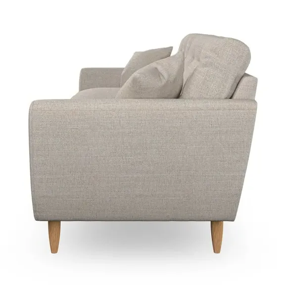 The sofa combines Scandinavian design with spacious comfort through its tear-drop shaped arms and fibre-filled scatter cushions. Its serpentine seat springs provide reliable support, while the top-stitched arm details add refined craftsmanship. The fibre-filled back cushions feature double-row button pull detailing for both comfort and visual appeal, and the hardwood legs complete the stylish construction.