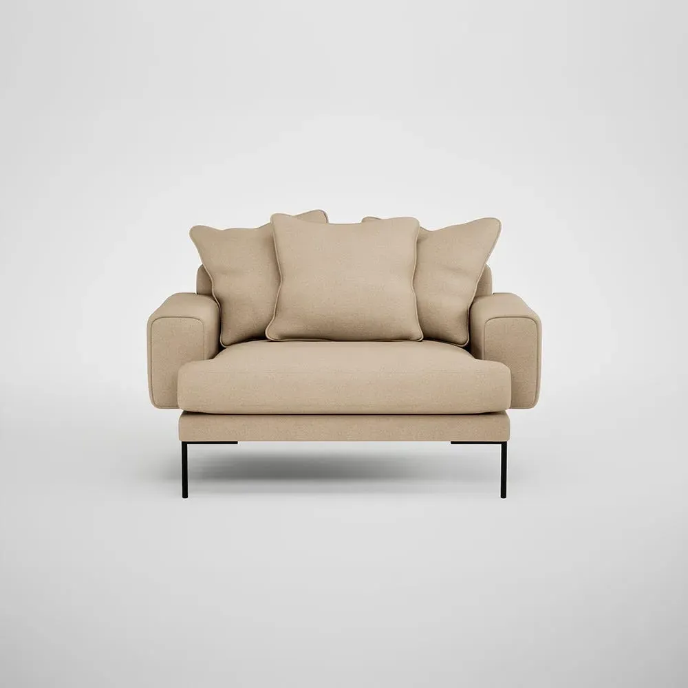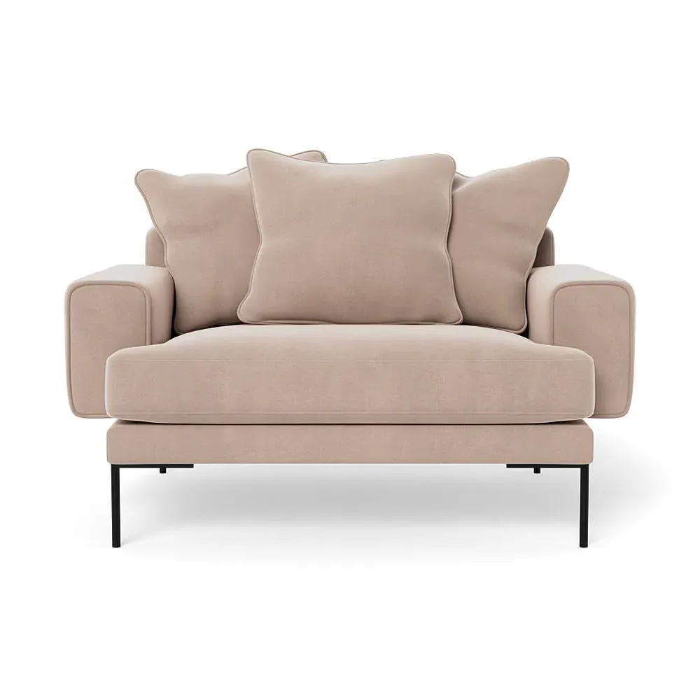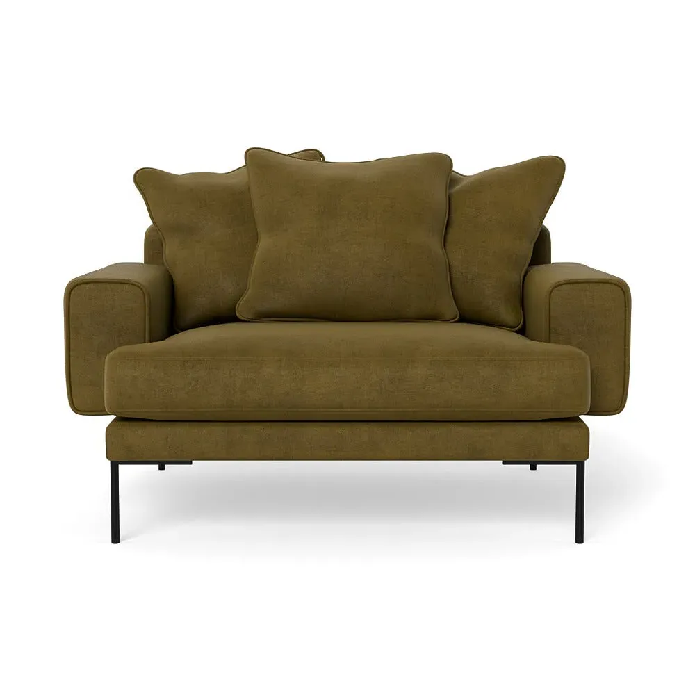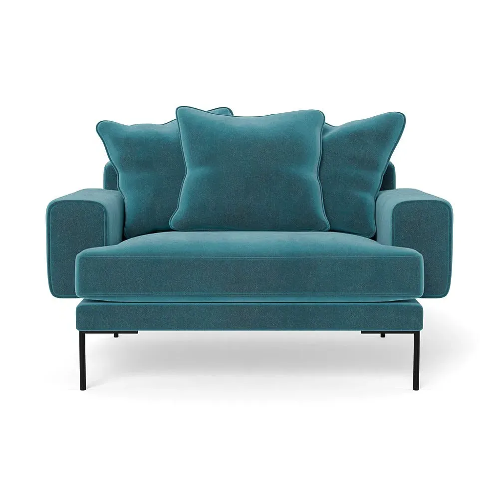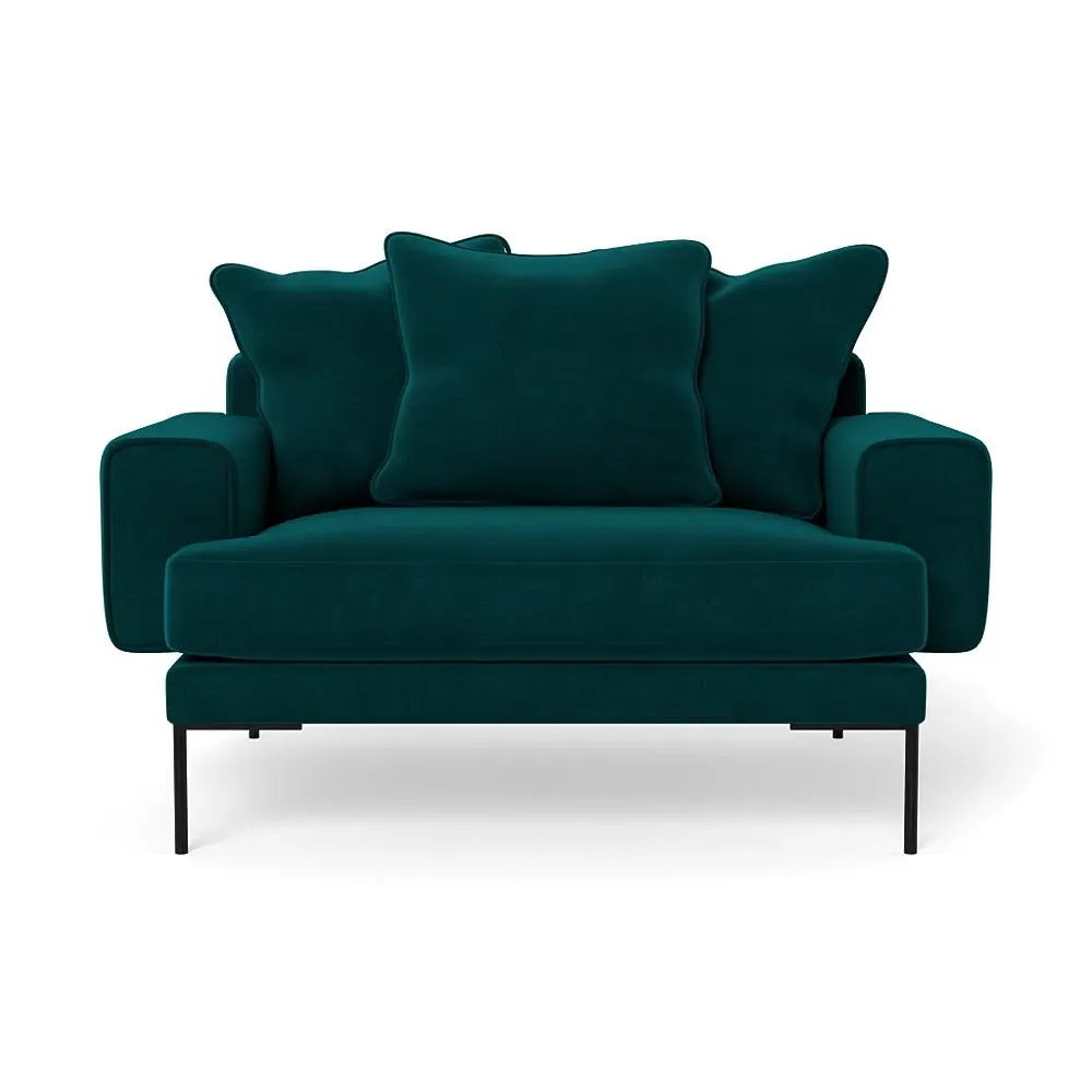 The loveseat combines comfort with its plush brushed cotton upholstery, featuring a rich pine green finish. Its cozy two-seater design provides intimate seating, while the black feet add modern contrast. The brushed cotton fabric offers enhanced softness and warmth, and the solid frame ensures reliable support.