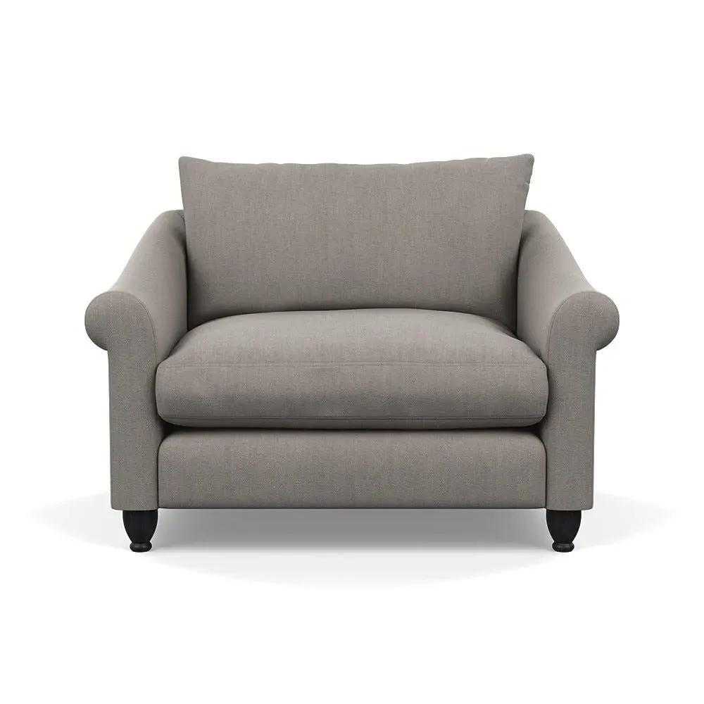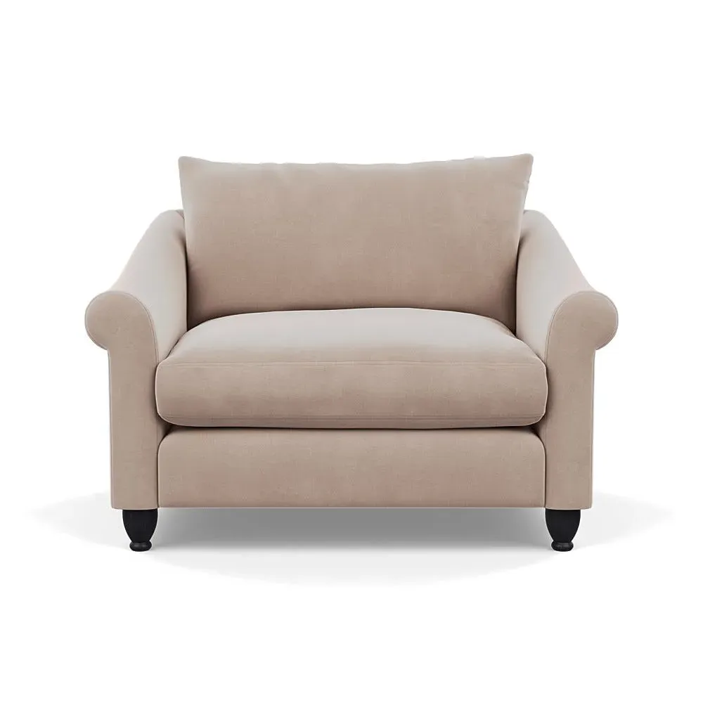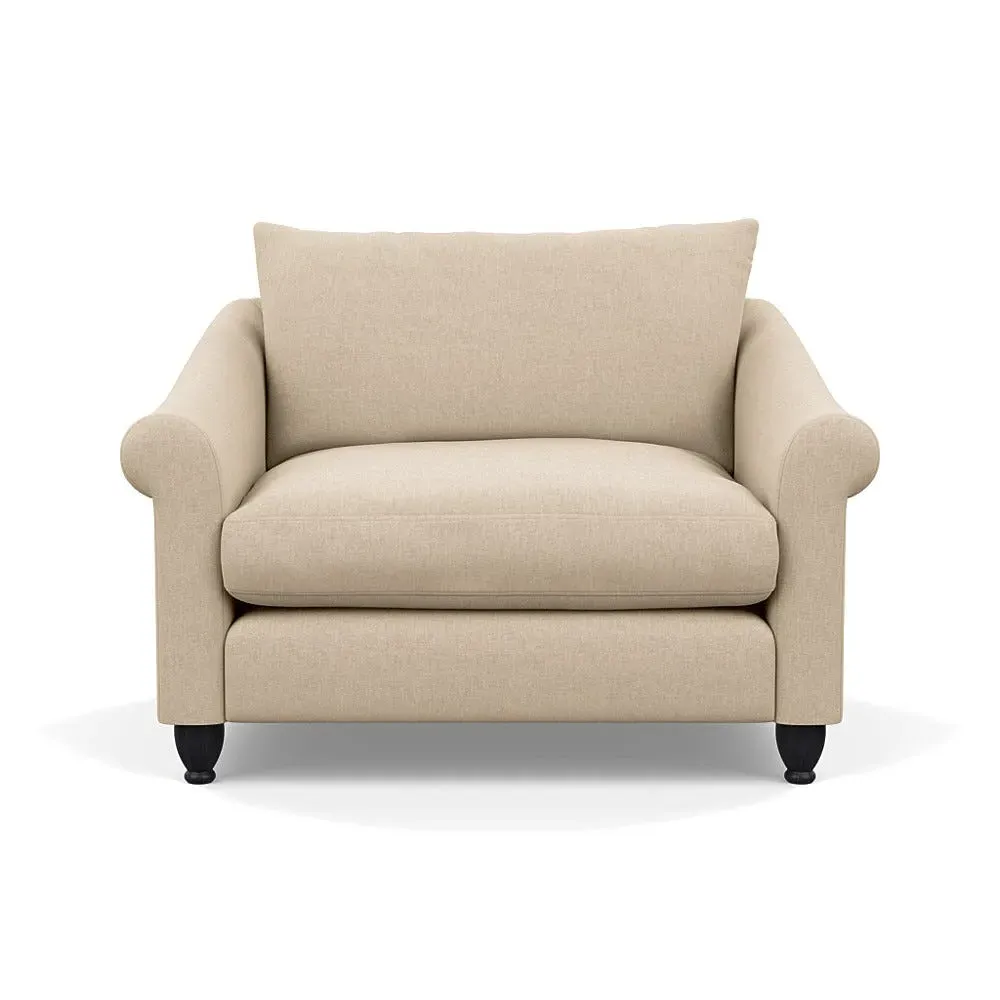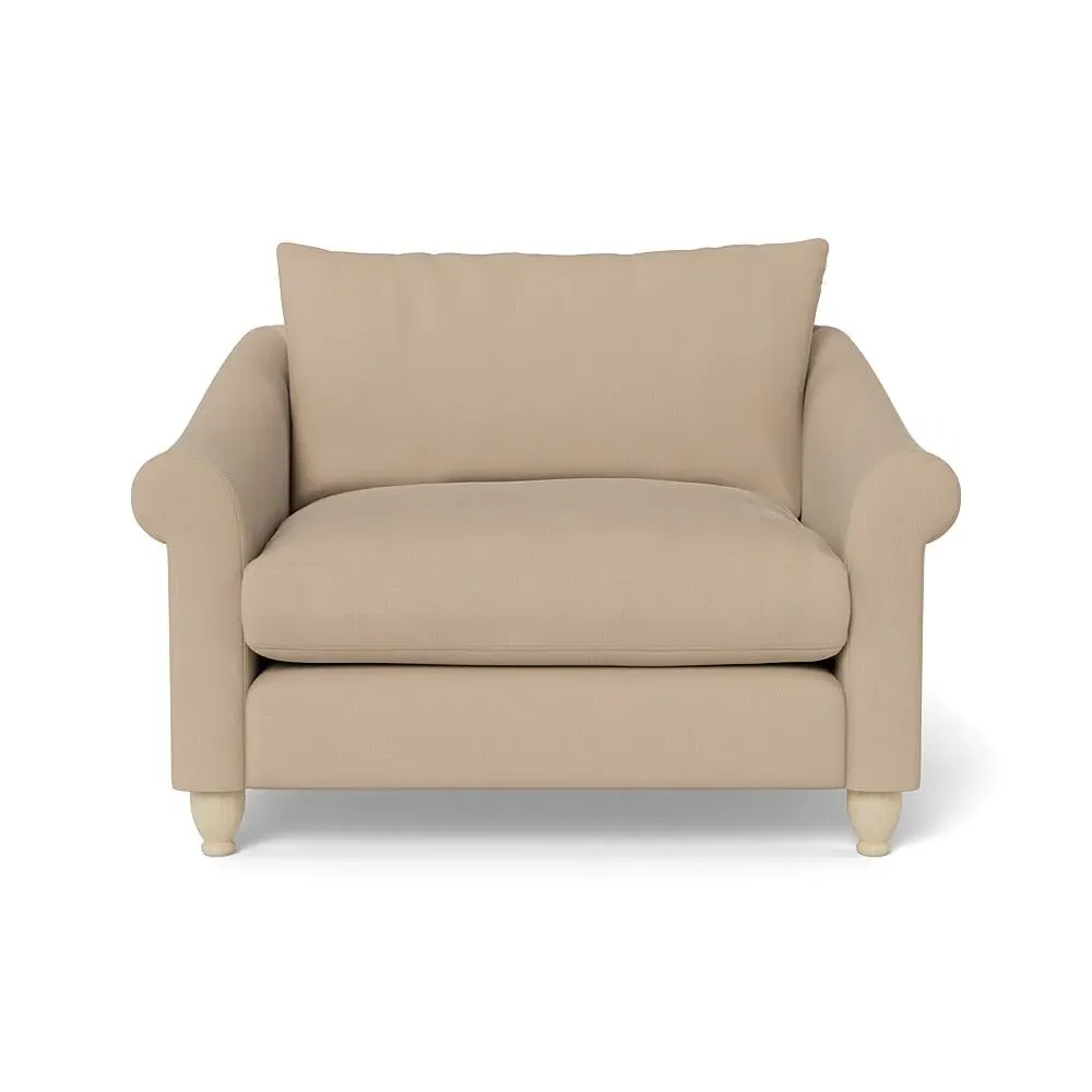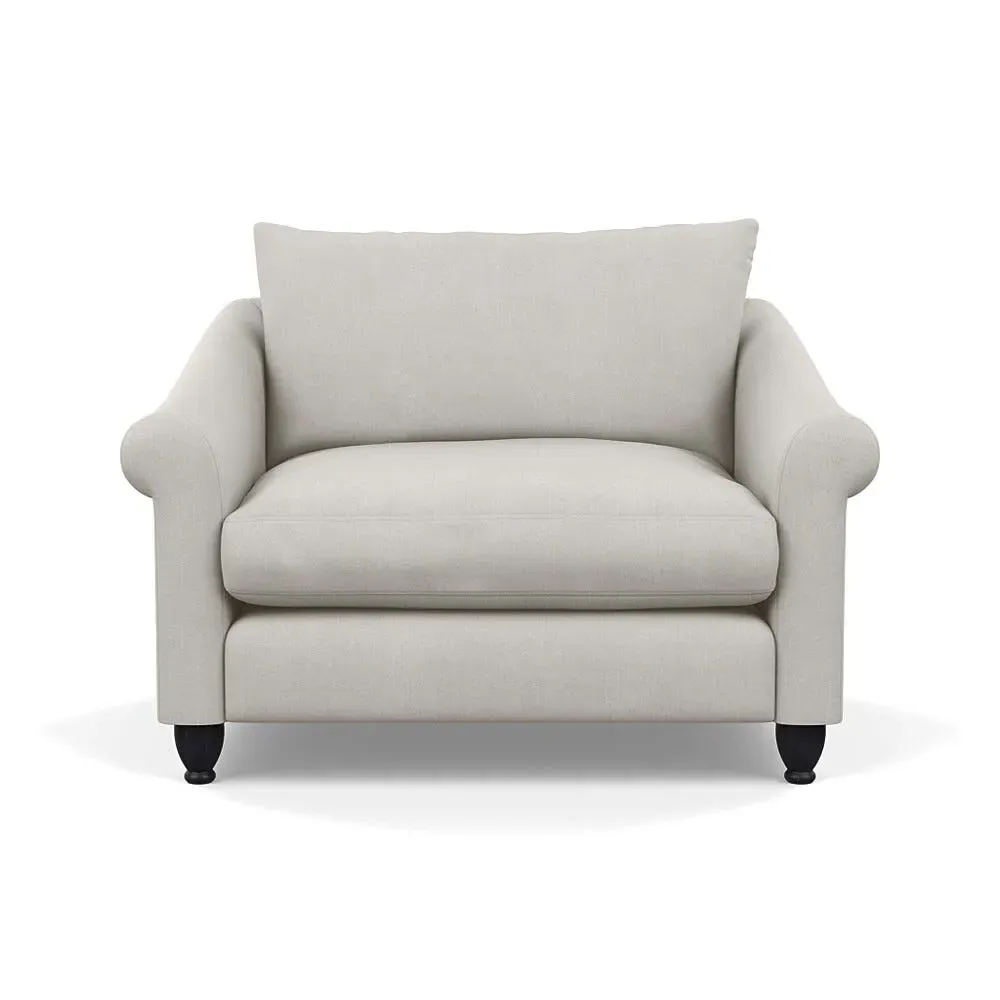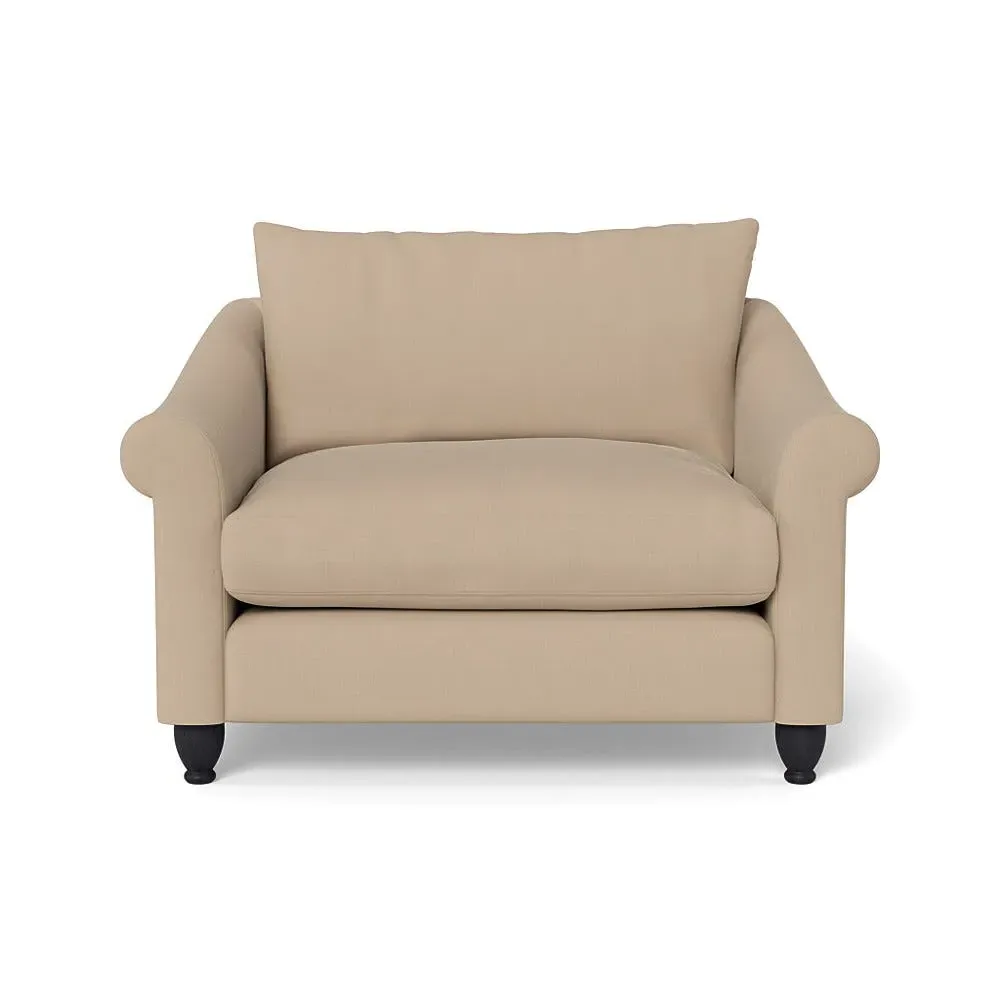 The loveseat provides comfortable seating with its brushed cotton upholstery, supported by black-stained beech feet. Its compact two-seater design offers intimate seating, while the durable cotton construction adds lasting quality. The sturdy frame ensures reliable support for daily use.