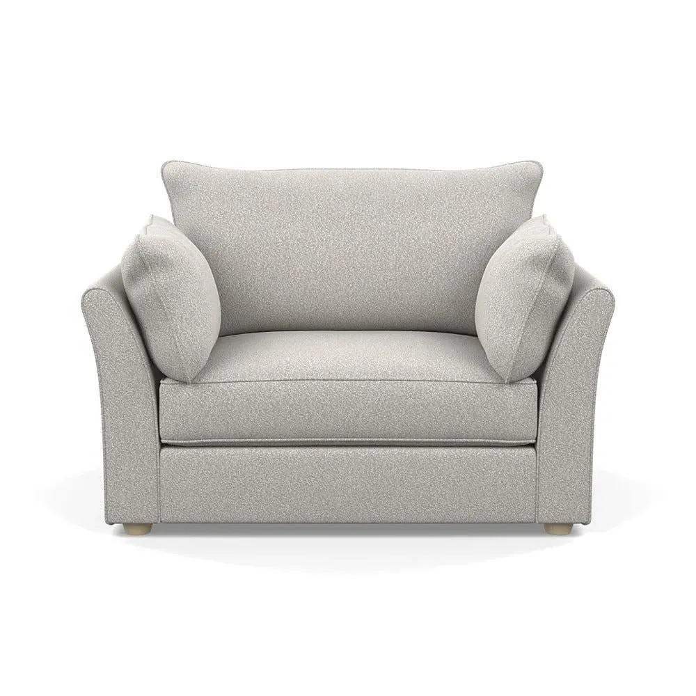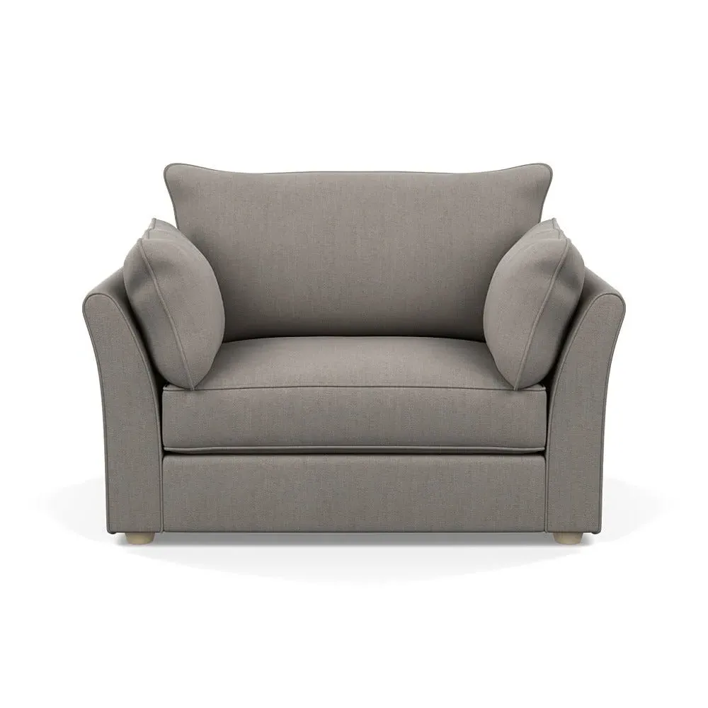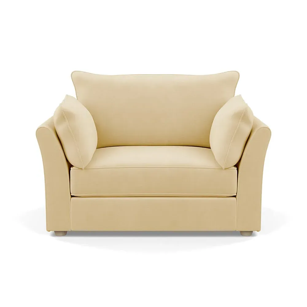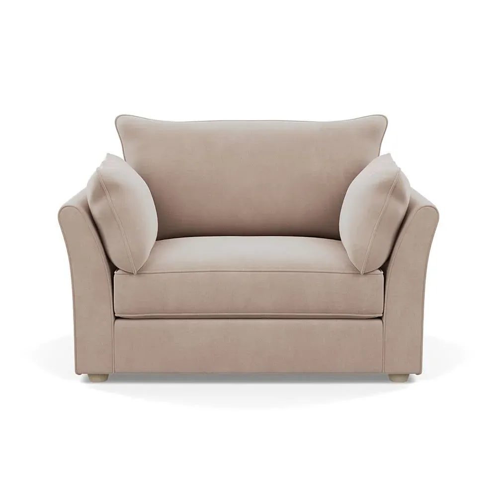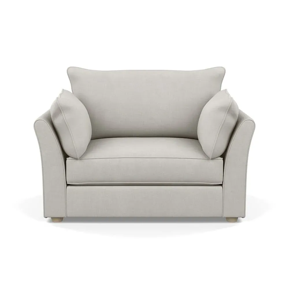 The loveseat offers refined comfort with its soft brushed cotton upholstery in a warm oat tone. Its tailored design provides structured support, while the natural beech feet add warmth and stability. The compact two-seater frame suits intimate seating arrangements, and the solid wood legs ensure lasting durability.
