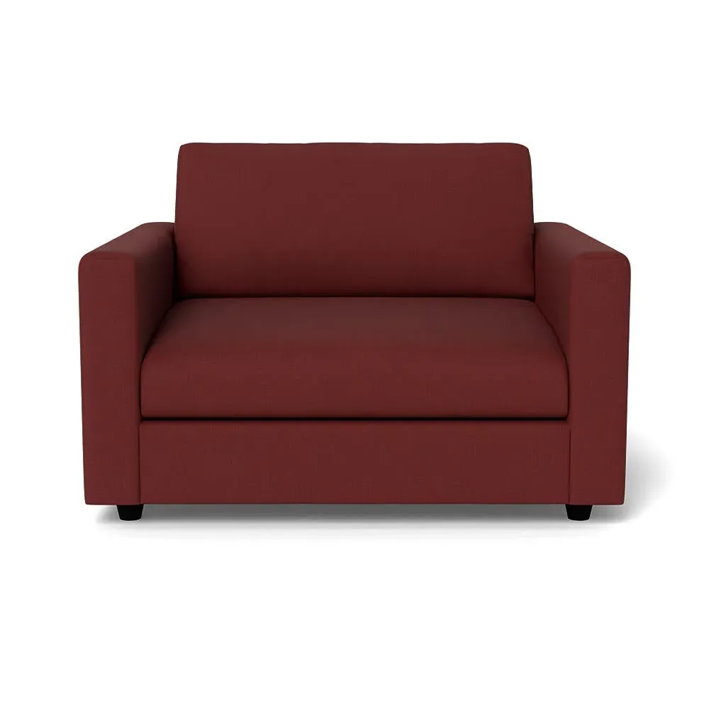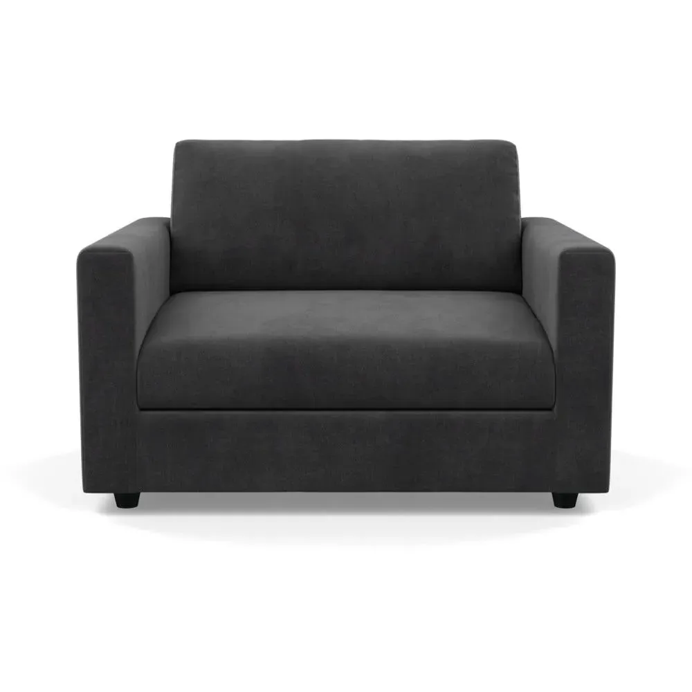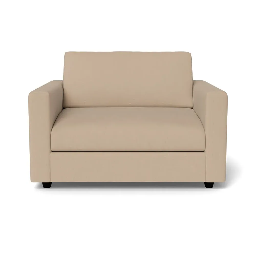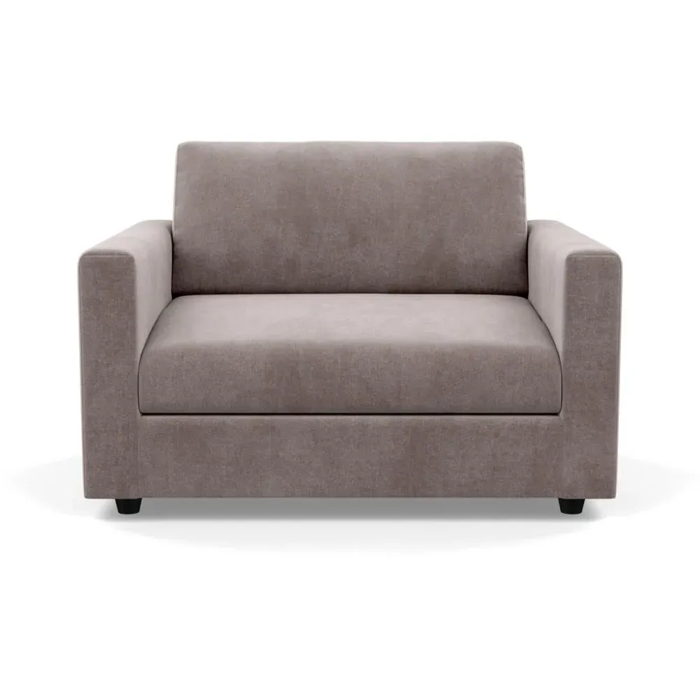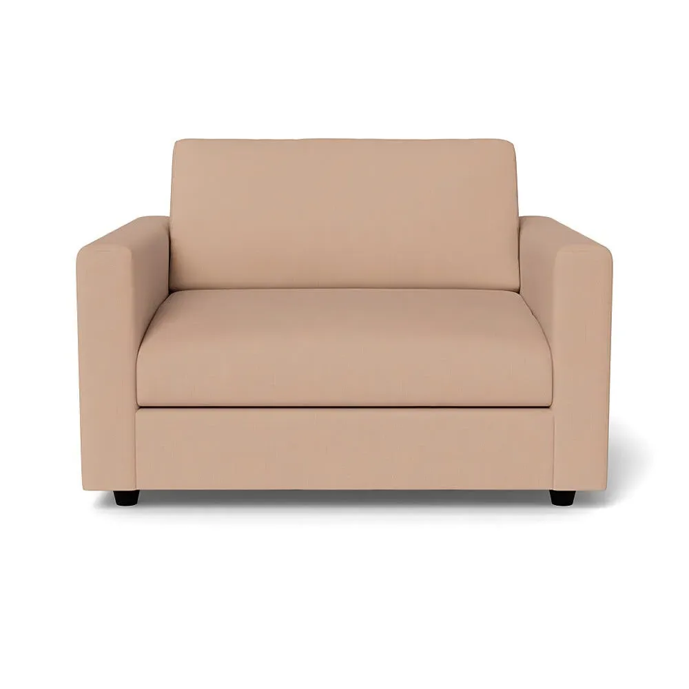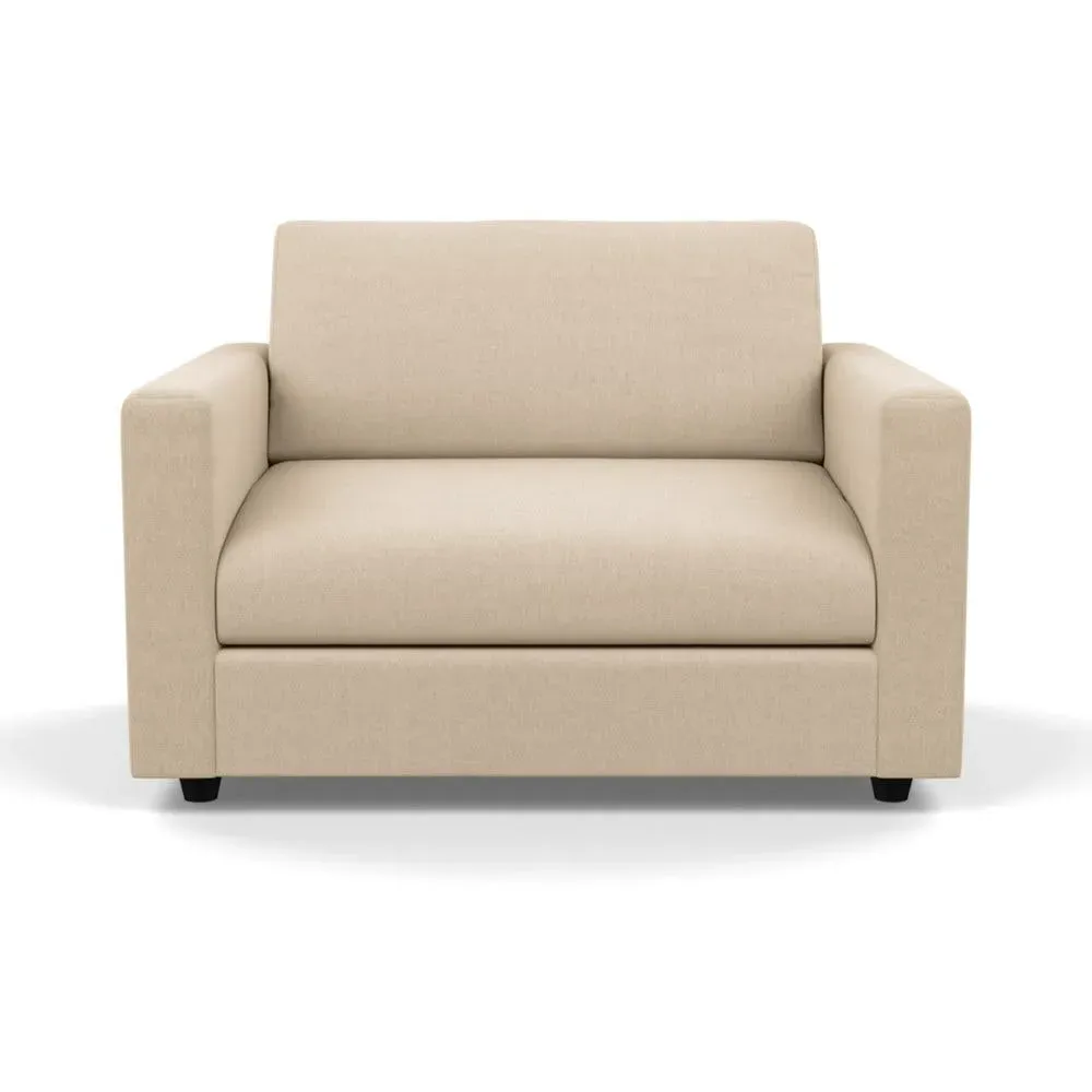 The loveseat offers generous proportions with its deep, low seating design and oversized cushions. Its feather and fibre foam seat cushions provide luxurious comfort, while the soft fibre-filled back cushions add plush support. The clean lines feature neat upholstery construction, and the black feet ensure stable foundation.