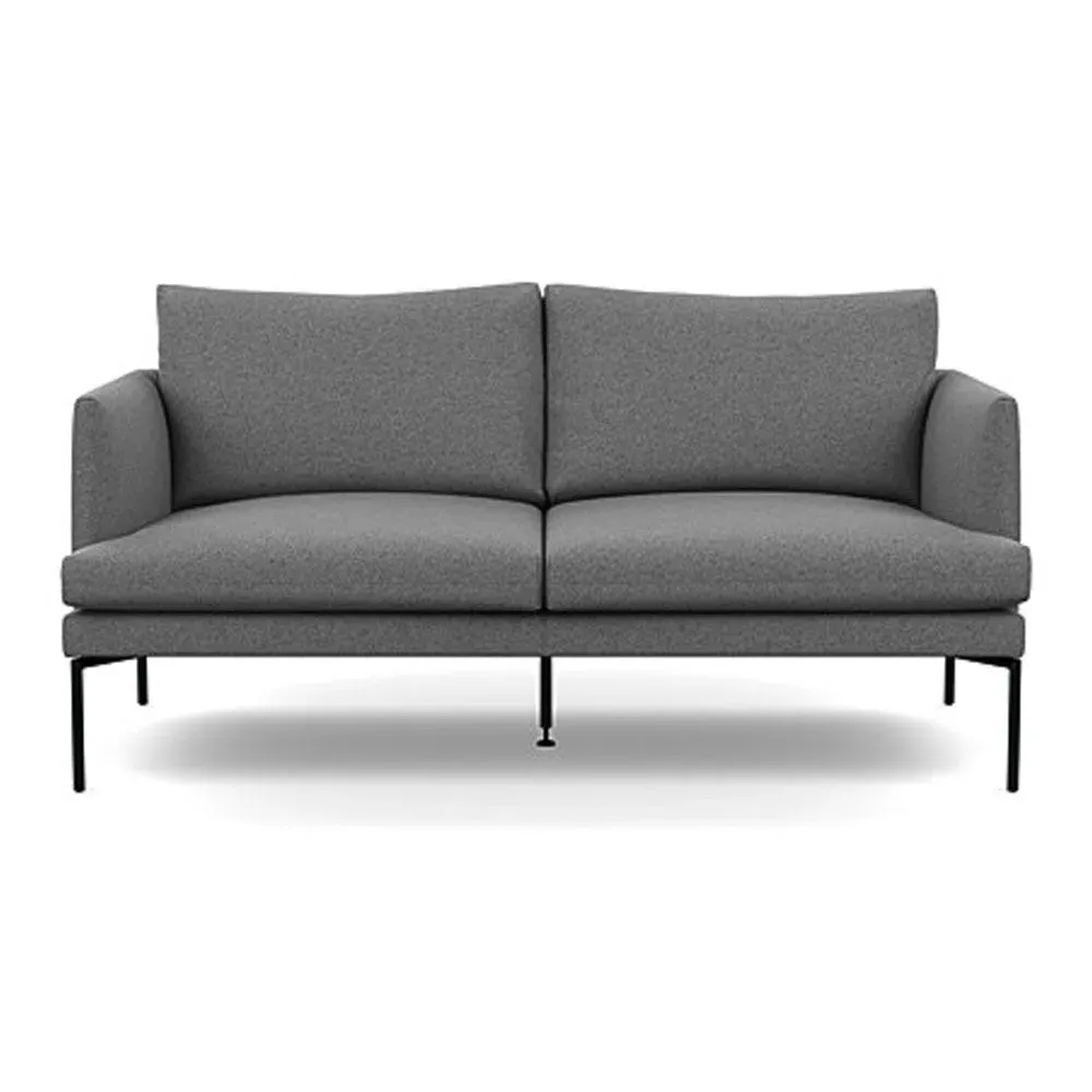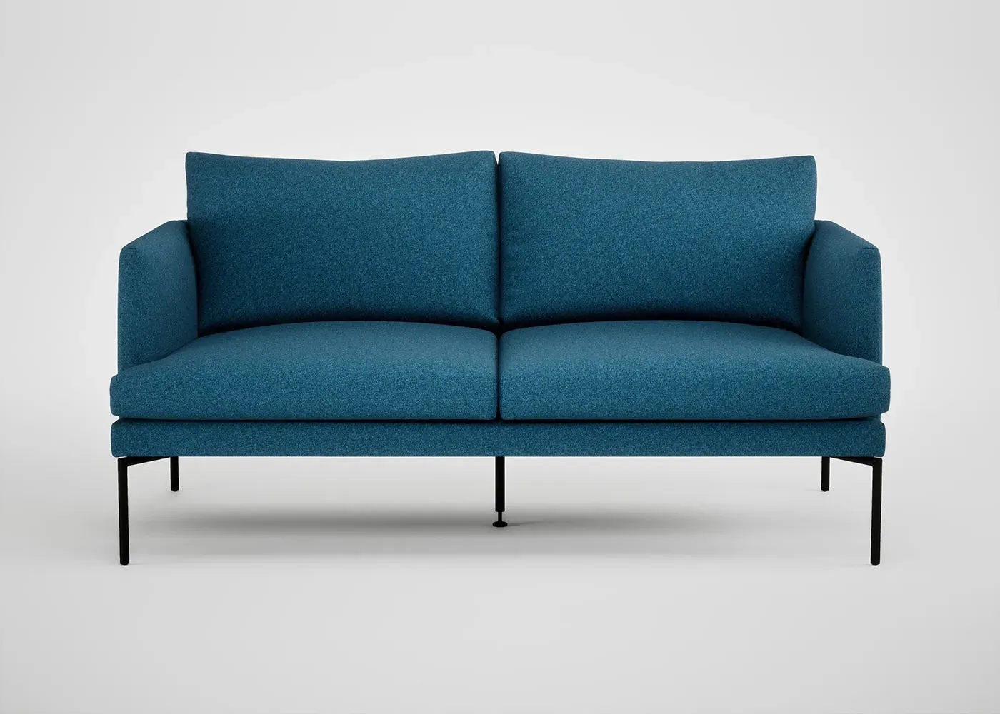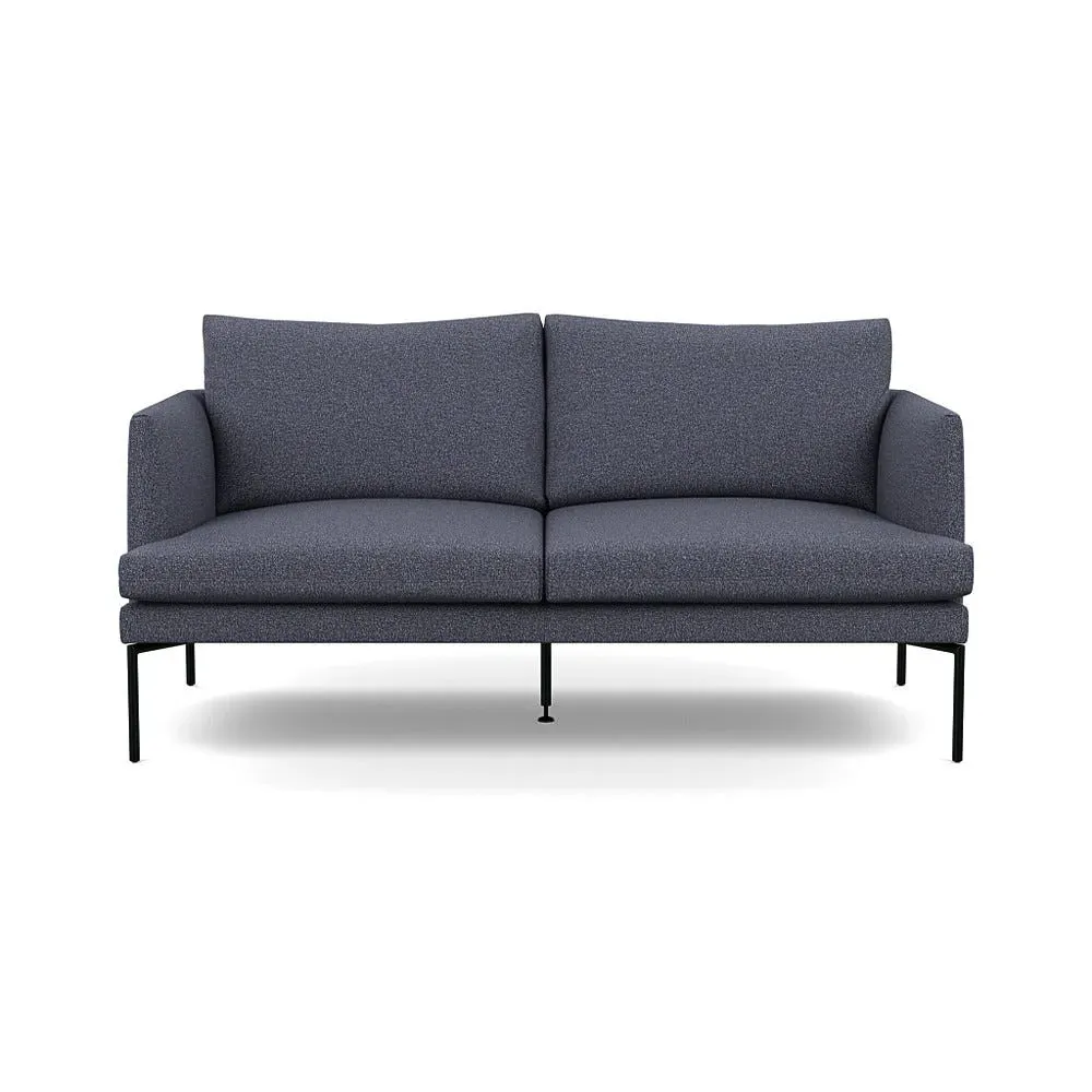 The sofa combines contemporary design with traditional craftsmanship, featuring hand-sewn pleated details across the seat, arms and back cushion. Its curved back adds elegance to the sleek silhouette, while the soft cotton upholstery provides comfortable seating. The metal legs include a fifth centre support for enhanced stability, and the compact design offers generous seating within a small footprint.