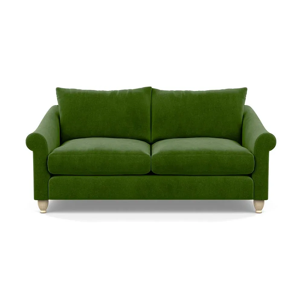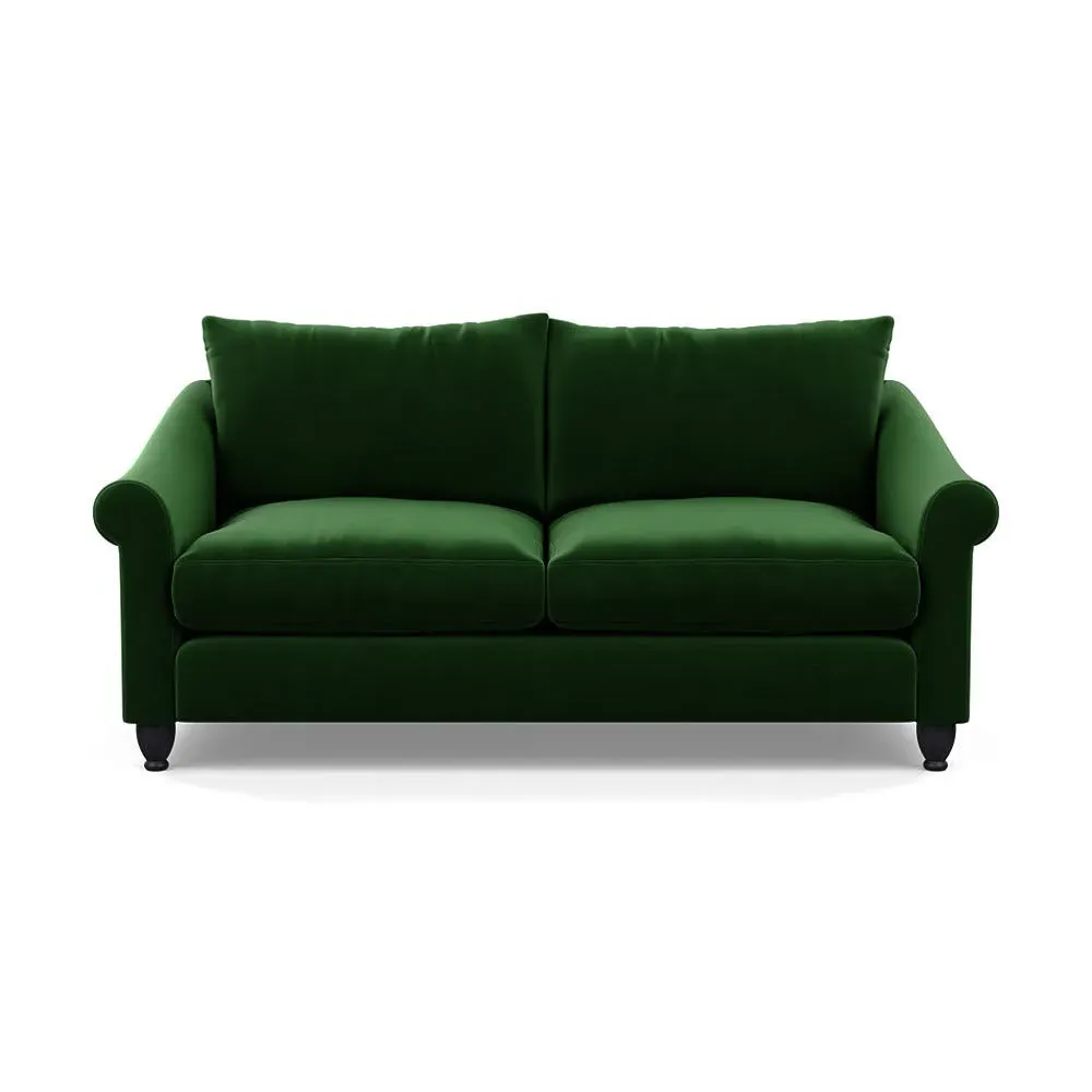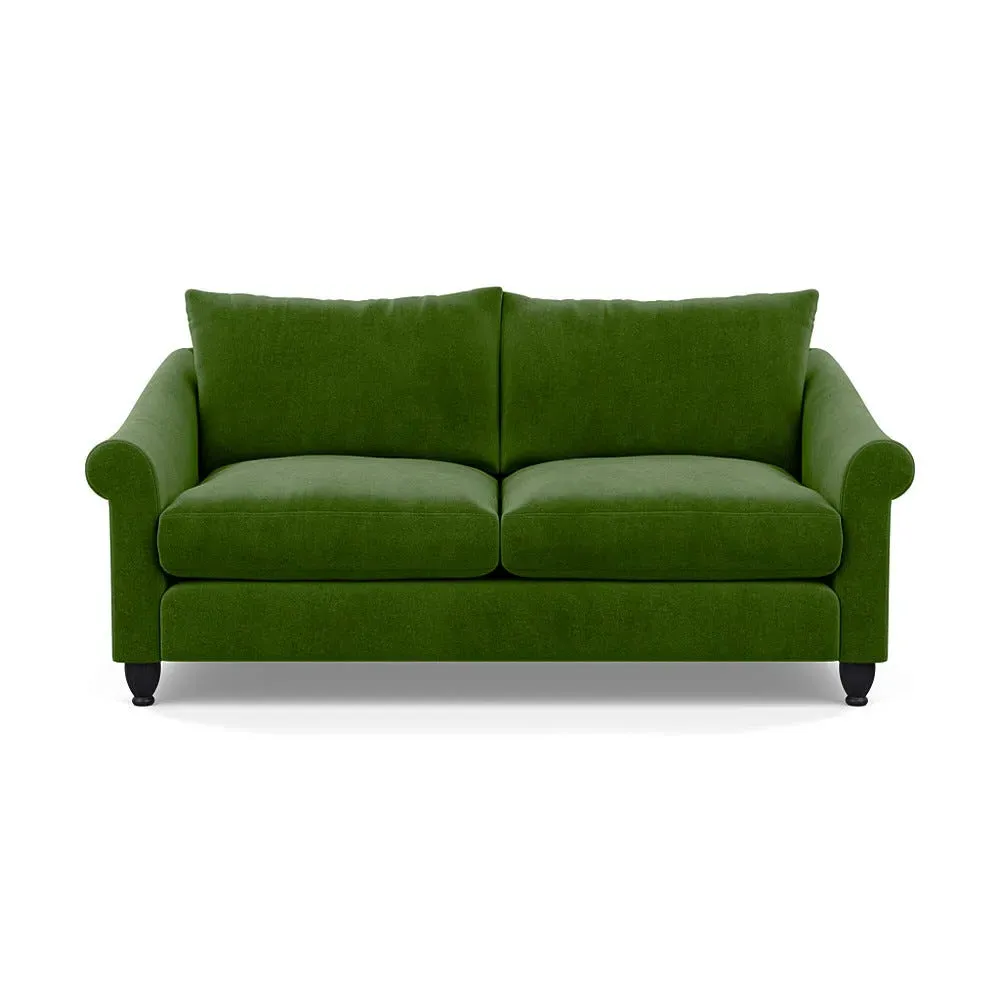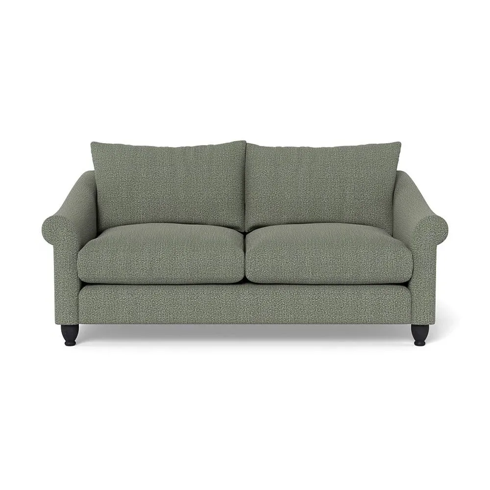 The sofa provides comfort with its soft brushed cotton upholstery in fresh green tones. Its roomy three-seater design accommodates multiple users comfortably, while the black-stained beech feet add contemporary contrast. The brushed cotton fabric combines durability with softness, and the solid wooden base ensures enduring stability.