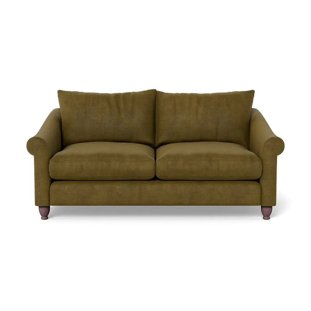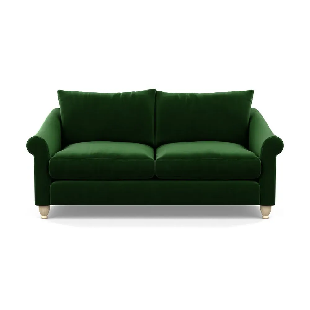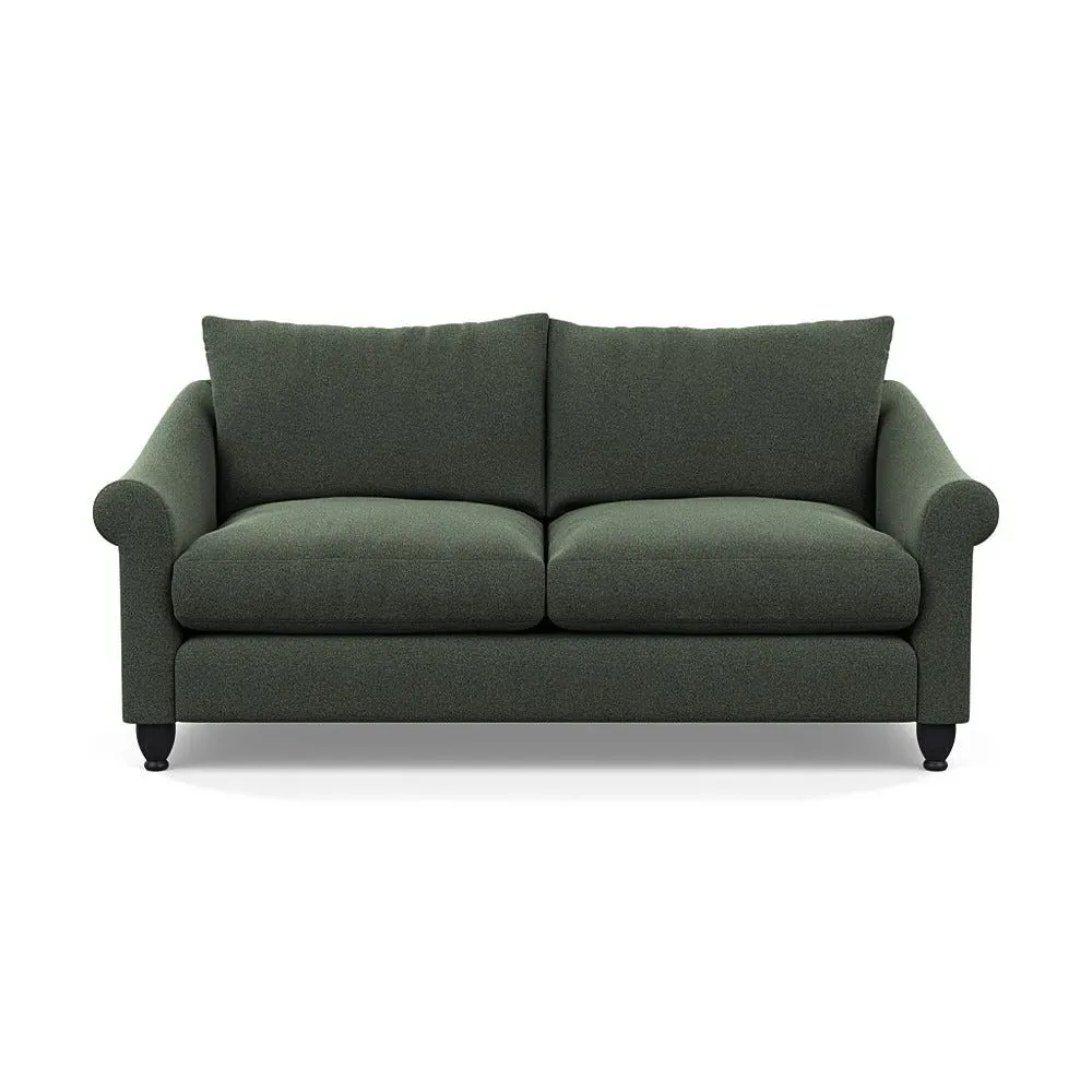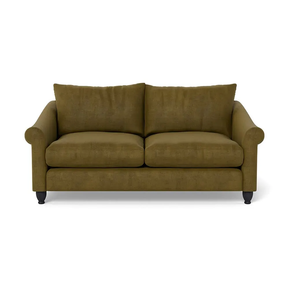 The sofa provides comfort with its soft brushed cotton upholstery in fresh green tones. Its roomy three-seater design accommodates multiple users comfortably, while the black-stained beech feet add contemporary contrast. The brushed cotton fabric combines durability with softness, and the solid wooden base ensures enduring stability.