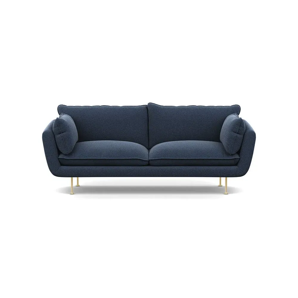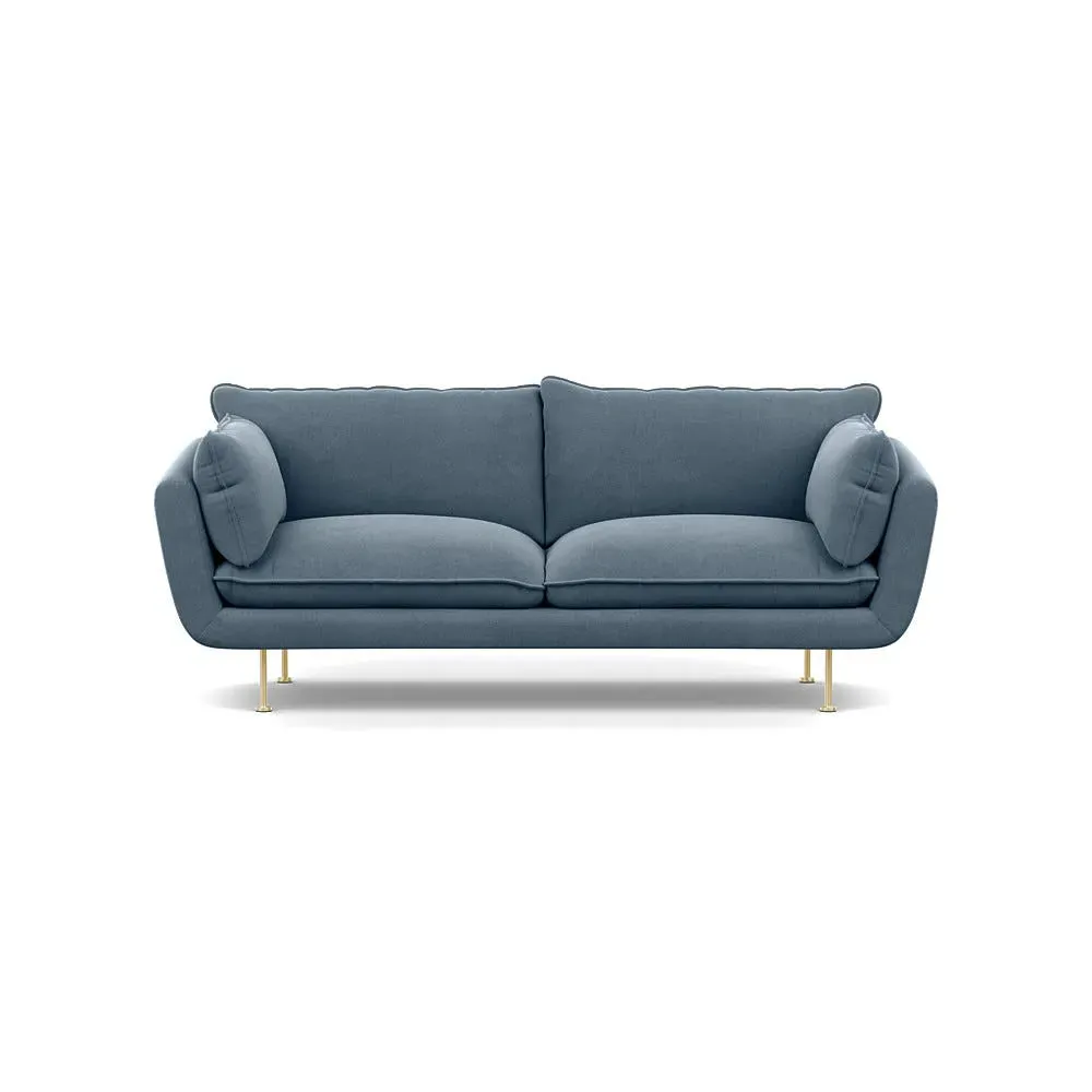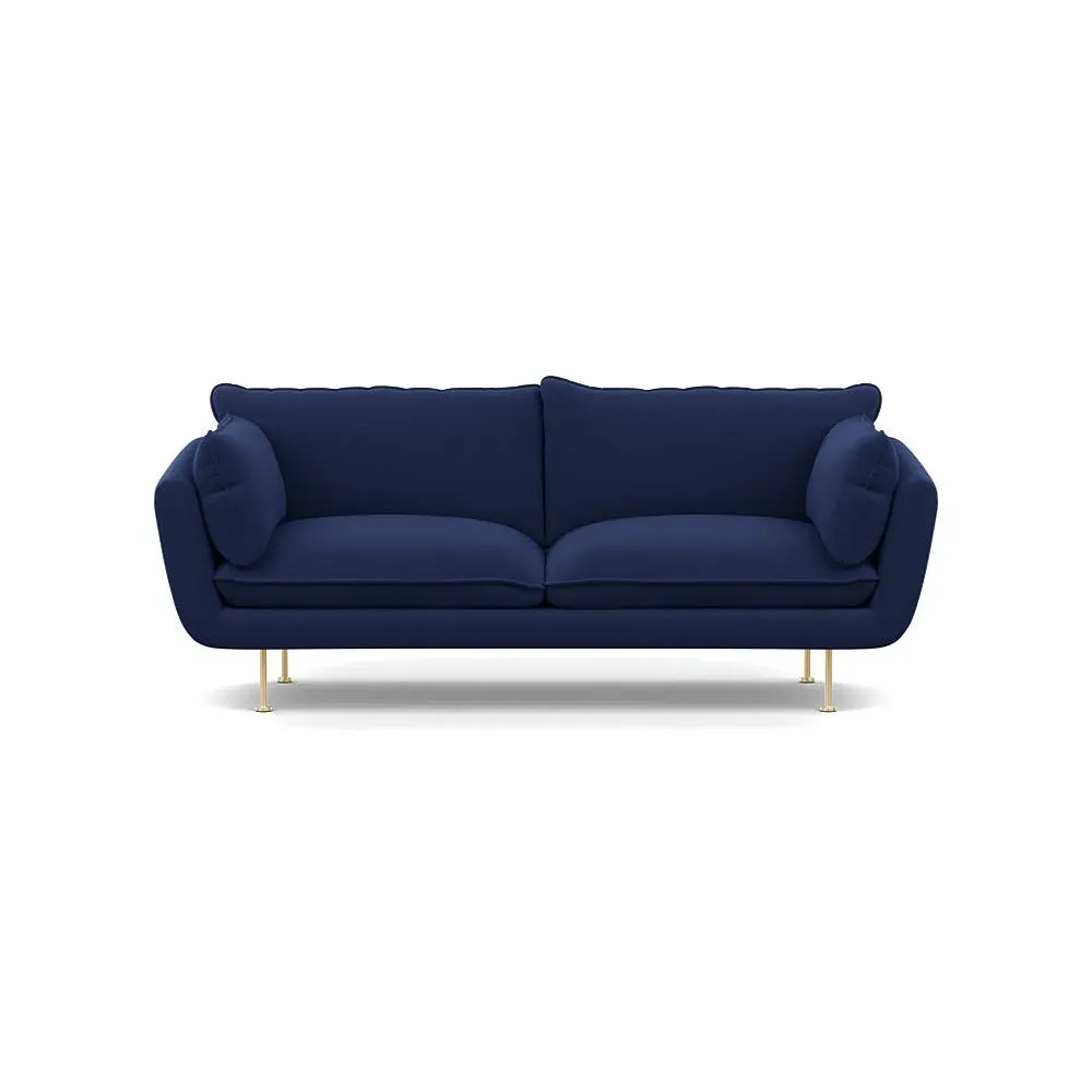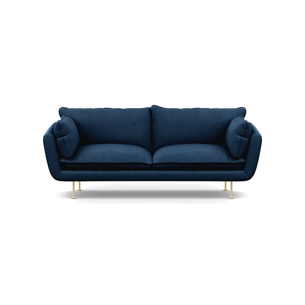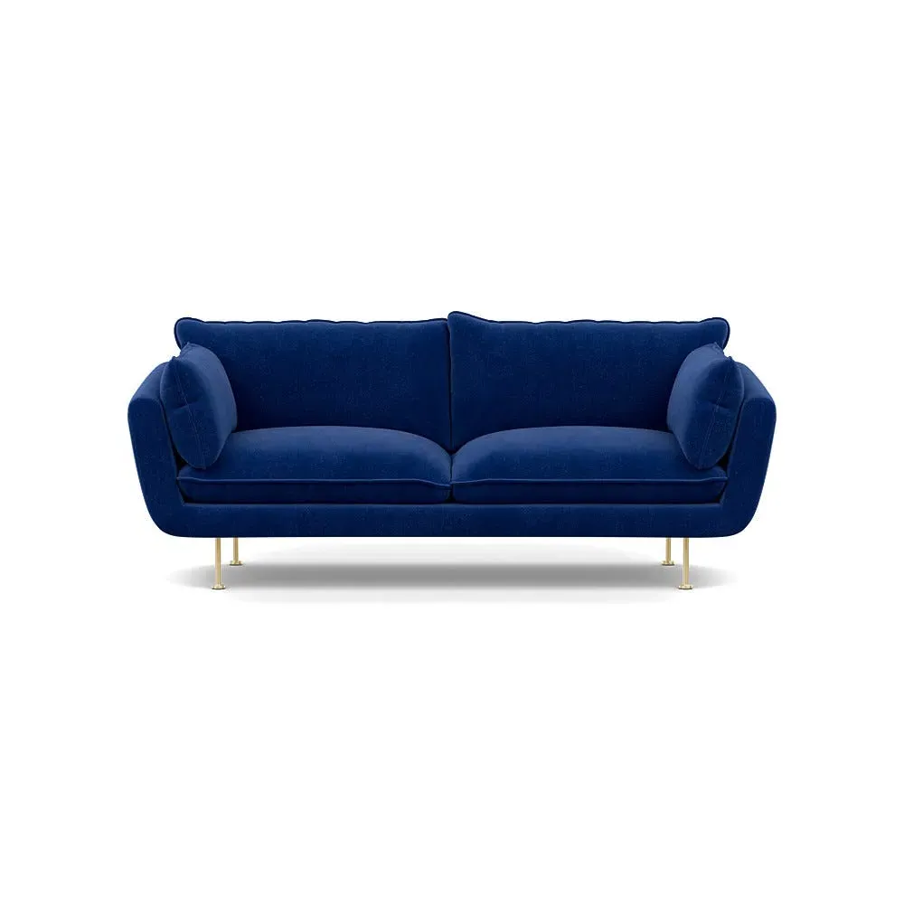 The sofa combines brushed cotton upholstery with elegant brass feet for a sophisticated appearance. Its plush cushioning provides exceptional comfort, while the sturdy frame ensures lasting durability. The brass leg finish adds a warm metallic accent that complements the rich blue cotton beautifully.
