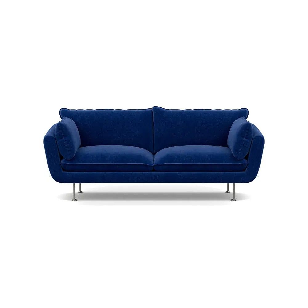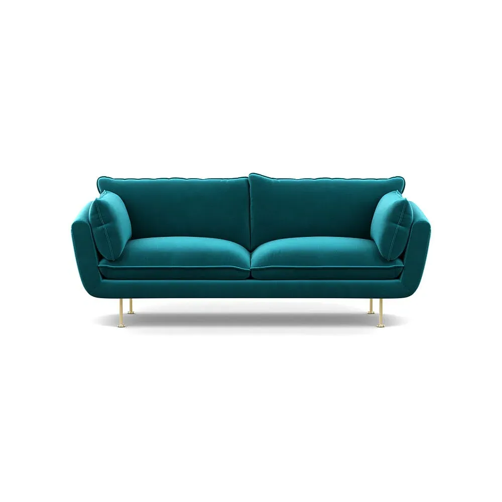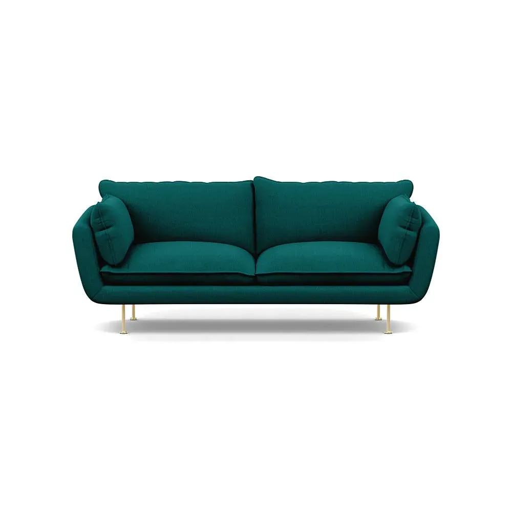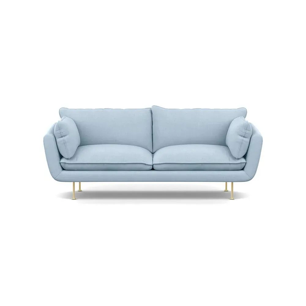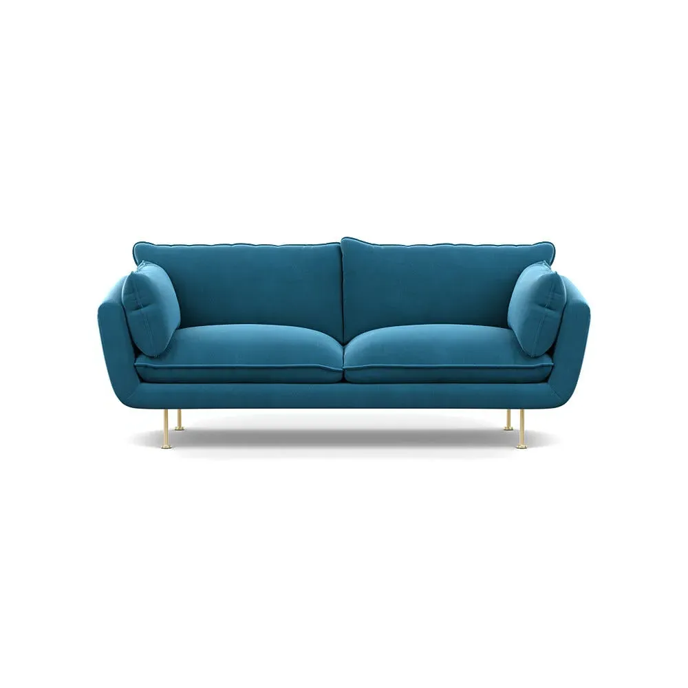 The sofa combines brushed cotton upholstery with elegant brass feet for a sophisticated appearance. Its plush cushioning provides exceptional comfort, while the sturdy frame ensures lasting durability. The brass leg finish adds a warm metallic accent that complements the rich blue cotton beautifully.