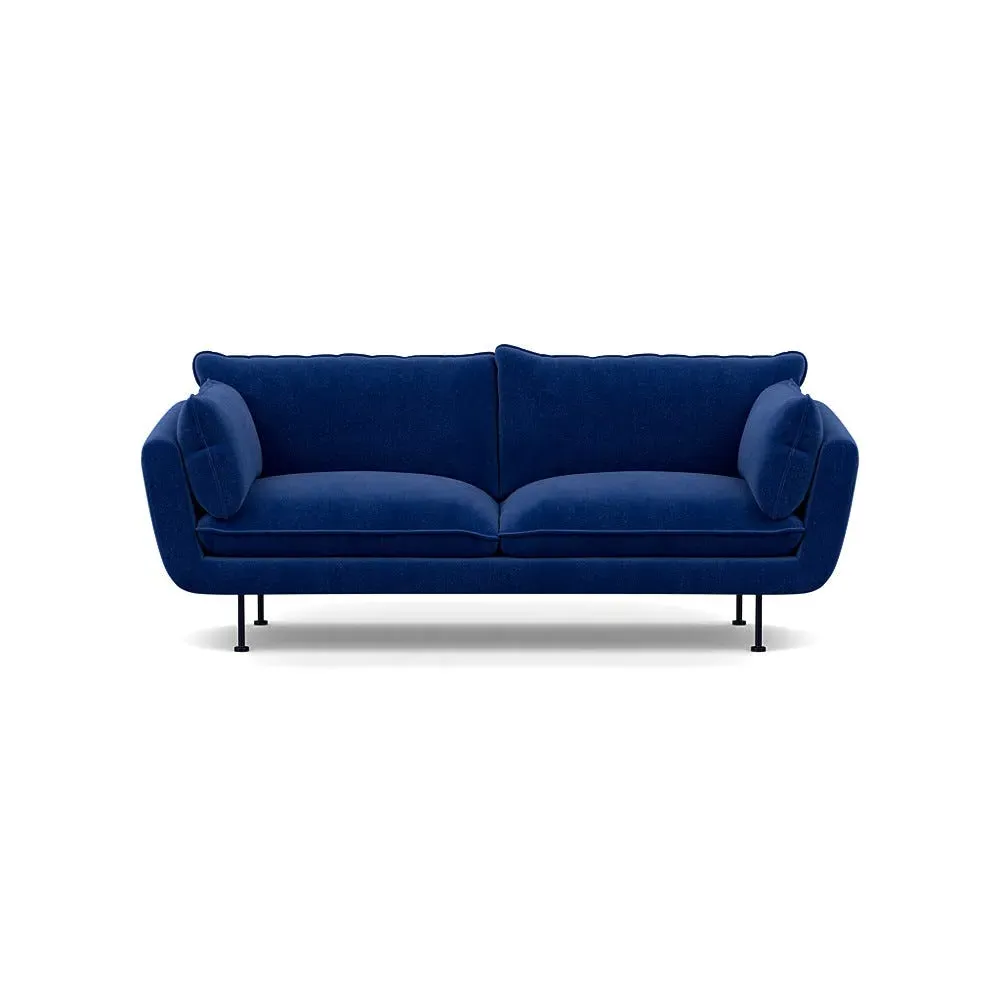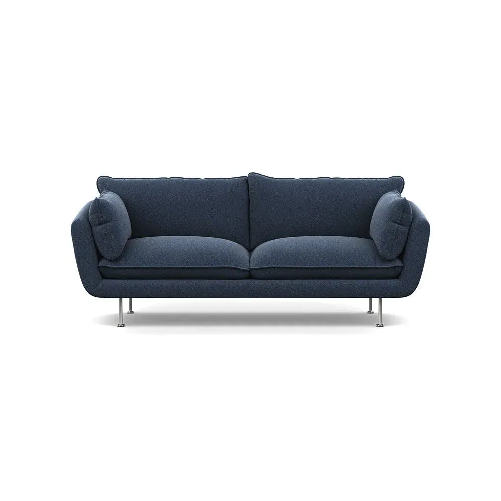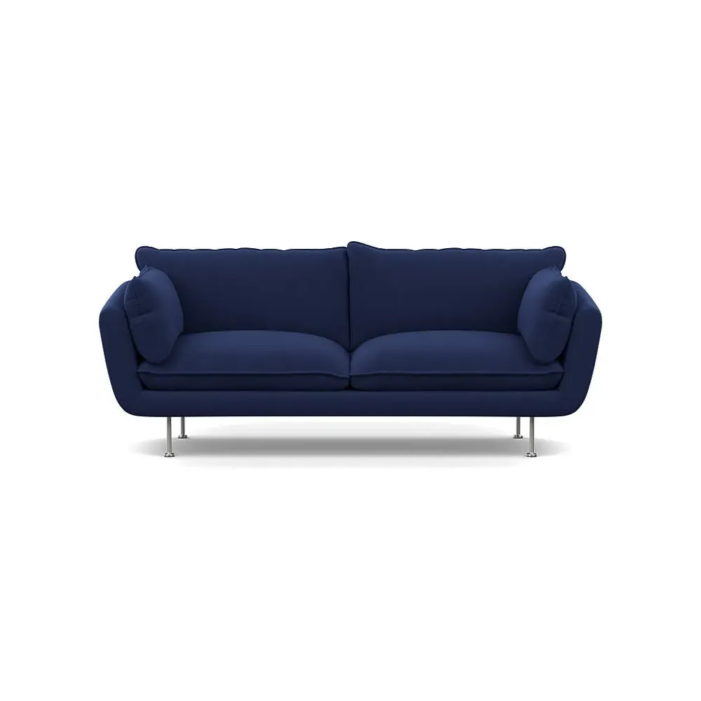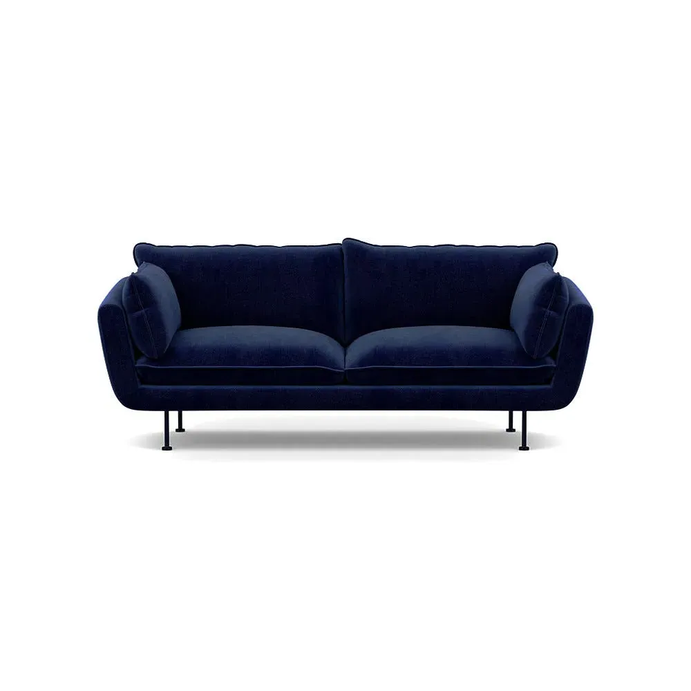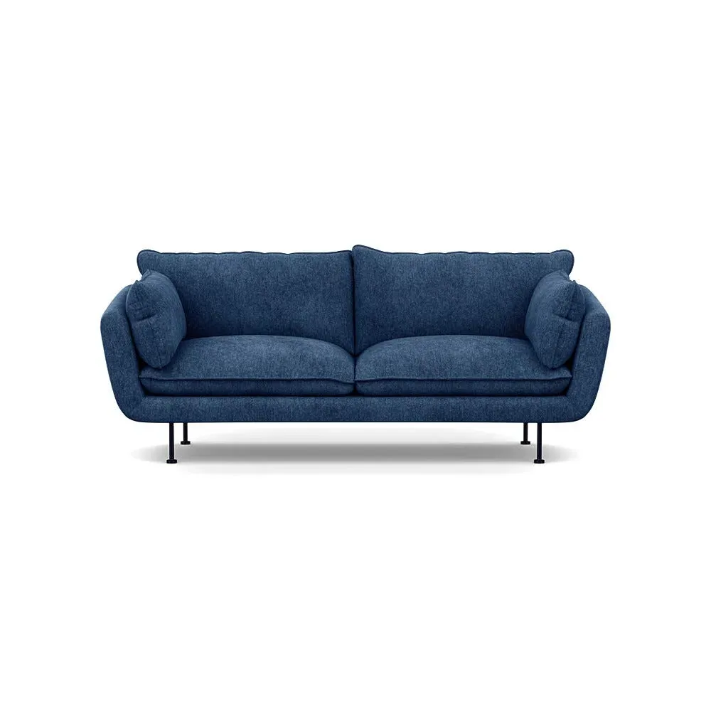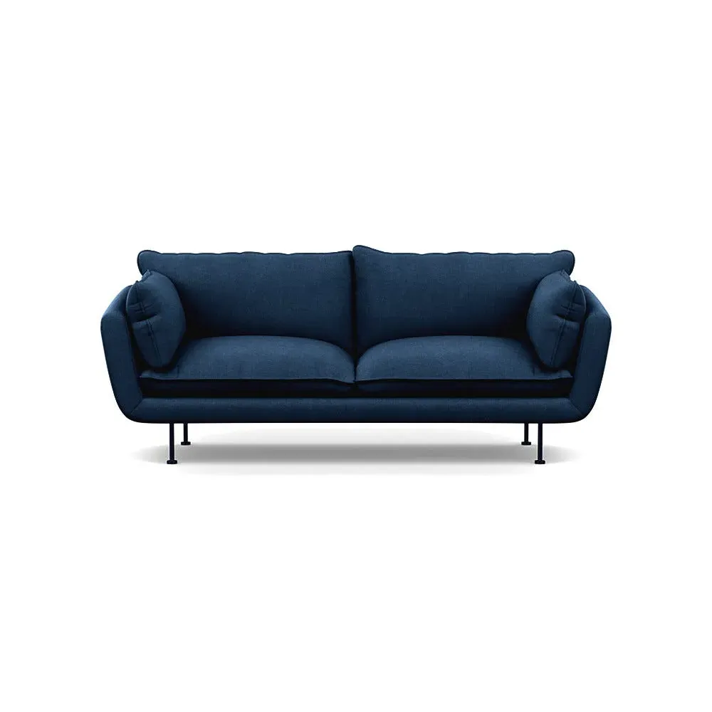 The sofa combines brushed cotton upholstery with elegant brass feet for a sophisticated appearance. Its plush cushioning provides exceptional comfort, while the sturdy frame ensures lasting durability. The brass leg finish adds a warm metallic accent that complements the rich blue cotton beautifully.