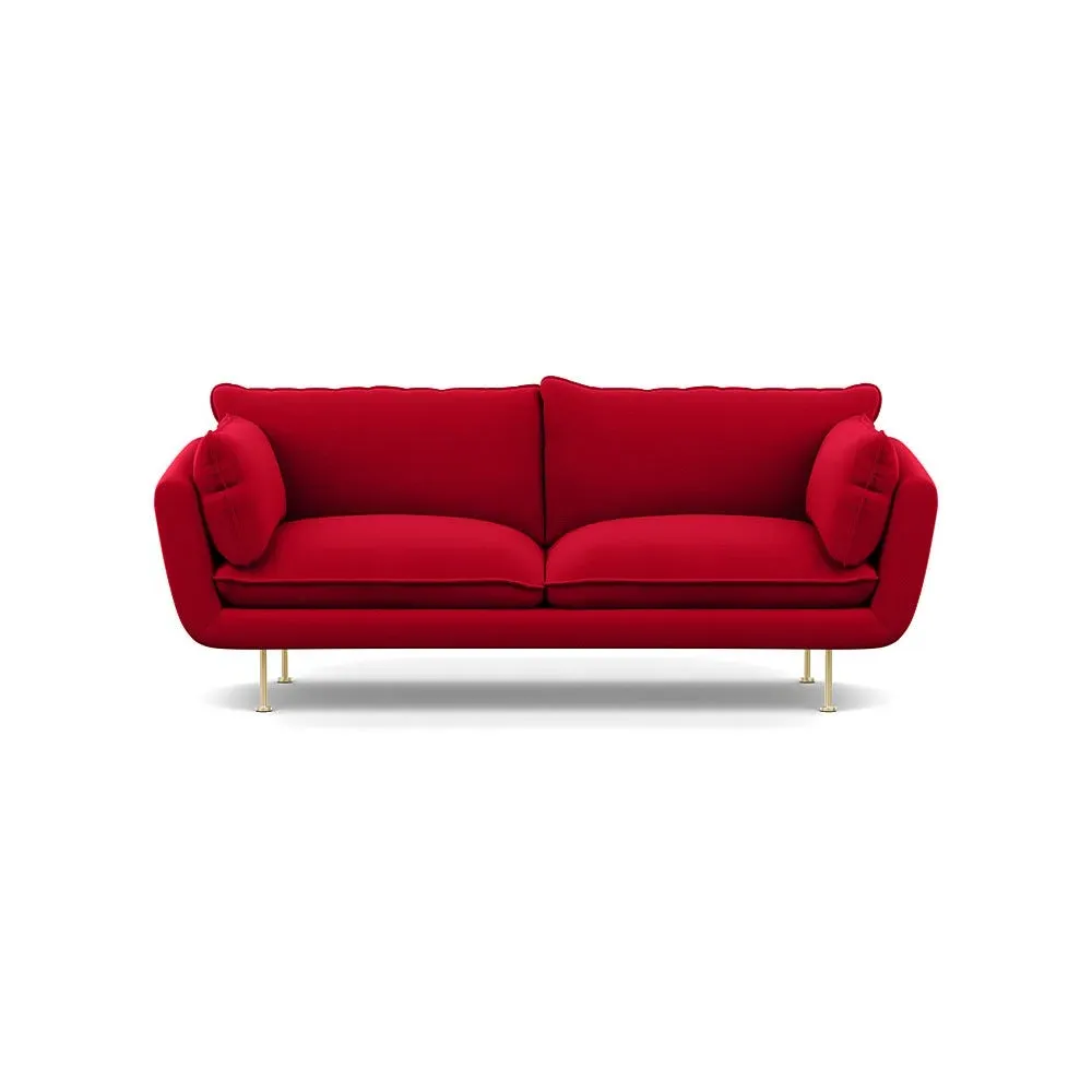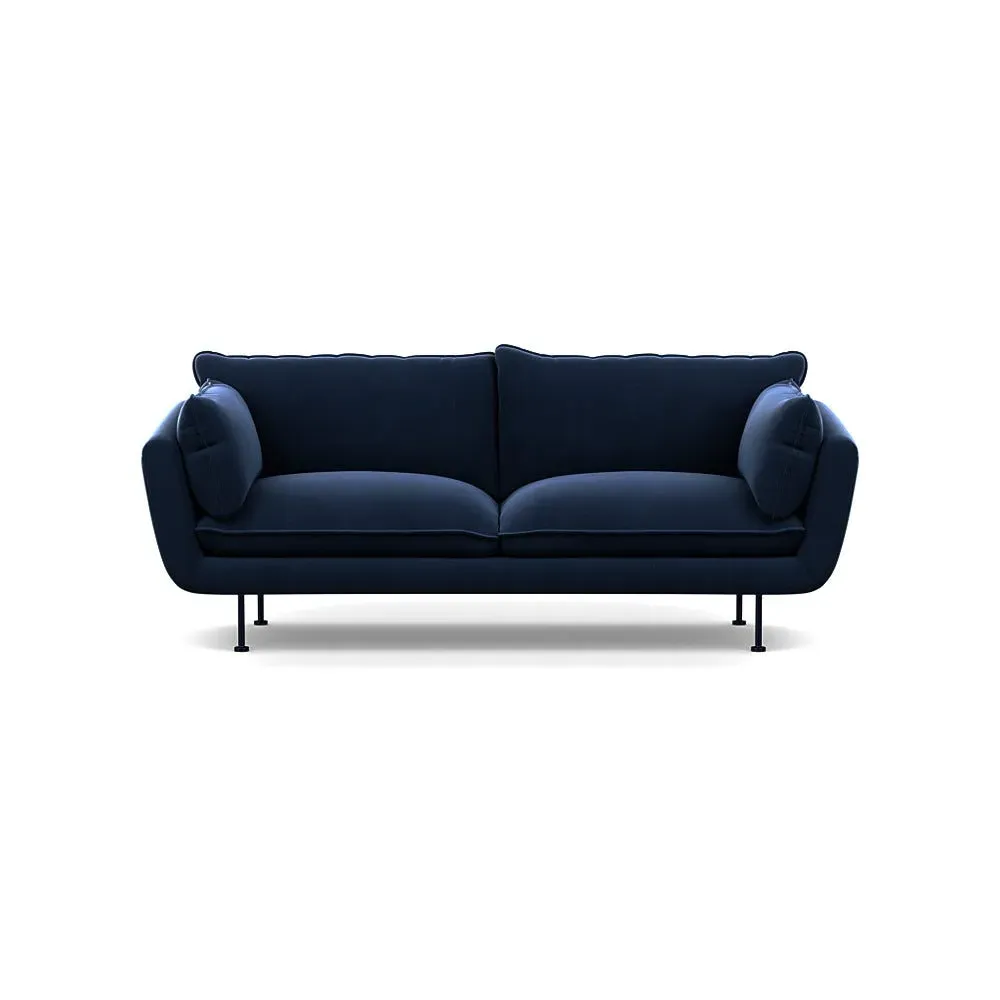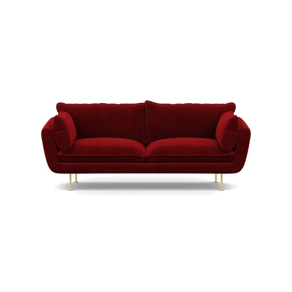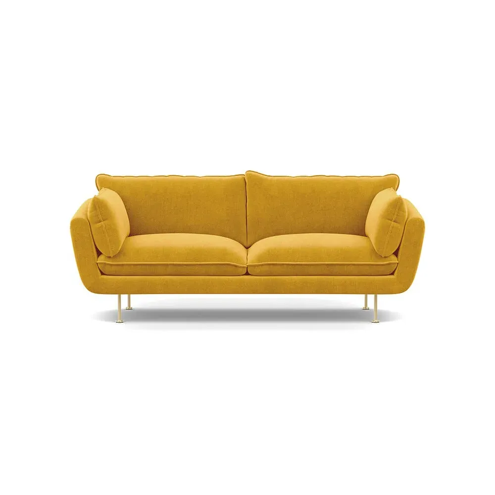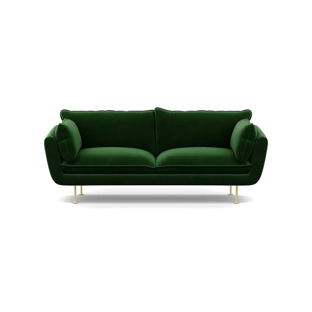 The sofa combines brushed cotton upholstery with elegant brass feet for a sophisticated appearance. Its plush cushioning provides exceptional comfort, while the sturdy frame ensures lasting durability. The brass leg finish adds a warm metallic accent that complements the rich blue cotton beautifully.
