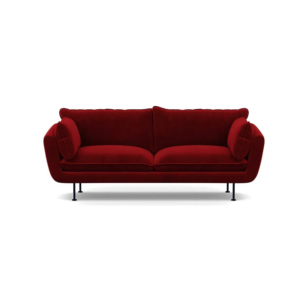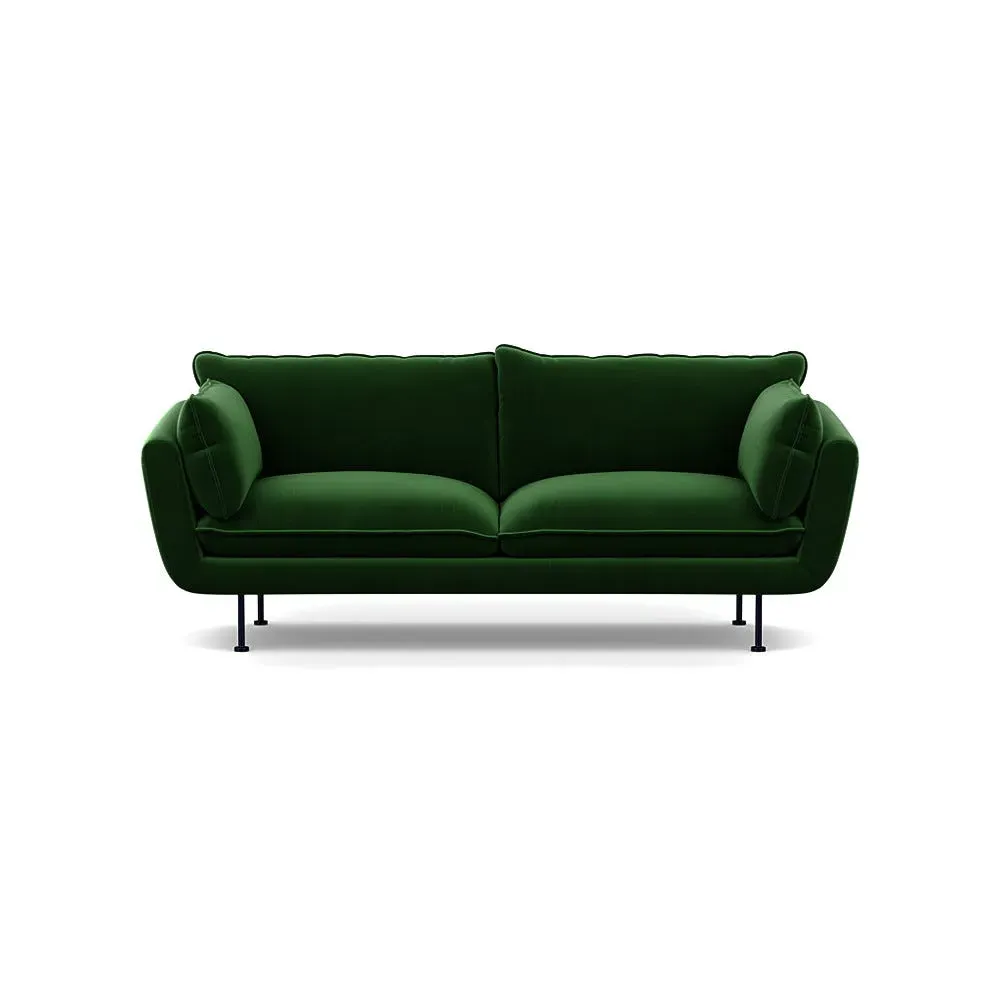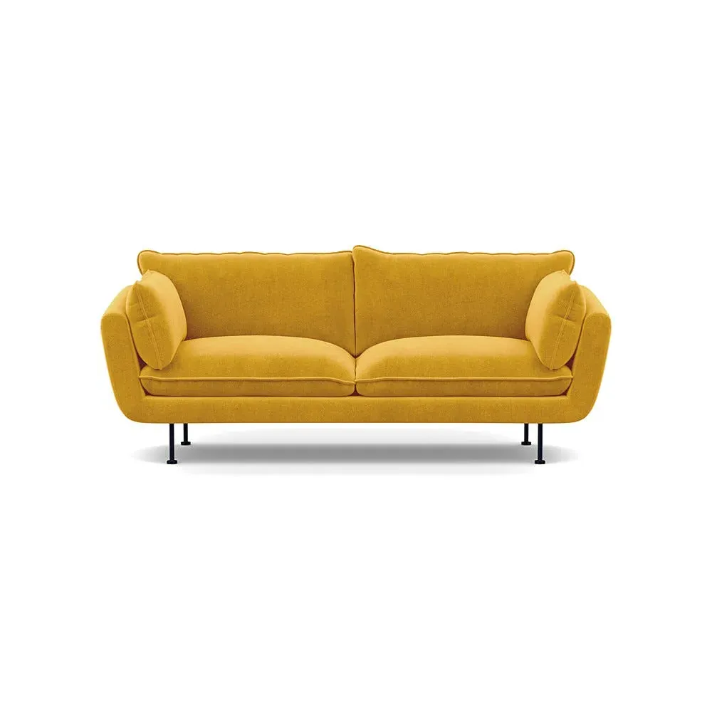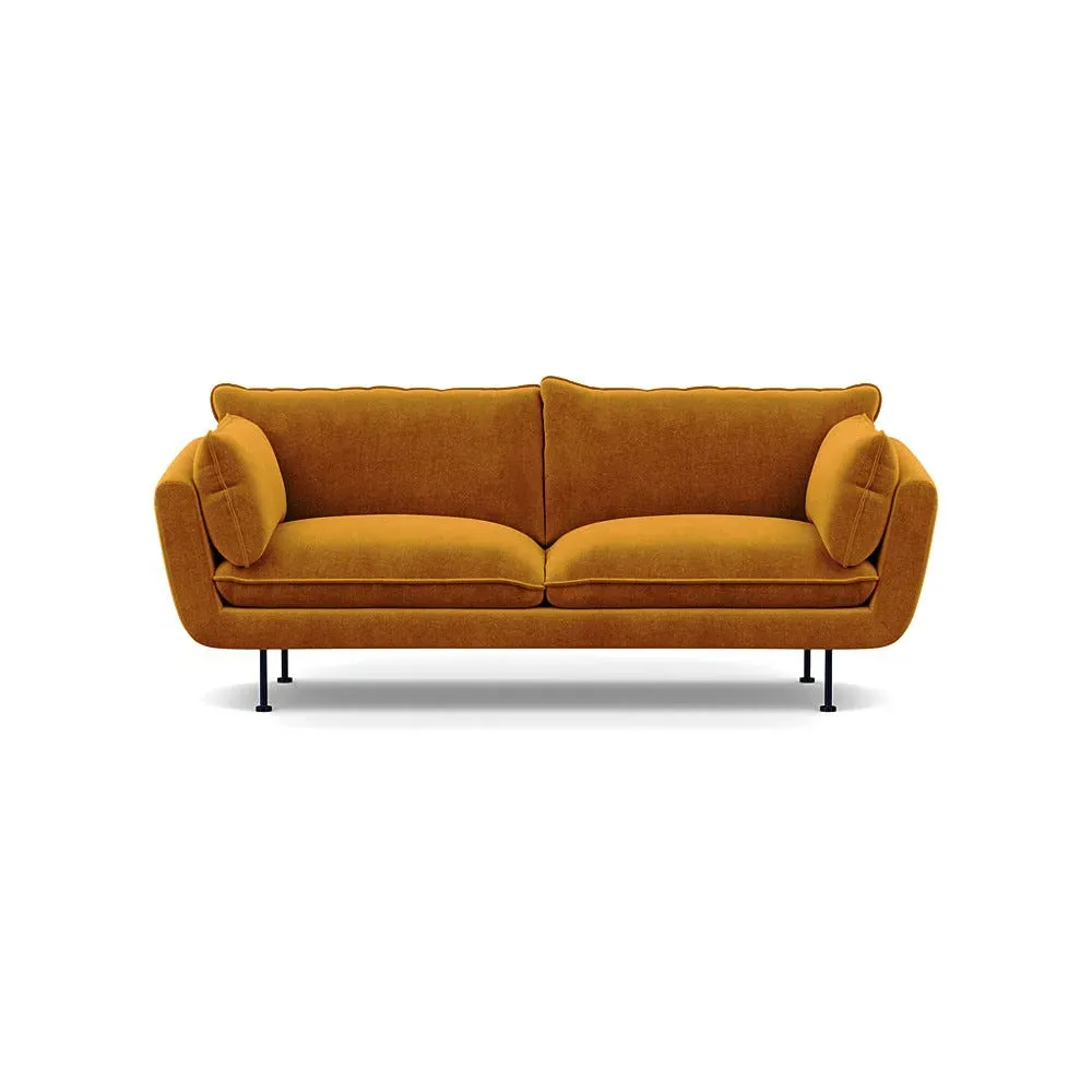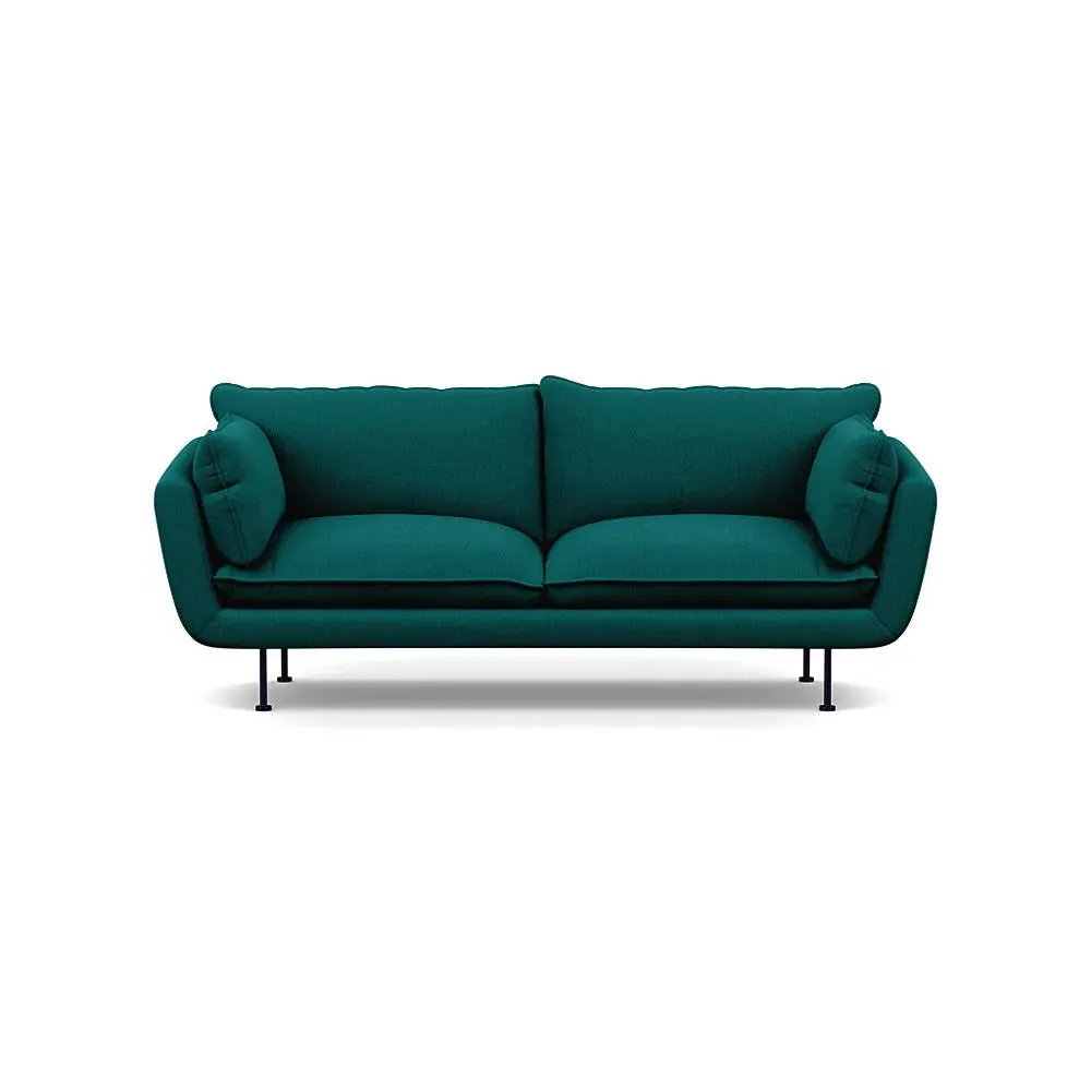 The sofa combines brushed cotton upholstery with elegant brass feet for a sophisticated appearance. Its plush cushioning provides exceptional comfort, while the sturdy frame ensures lasting durability. The brass leg finish adds a warm metallic accent that complements the rich blue cotton beautifully.