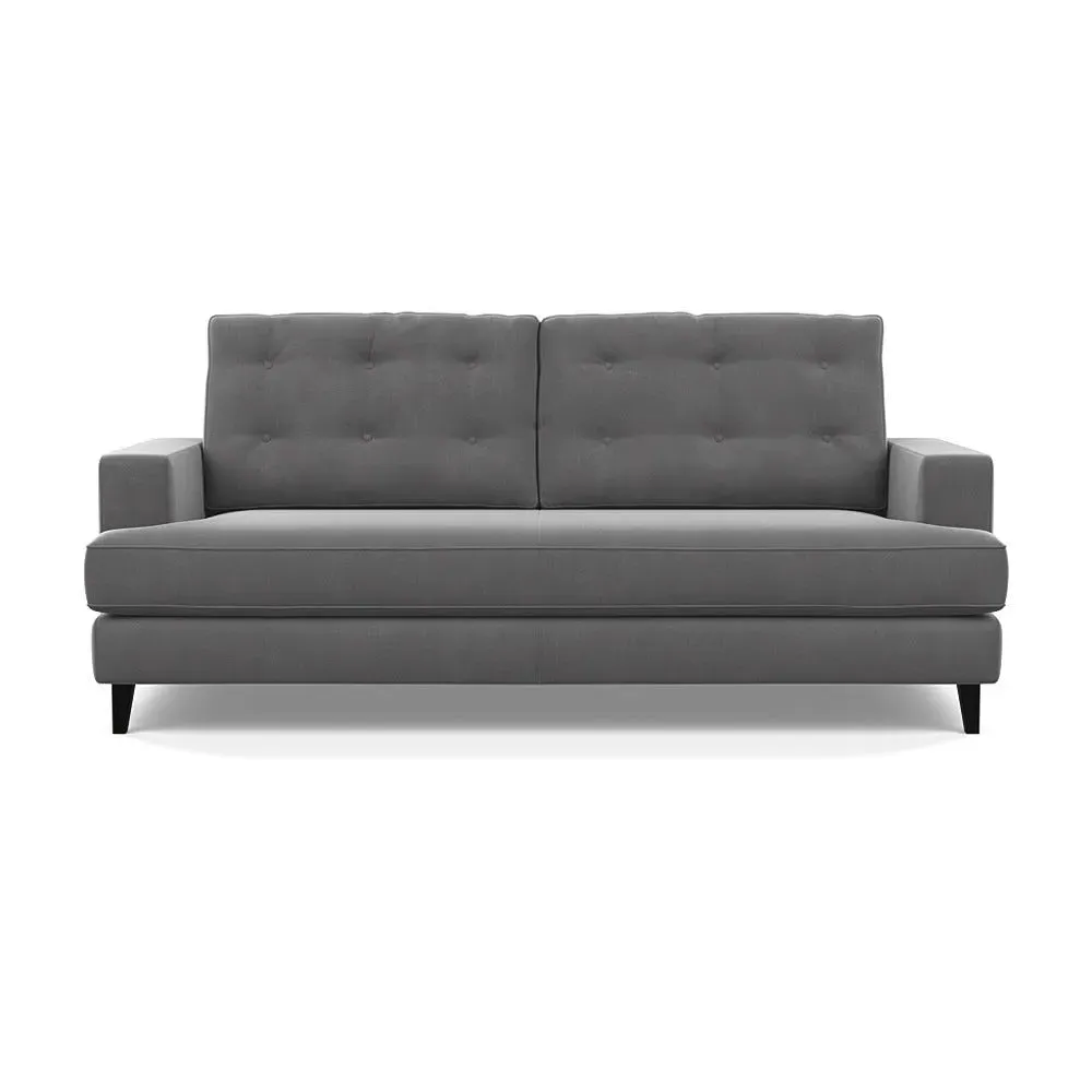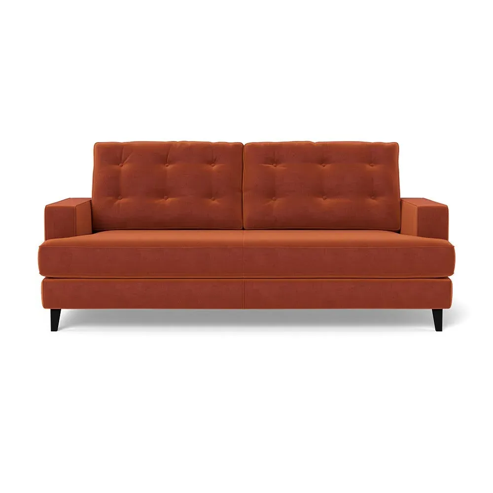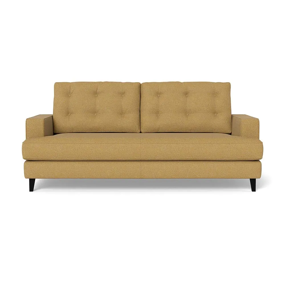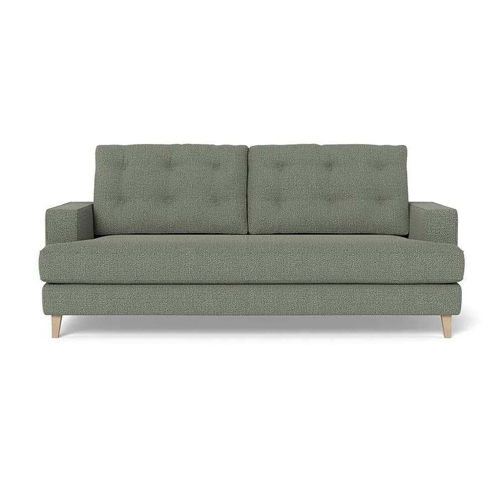The sofa combines mid-century design with contemporary comfort, featuring a fully-upholstered frame with graceful matching piping. Its single supportive padded seat and button-cushions provide excellent comfort, while the bolstered backrest adds extra support. The sturdy birch wood frame offers durability with its webbed seat structure, and the sleek tapered beech feet complete the retro-inspired aesthetic.