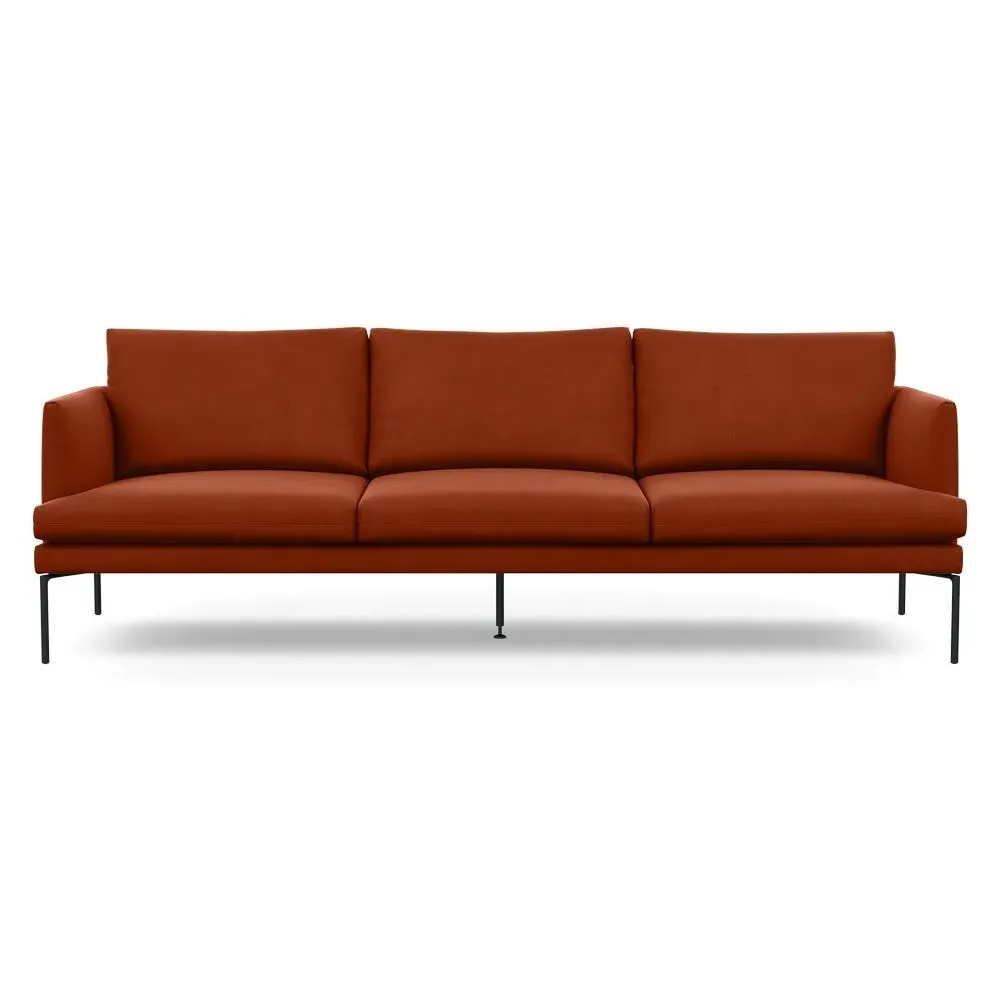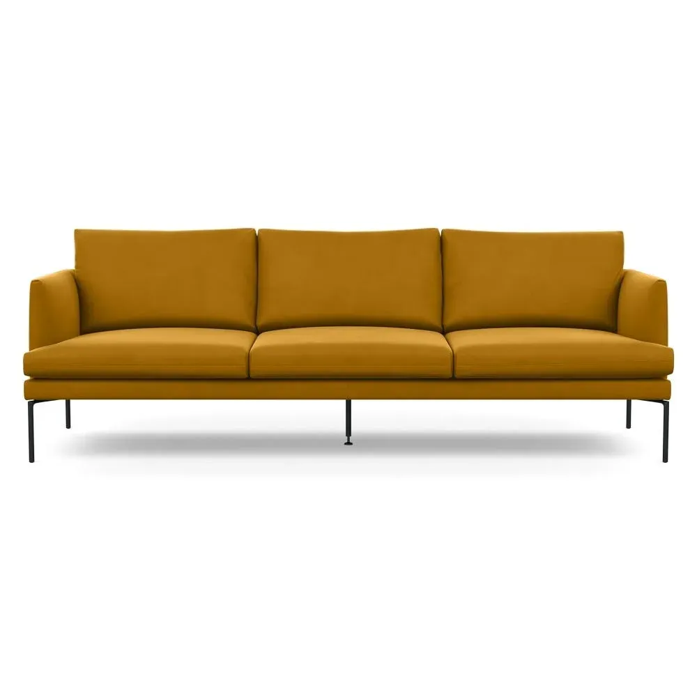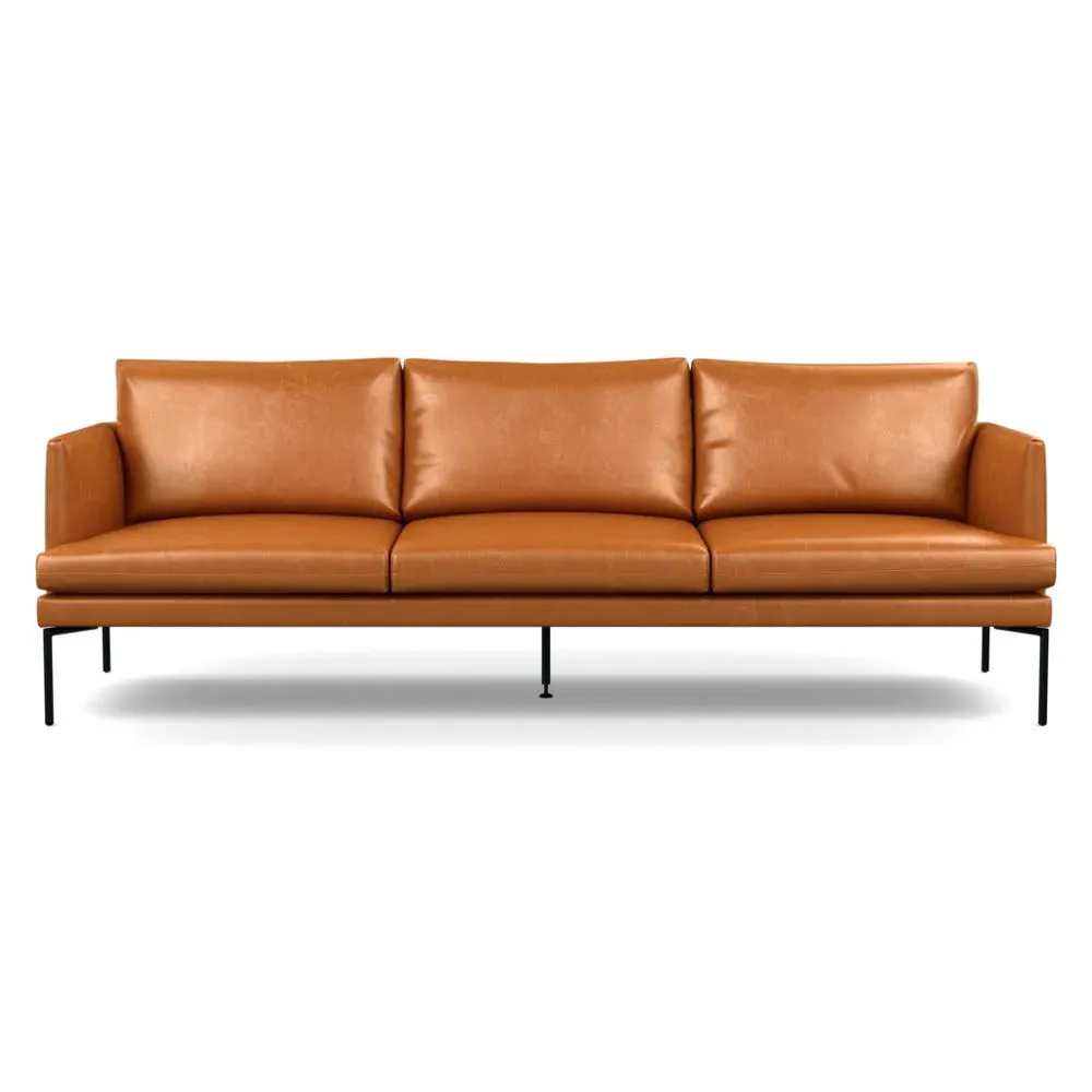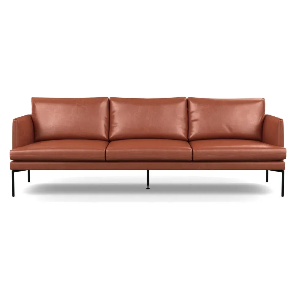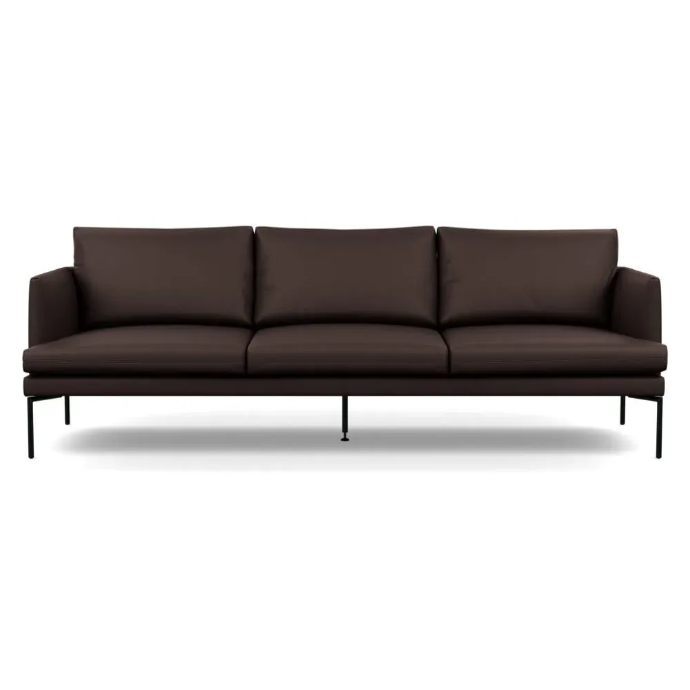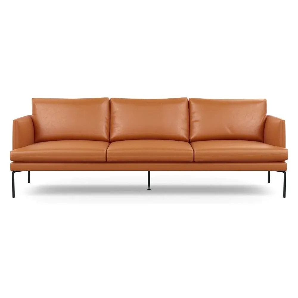 The sofa combines sleek modern design with traditional craftsmanship, featuring meticulously hand-sewn pleated details on the seat, arms and back cushions. Its curved back adds elegance to the silhouette, while the black metal legs provide contemporary style. The fifth middle leg offers extra support for durability, and the compact design delivers generous seating within a smaller footprint.