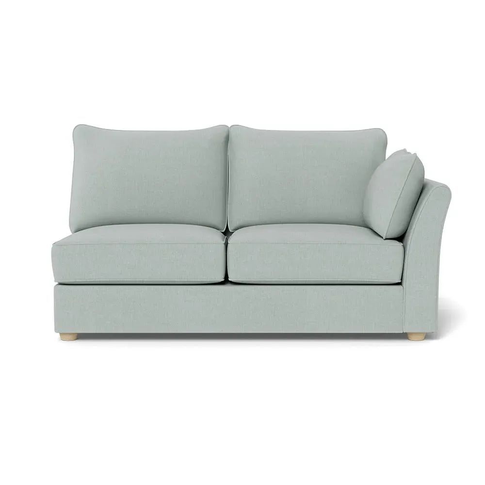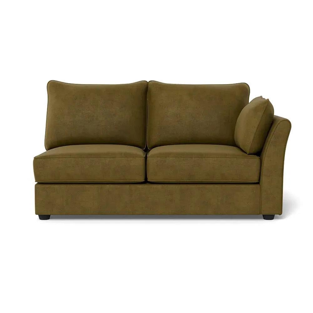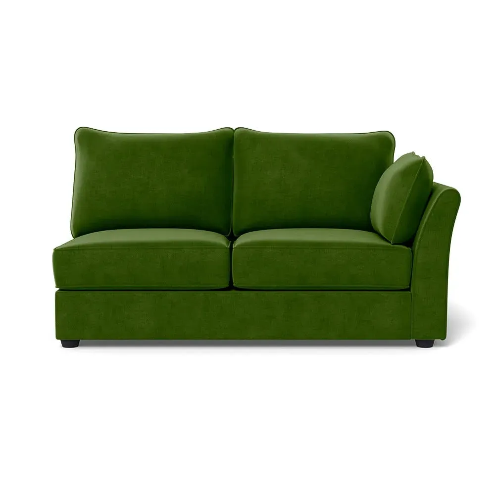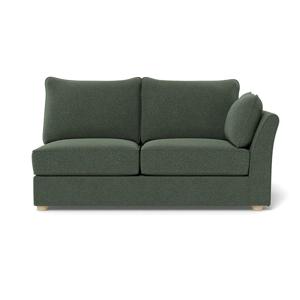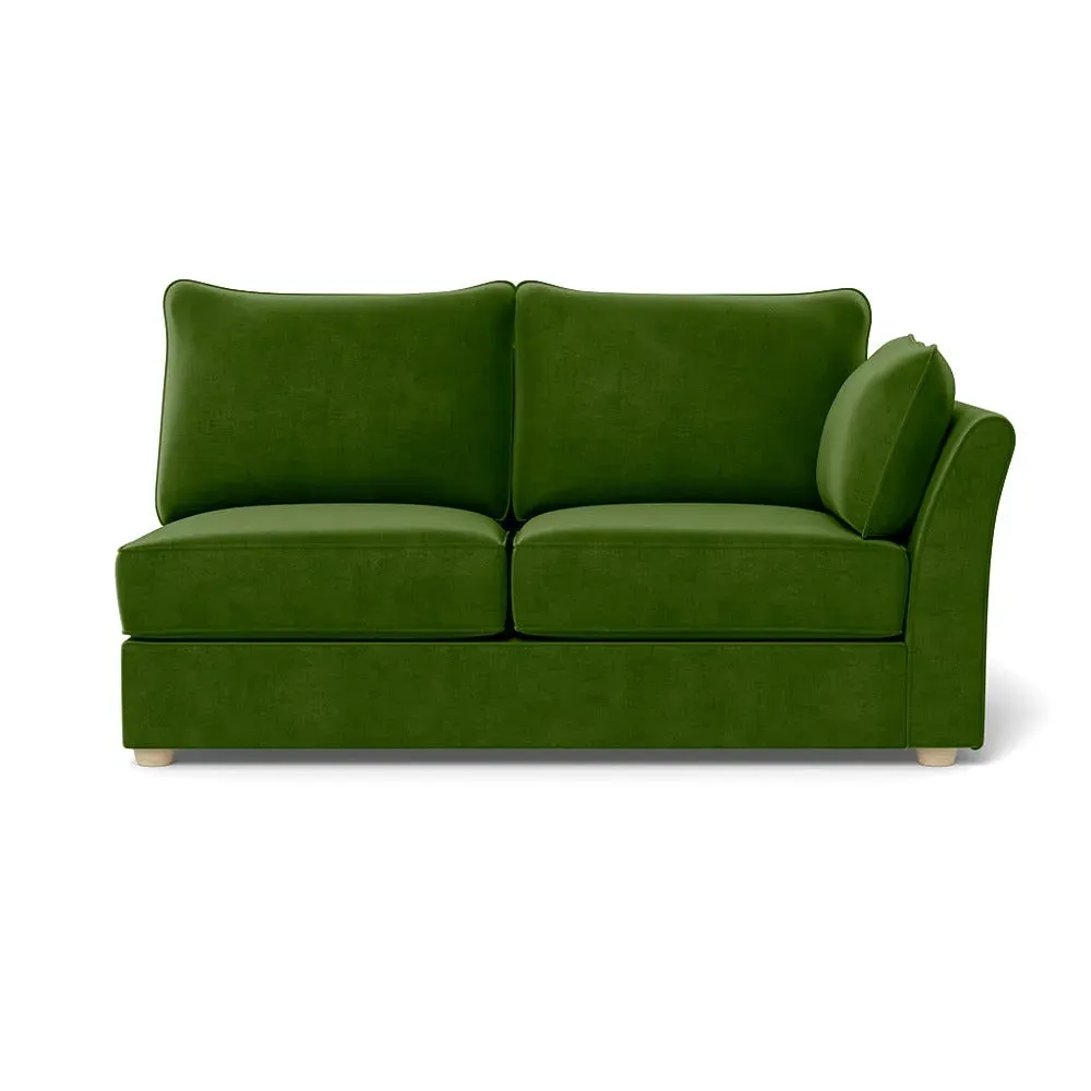 The medium corner unit offers comfortable seating with its left-hand facing configuration, upholstered in soft brushed cotton. Its green pine finish provides freshness and natural appeal, while the natural wooden feet add stability and style. The medium size suits various spaces, and the quality construction ensures lasting comfort.