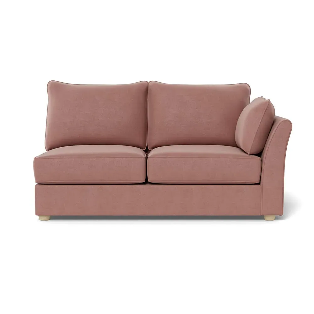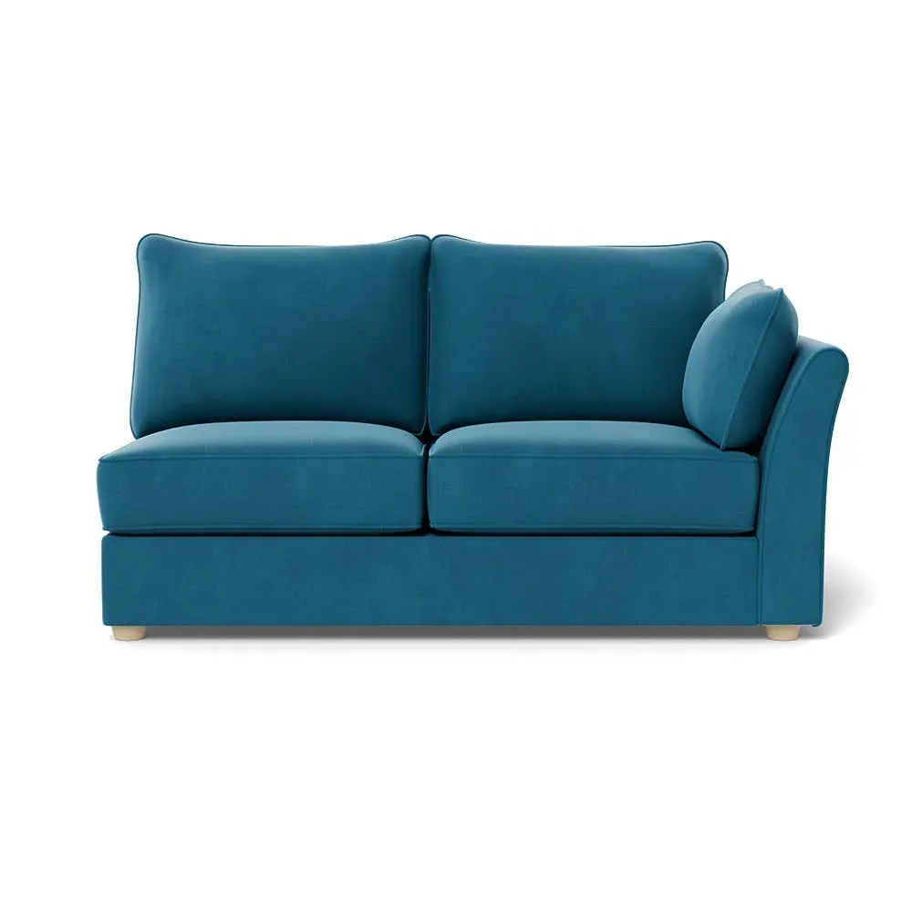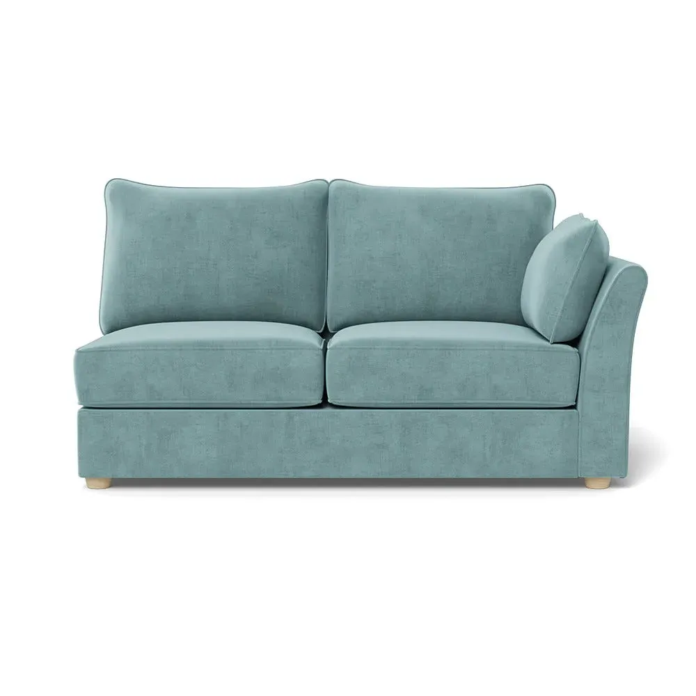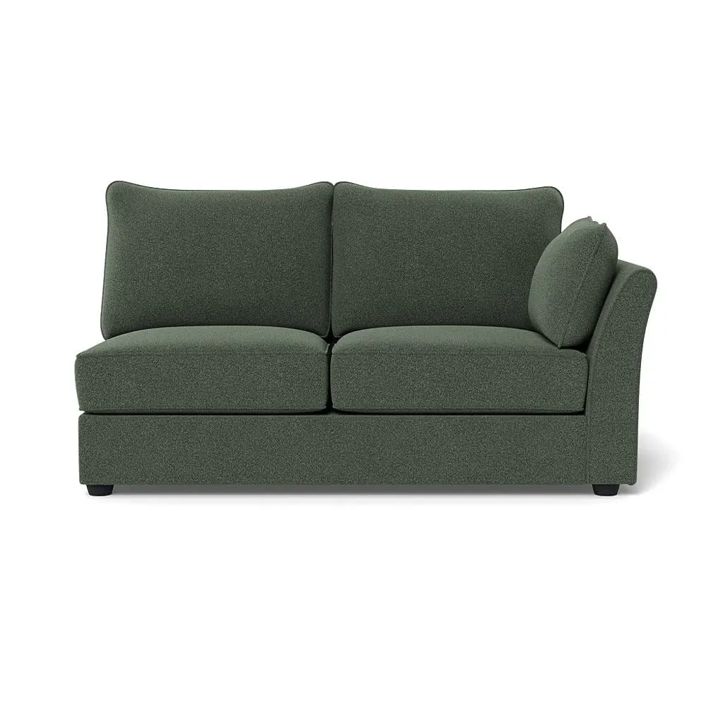 The medium corner unit offers comfortable seating with its left-hand facing configuration, upholstered in soft brushed cotton. Its green pine finish provides freshness and natural appeal, while the natural wooden feet add stability and style. The medium size suits various spaces, and the quality construction ensures lasting comfort.