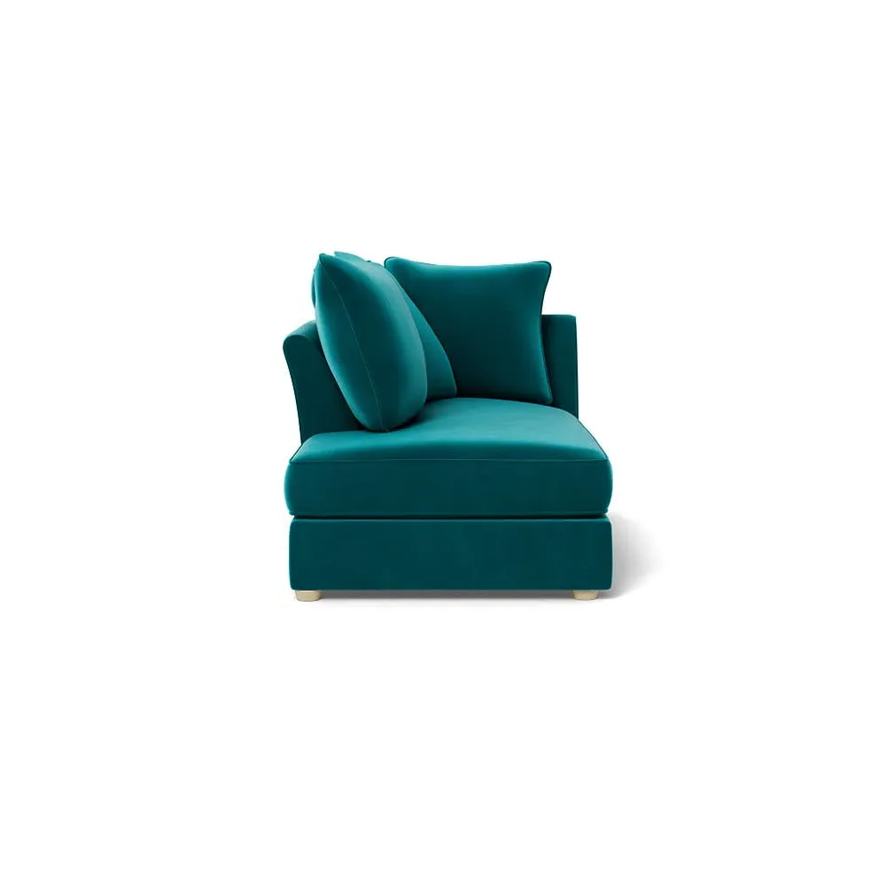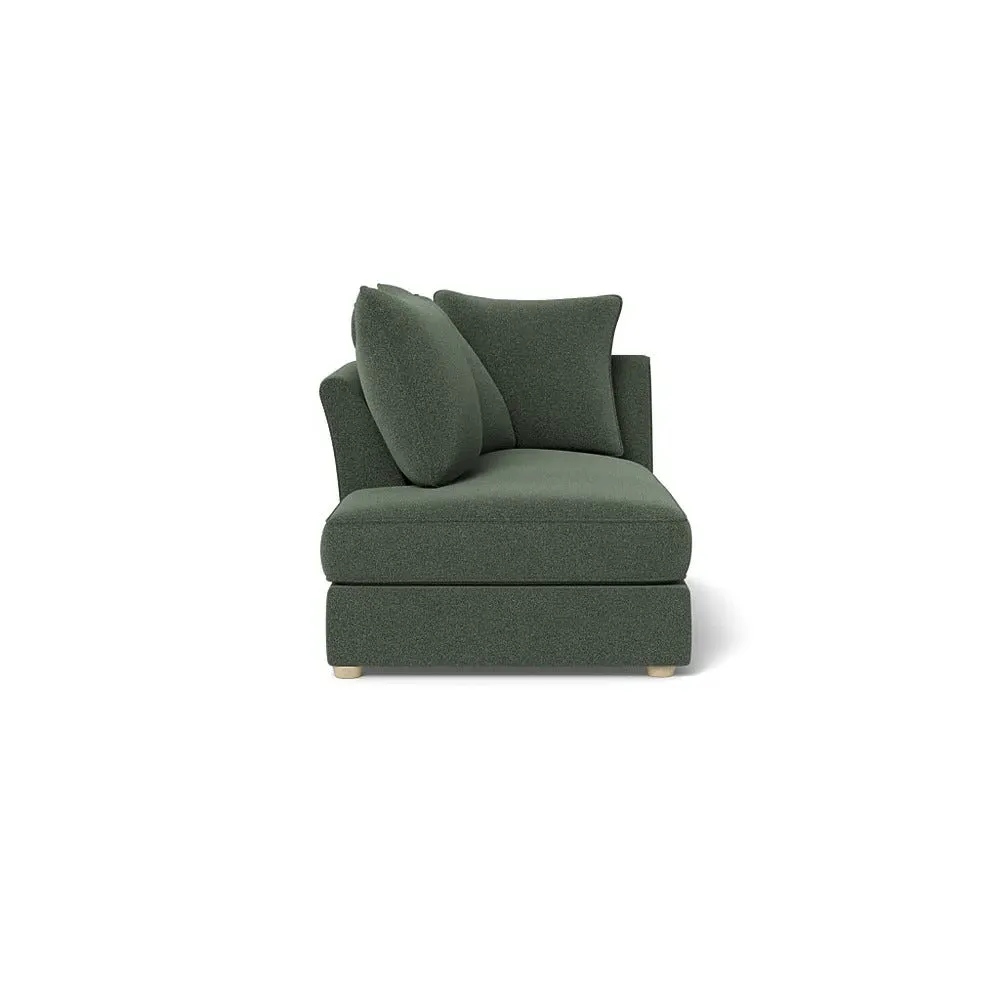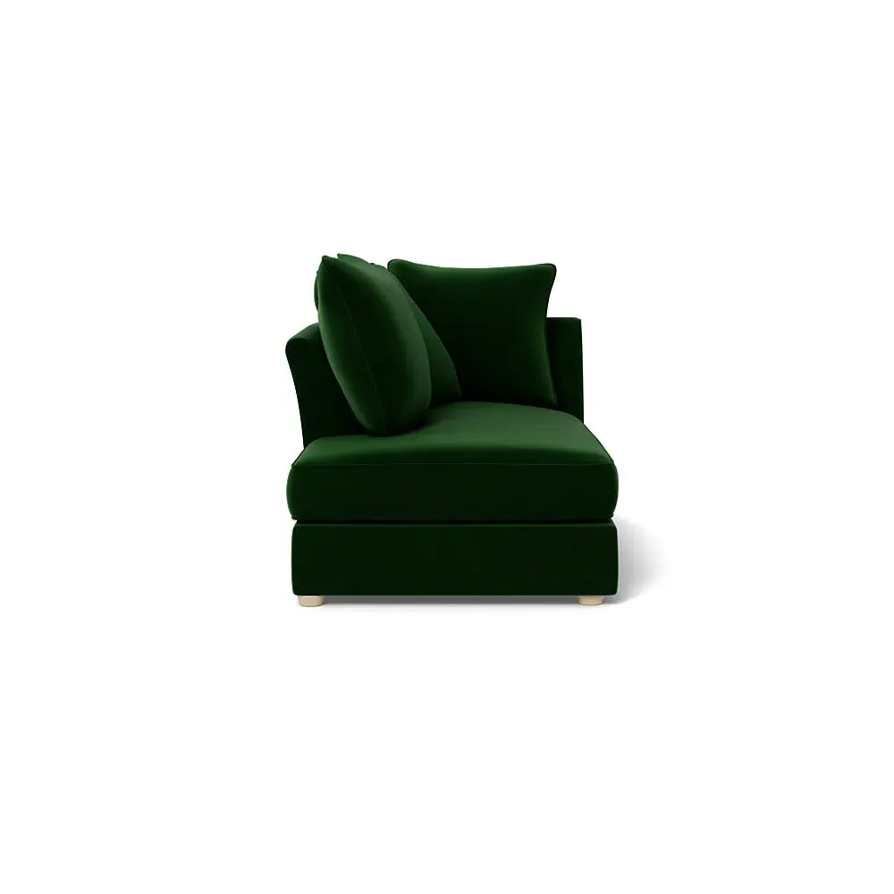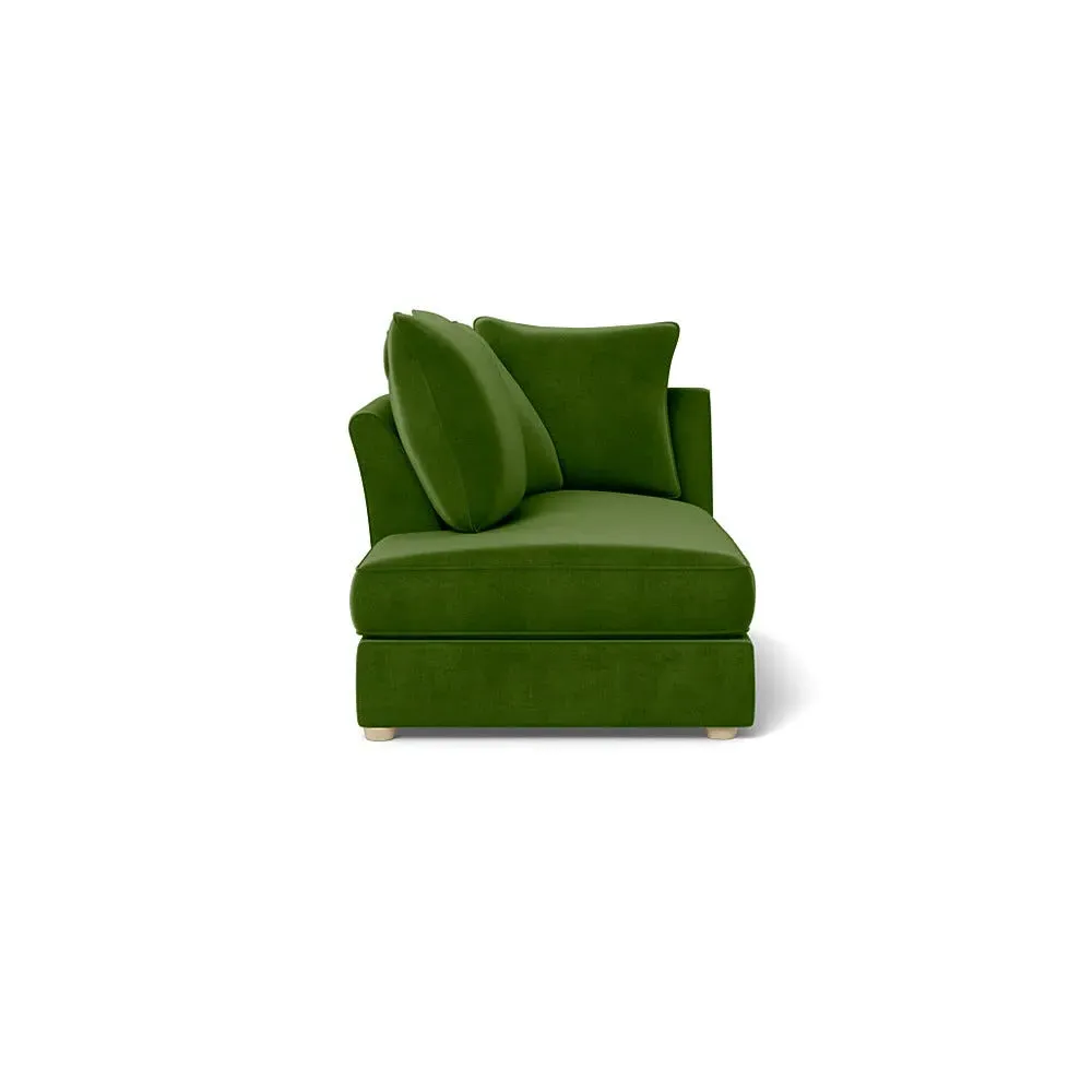 The chaise unit offers luxurious comfort with its brushed cotton upholstery in fresh green pine tones. Its right-hand facing design provides versatile placement options, while the natural wooden feet add warmth and stability. The tailored construction ensures lasting support and style.