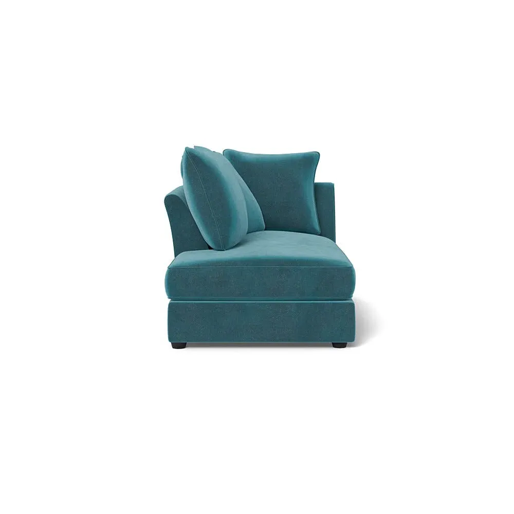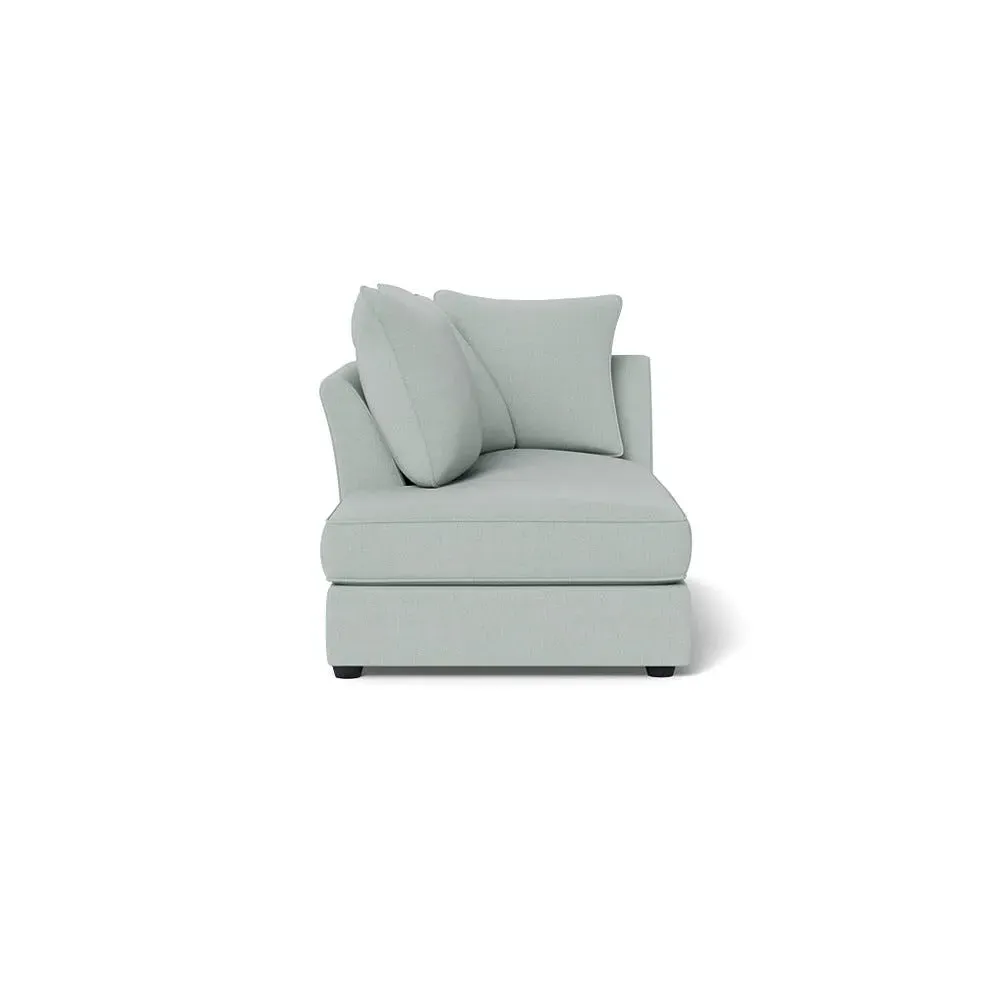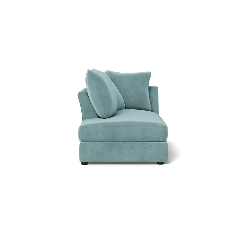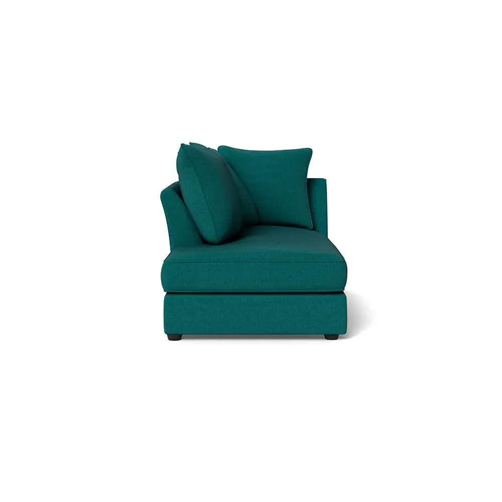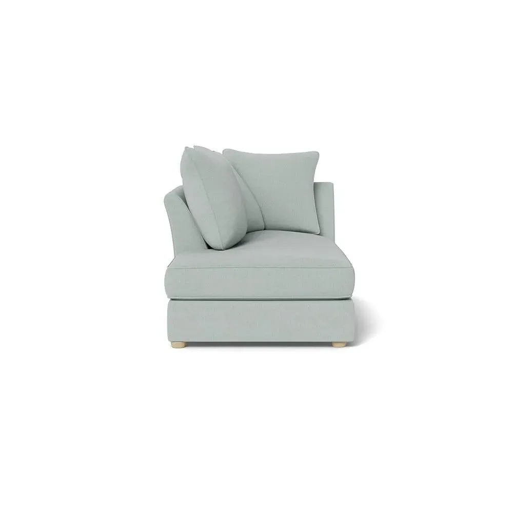 The chaise unit offers luxurious comfort with its brushed cotton upholstery in fresh green pine tones. Its right-hand facing design provides versatile placement options, while the natural wooden feet add warmth and stability. The tailored construction ensures lasting support and style.