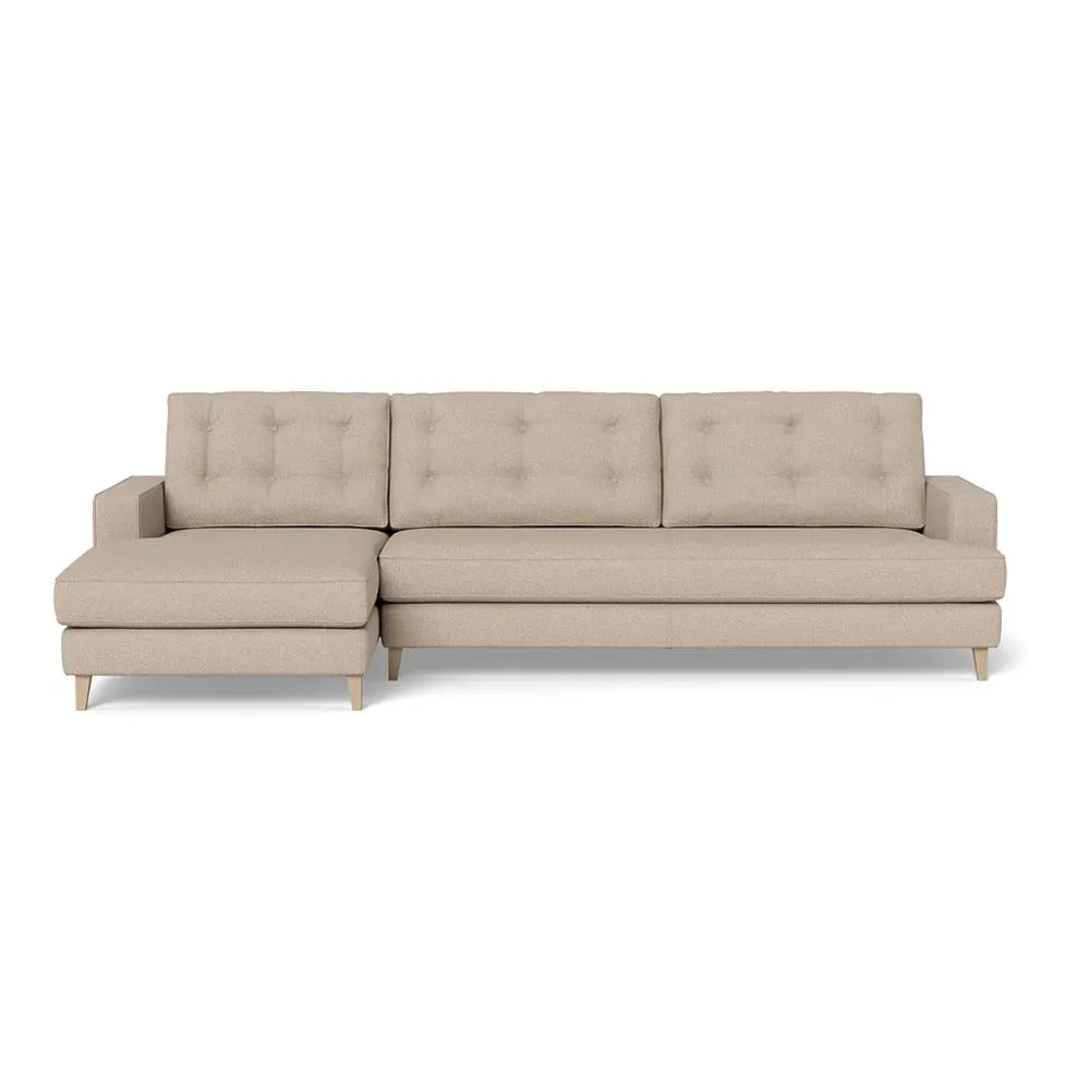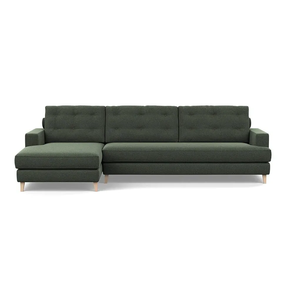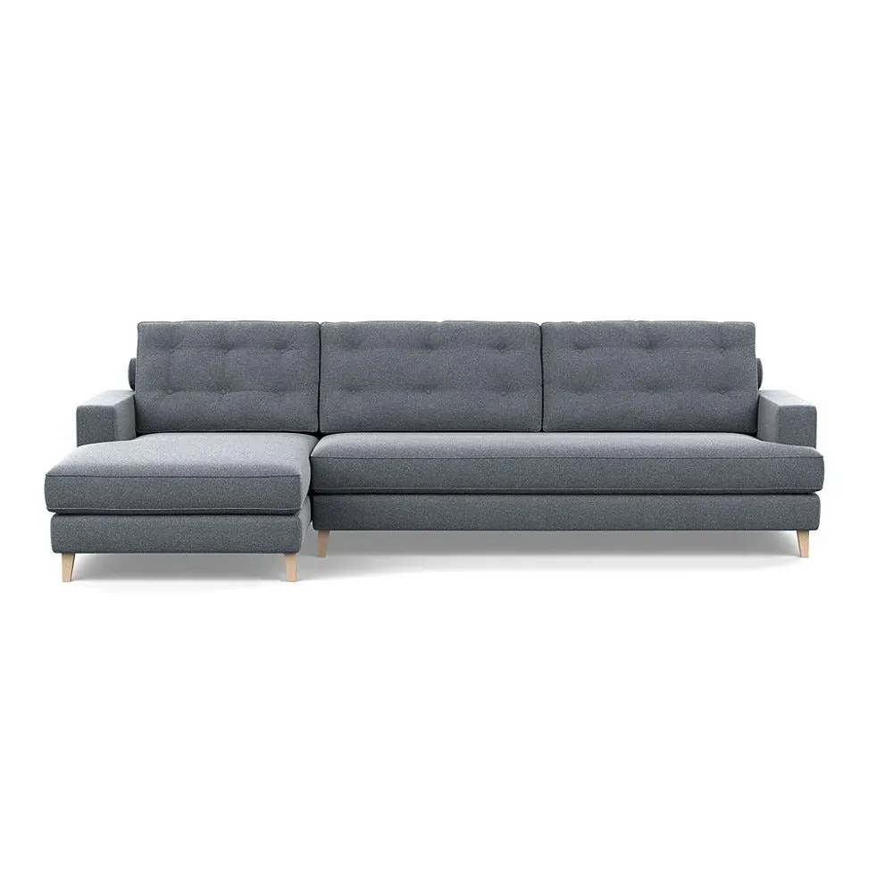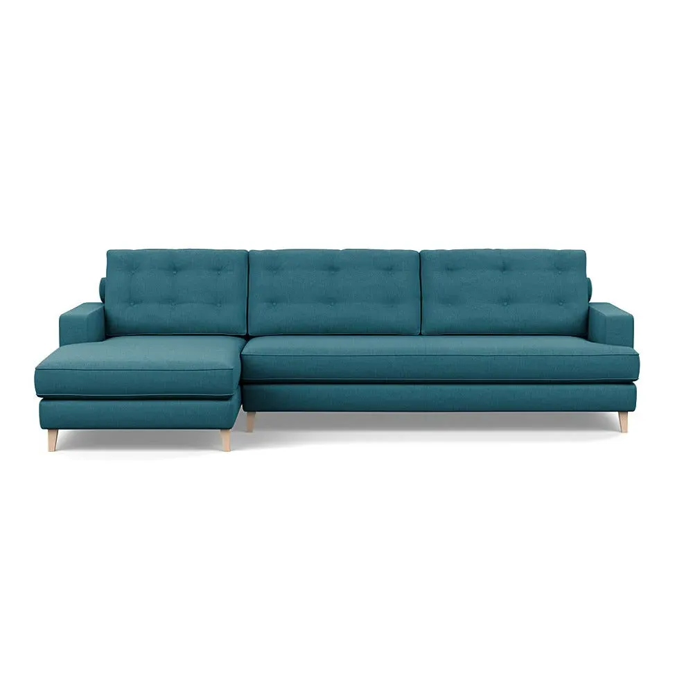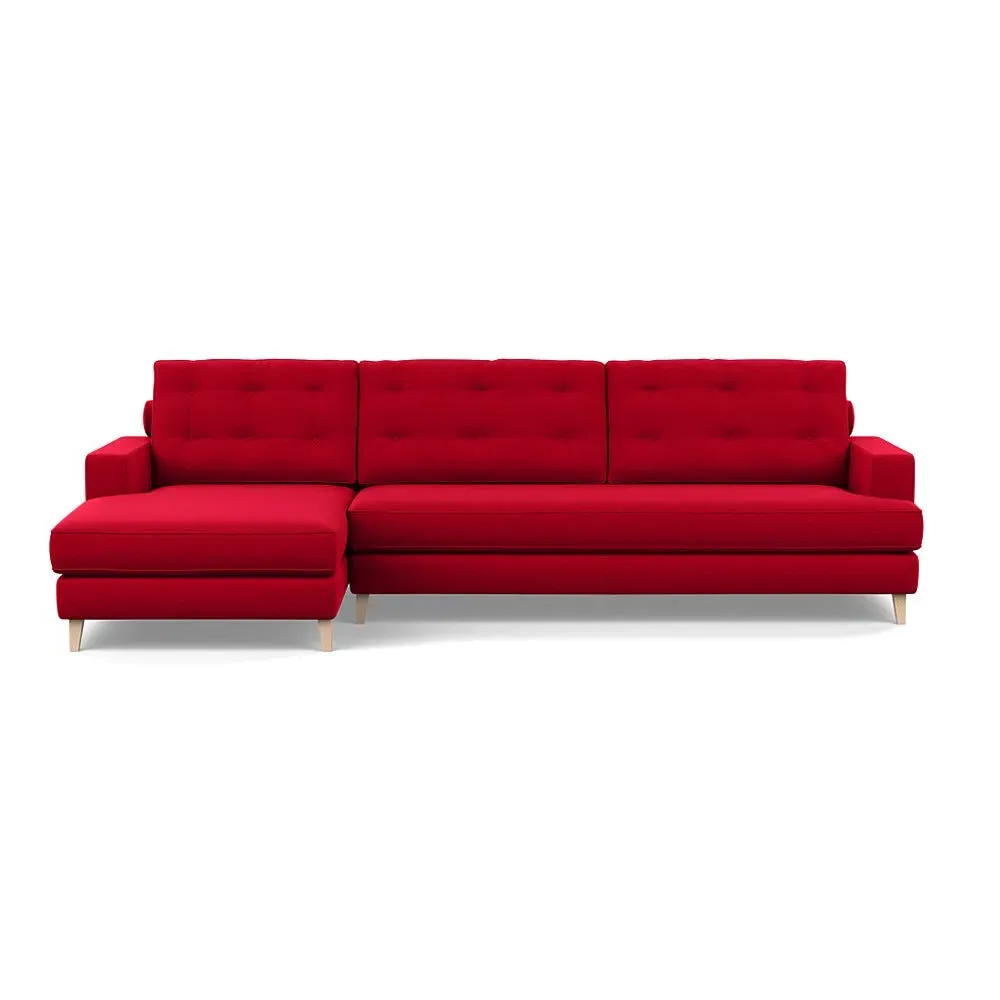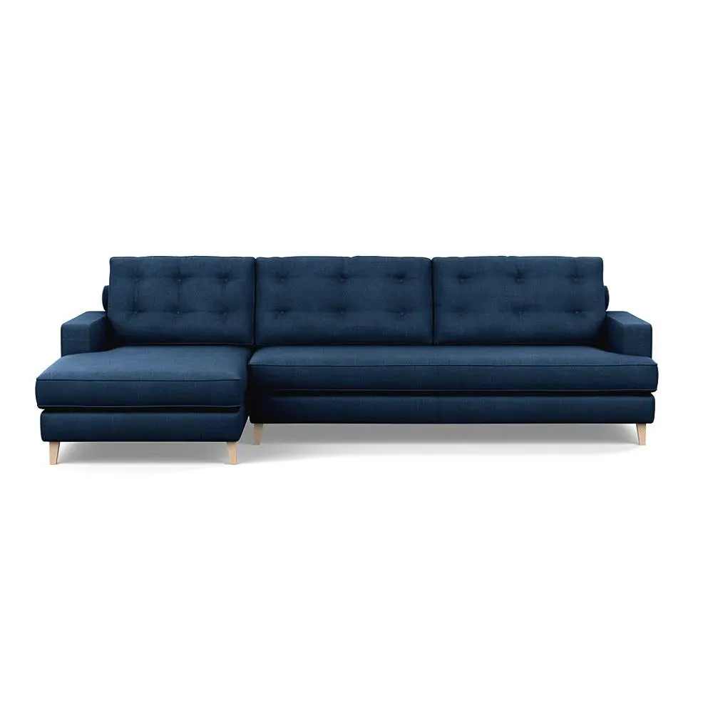 The corner sofa combines mid-century design with contemporary comfort, featuring a built-in chaise longue for extended relaxation. Its sturdy birch wood frame provides lasting support, while the supportive webbed seat structure and foam cushioning ensure optimal comfort. The button-cushioned back rest with bolster adds extra support, and the sleek tapered beech wood feet complete the retro-inspired aesthetic.