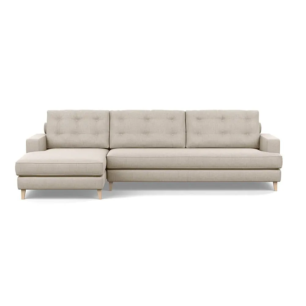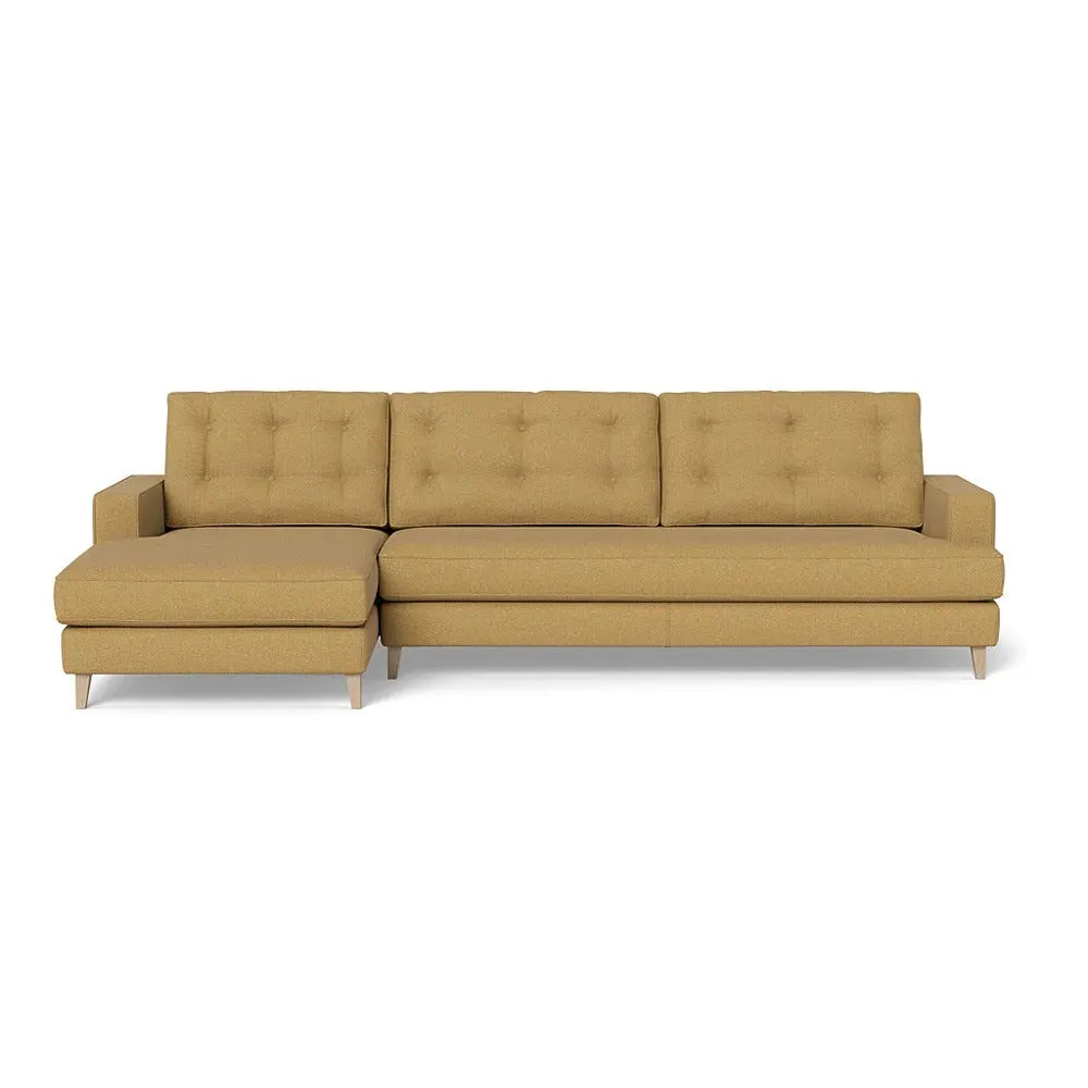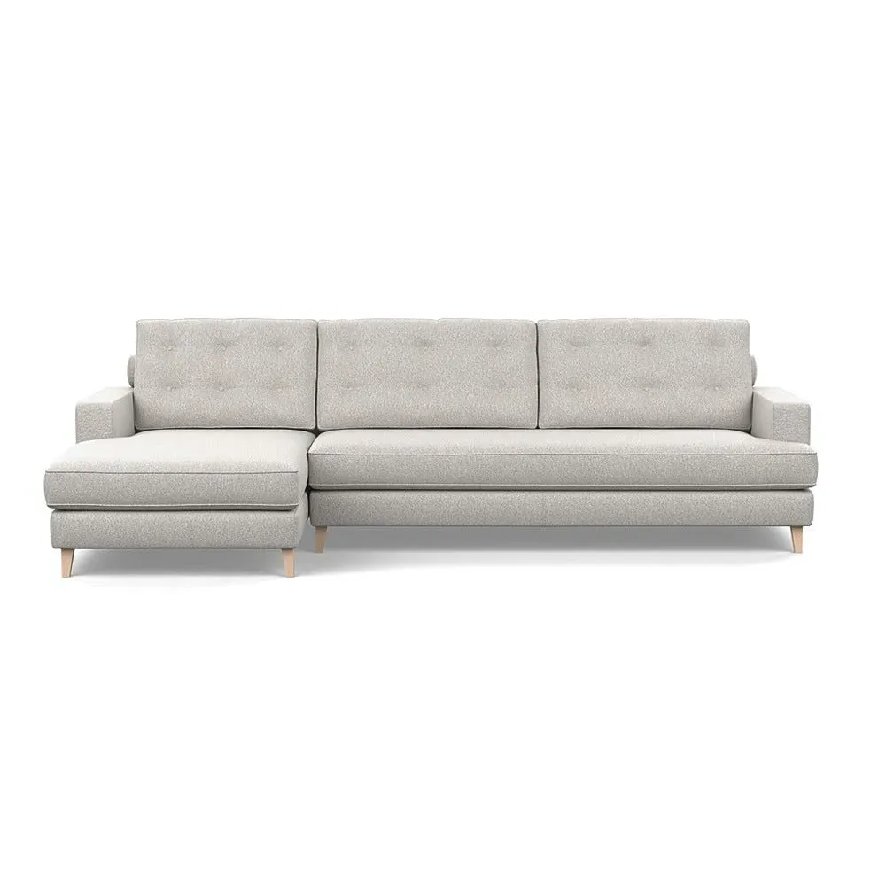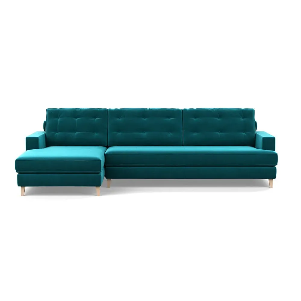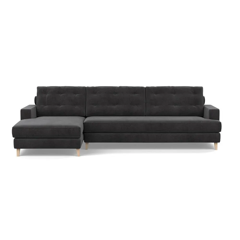 The corner sofa combines mid-century design with contemporary comfort, featuring a built-in chaise longue for extended relaxation. Its sturdy birch wood frame provides lasting support, while the supportive webbed seat structure and foam cushioning ensure optimal comfort. The button-cushioned back rest with bolster adds extra support, and the sleek tapered beech wood feet complete the retro-inspired aesthetic.