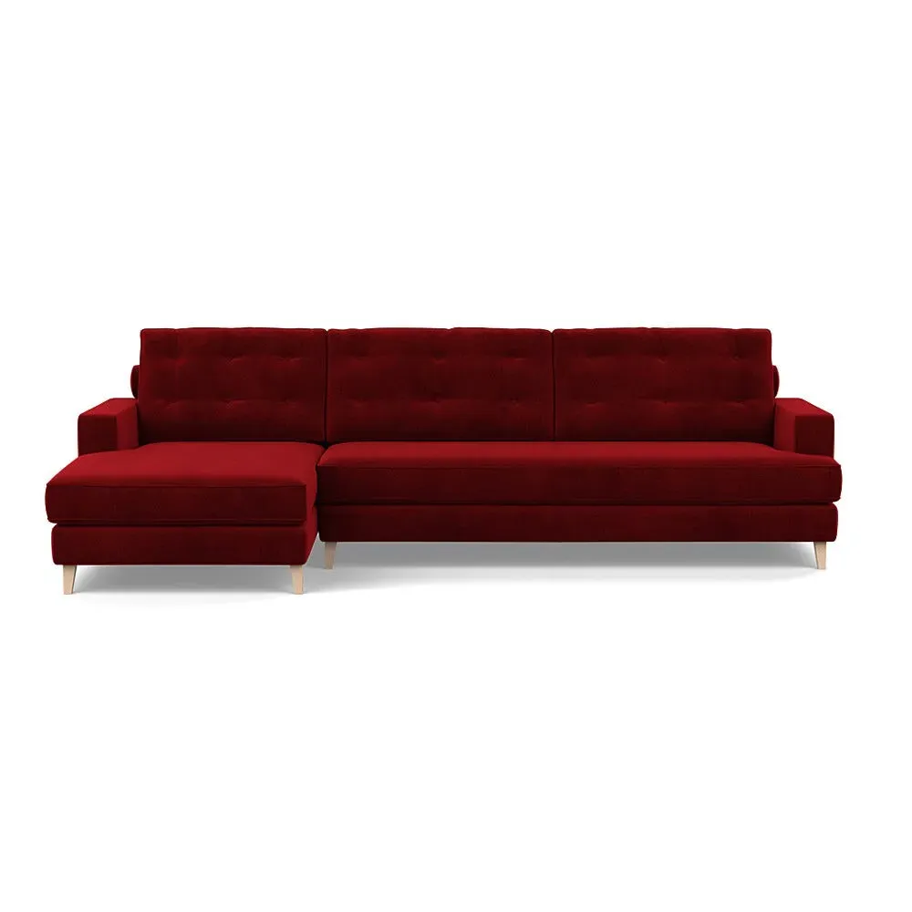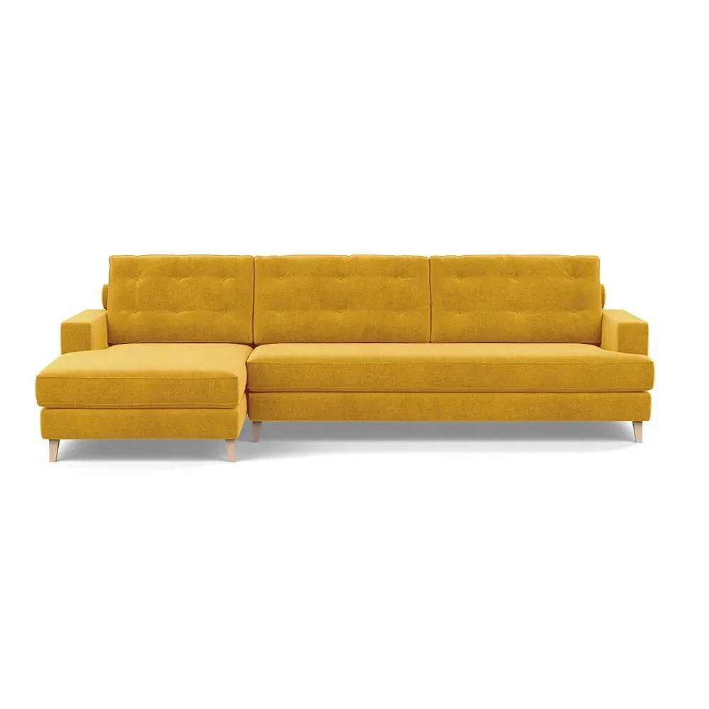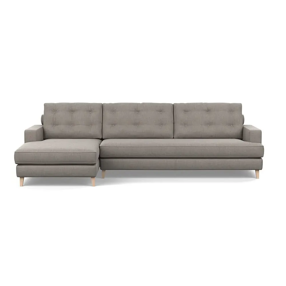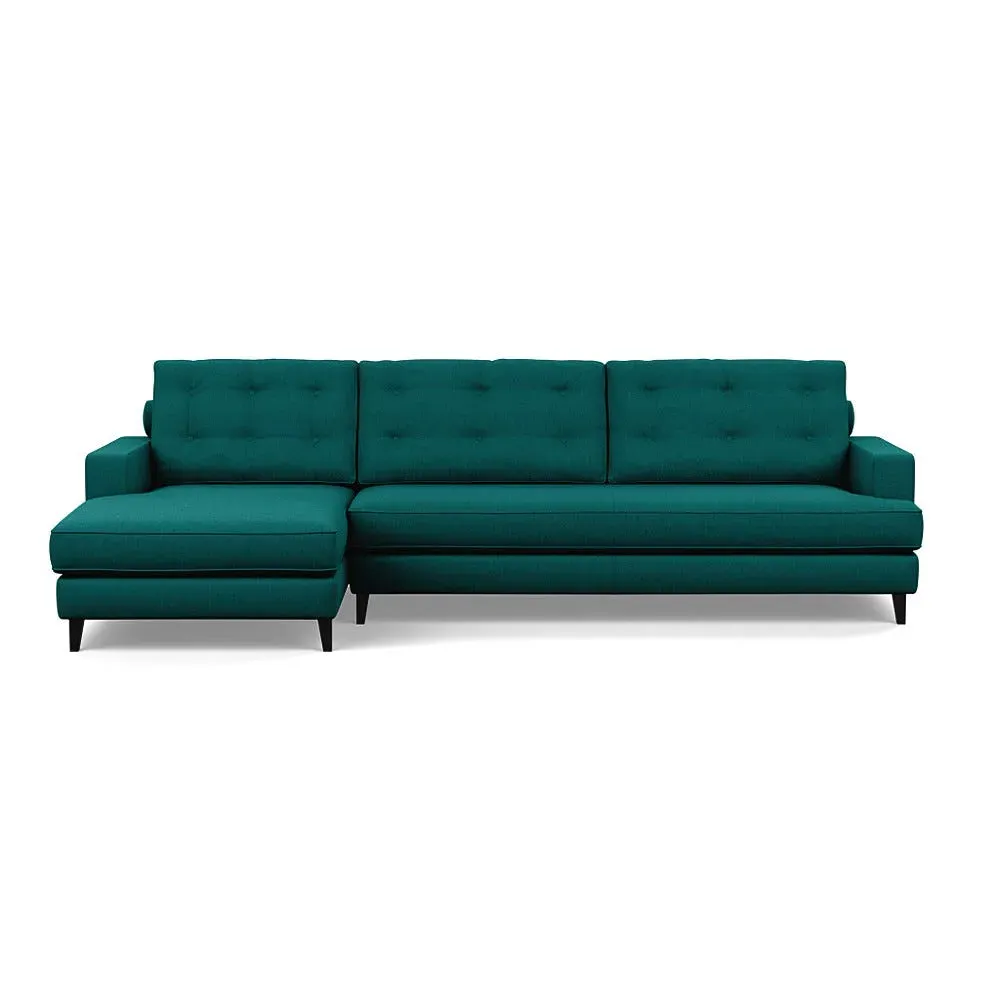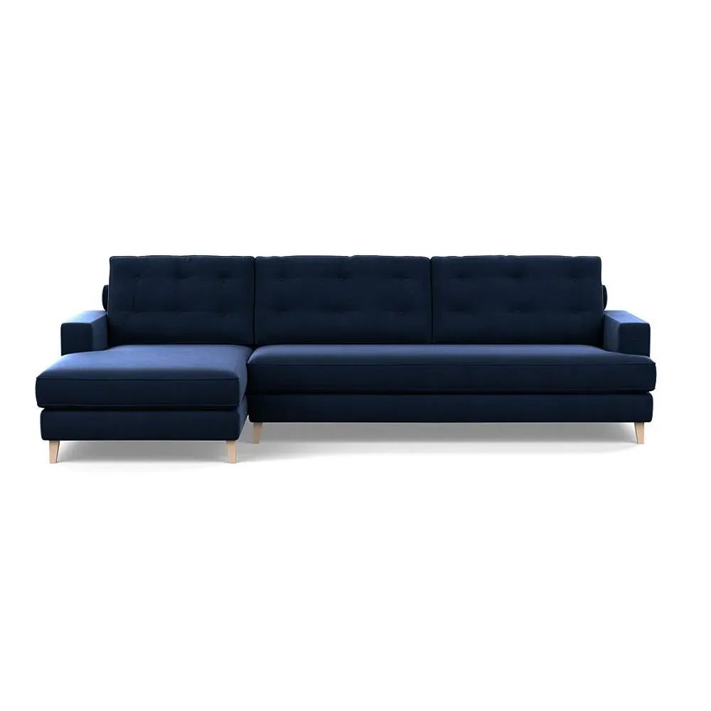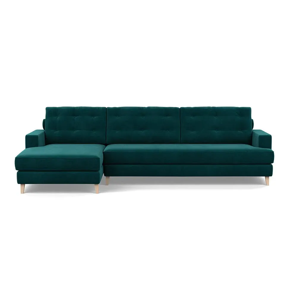 The corner sofa combines mid-century design with contemporary comfort, featuring a built-in chaise longue for extended relaxation. Its sturdy birch wood frame provides lasting support, while the supportive webbed seat structure and foam cushioning ensure optimal comfort. The button-cushioned back rest with bolster adds extra support, and the sleek tapered beech wood feet complete the retro-inspired aesthetic.
