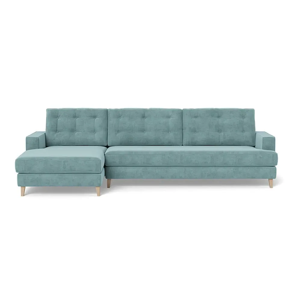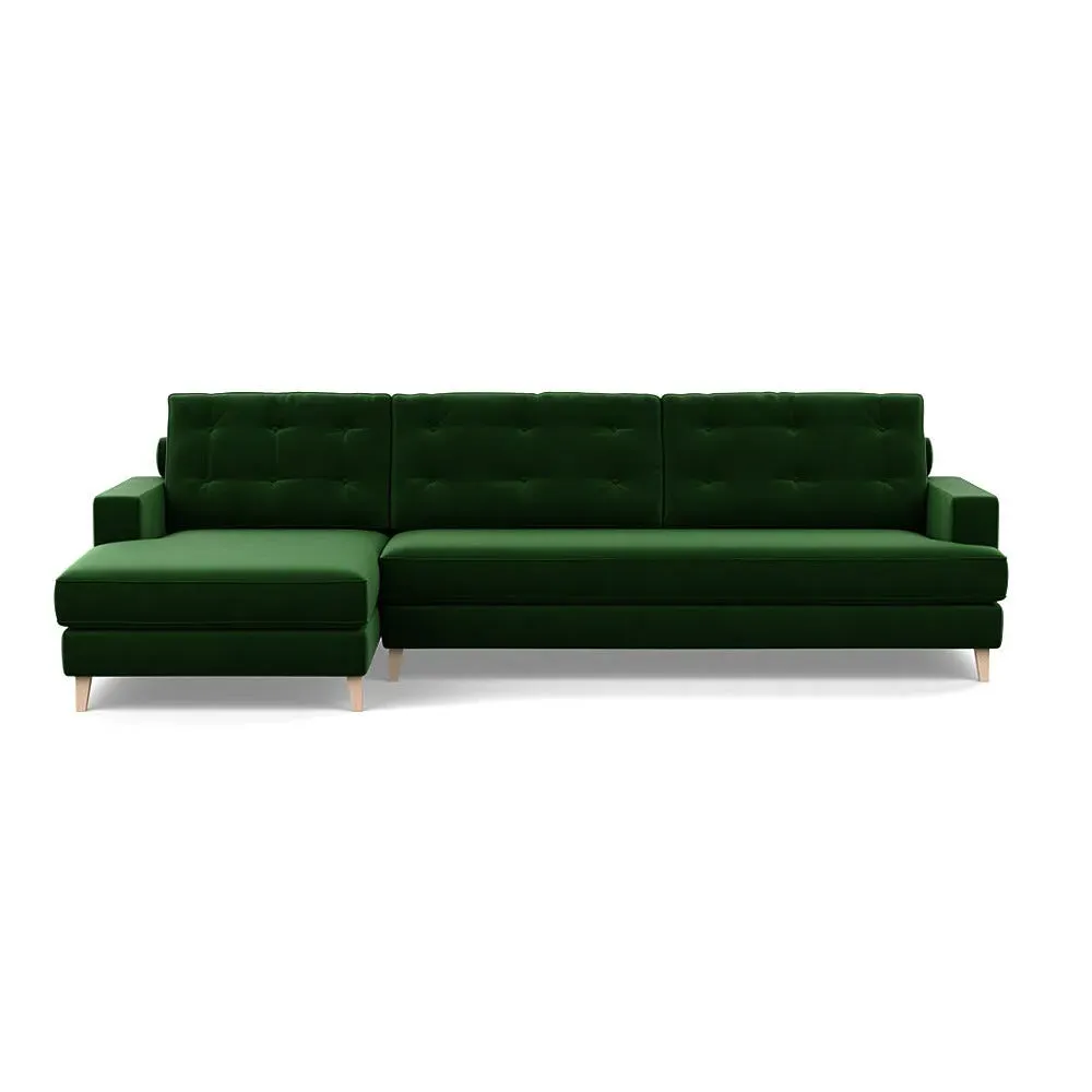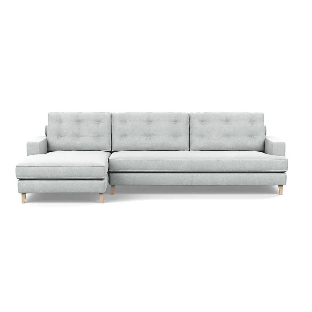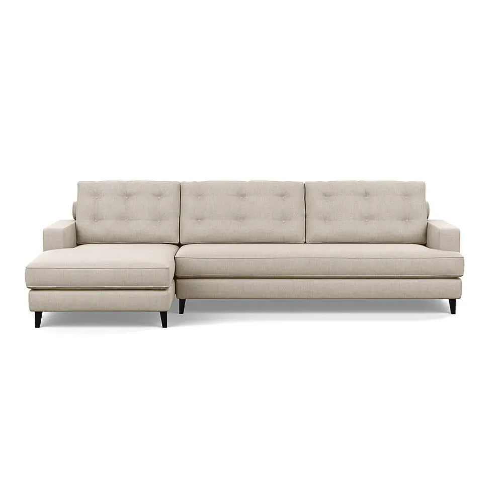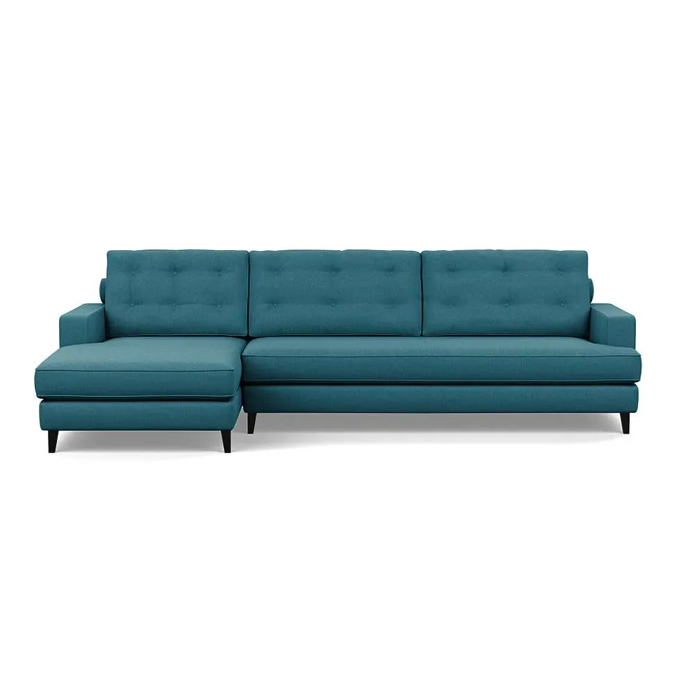 The corner sofa combines mid-century design with contemporary comfort, featuring a built-in chaise longue for extended relaxation. Its sturdy birch wood frame provides lasting support, while the supportive webbed seat structure and foam cushioning ensure optimal comfort. The button-cushioned back rest with bolster adds extra support, and the sleek tapered beech wood feet complete the retro-inspired aesthetic.