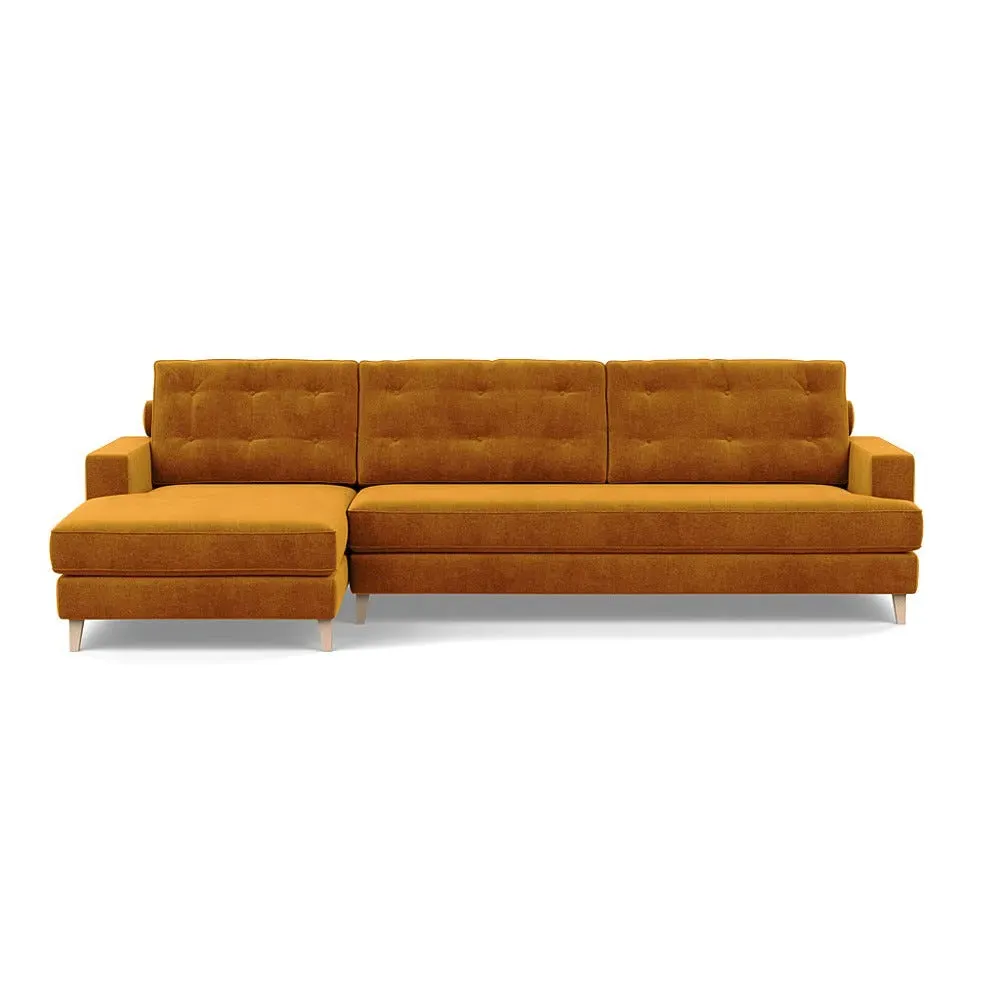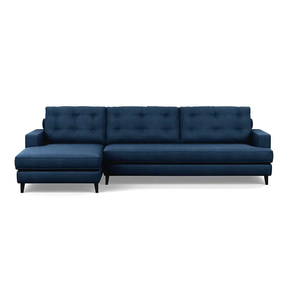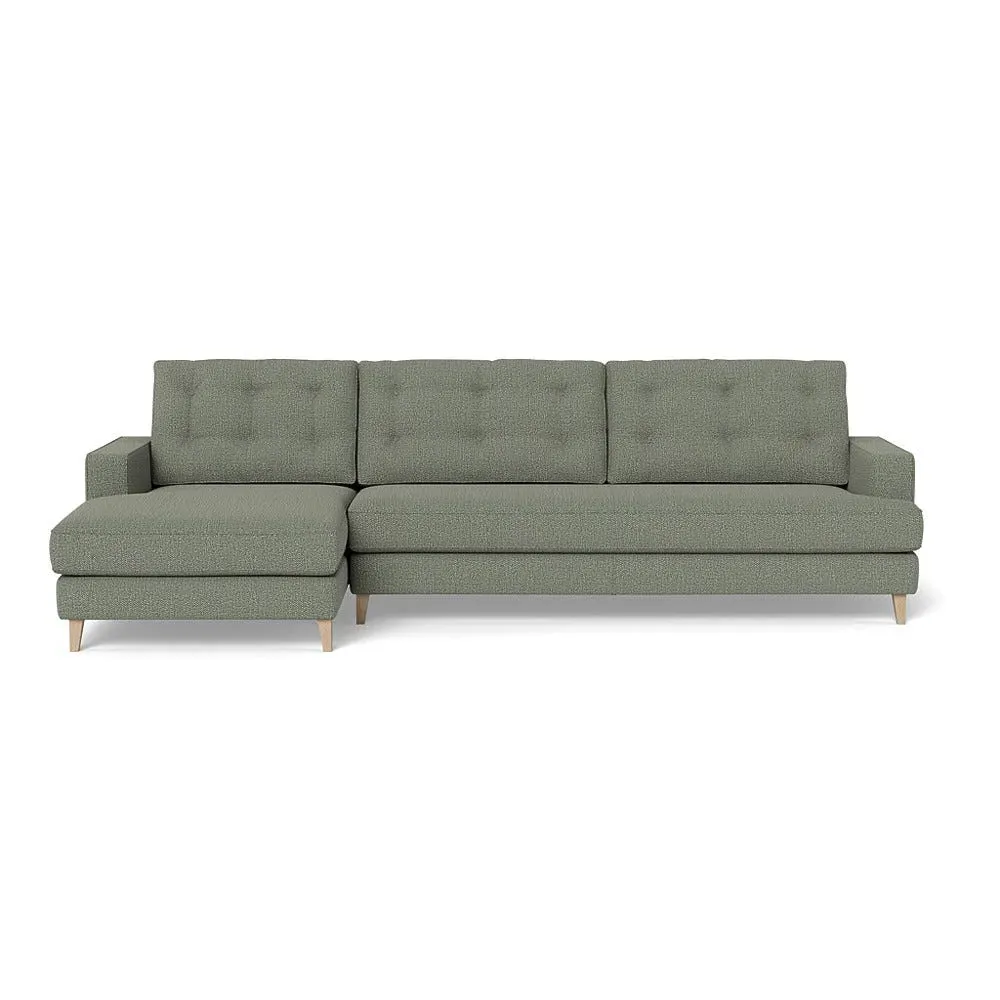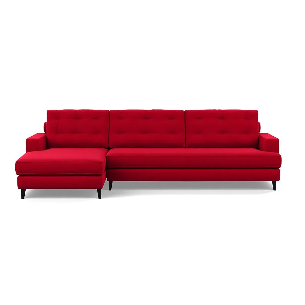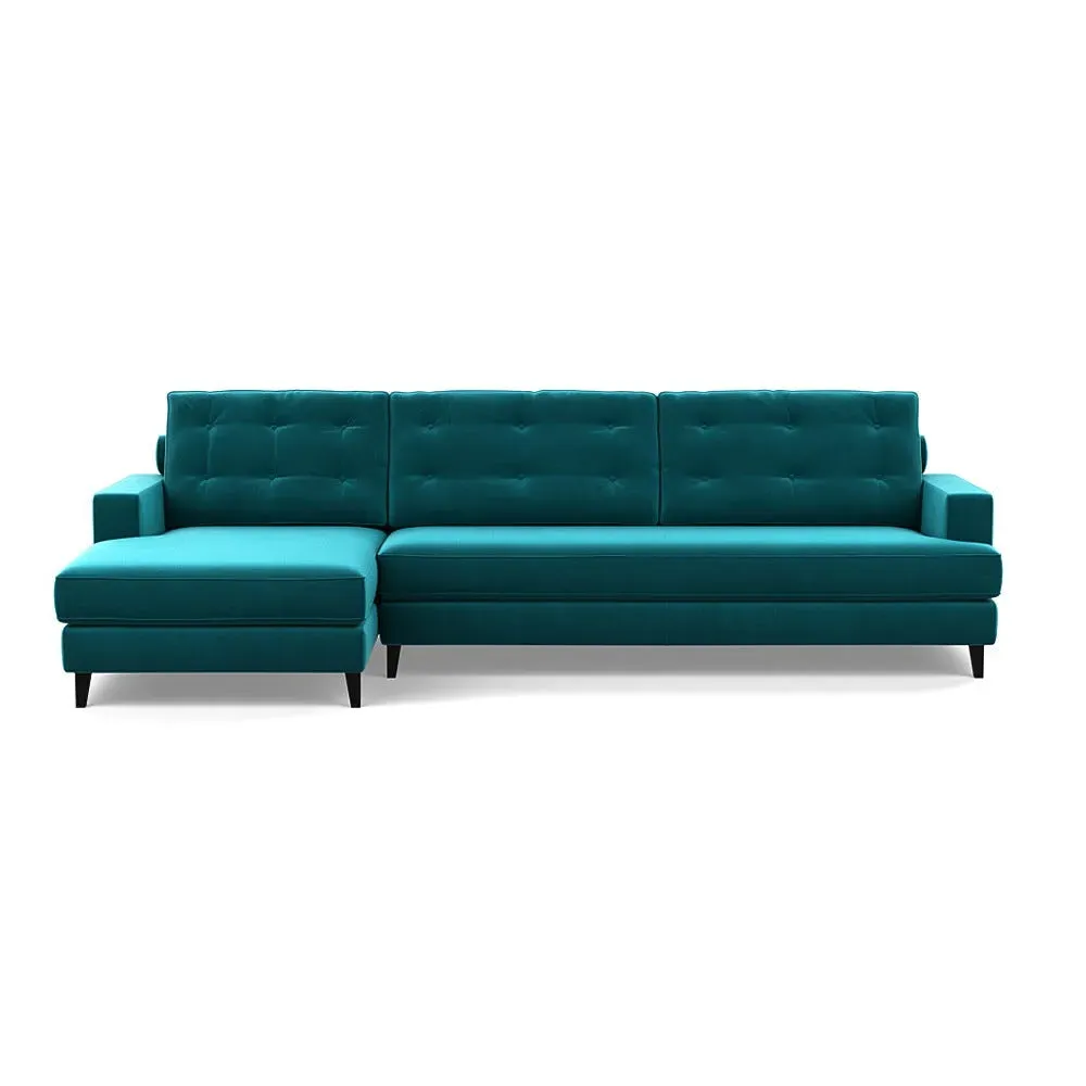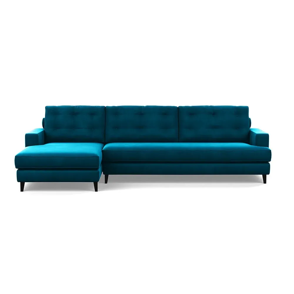 The corner sofa combines mid-century design with contemporary comfort, featuring a built-in chaise longue for extended relaxation. Its sturdy birch wood frame provides lasting support, while the supportive webbed seat structure and foam cushioning ensure optimal comfort. The button-cushioned back rest with bolster adds extra support, and the sleek tapered beech wood feet complete the retro-inspired aesthetic.