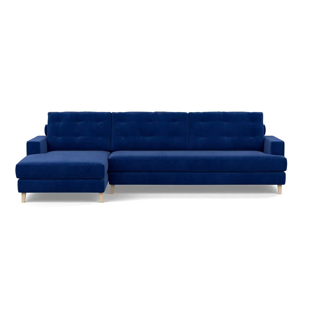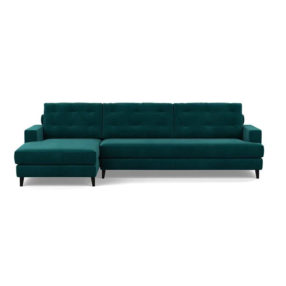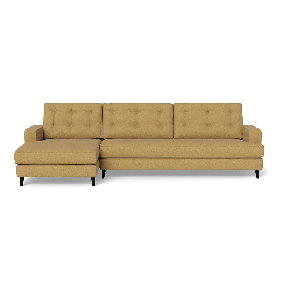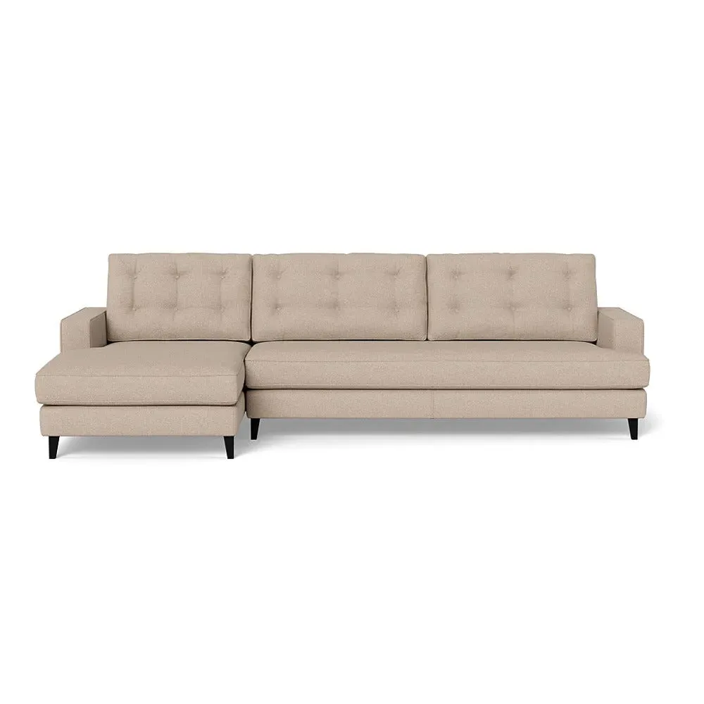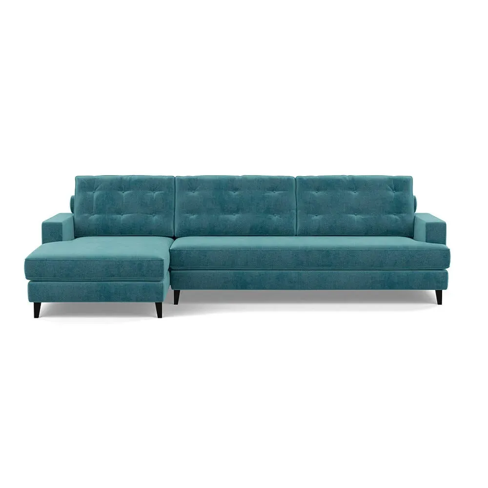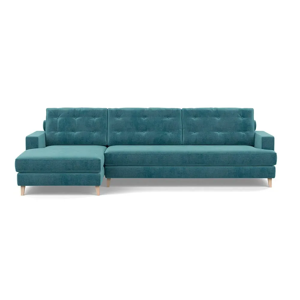 The corner sofa combines mid-century design with contemporary comfort, featuring a built-in chaise longue for extended relaxation. Its sturdy birch wood frame provides lasting support, while the supportive webbed seat structure and foam cushioning ensure optimal comfort. The button-cushioned back rest with bolster adds extra support, and the sleek tapered beech wood feet complete the retro-inspired aesthetic.