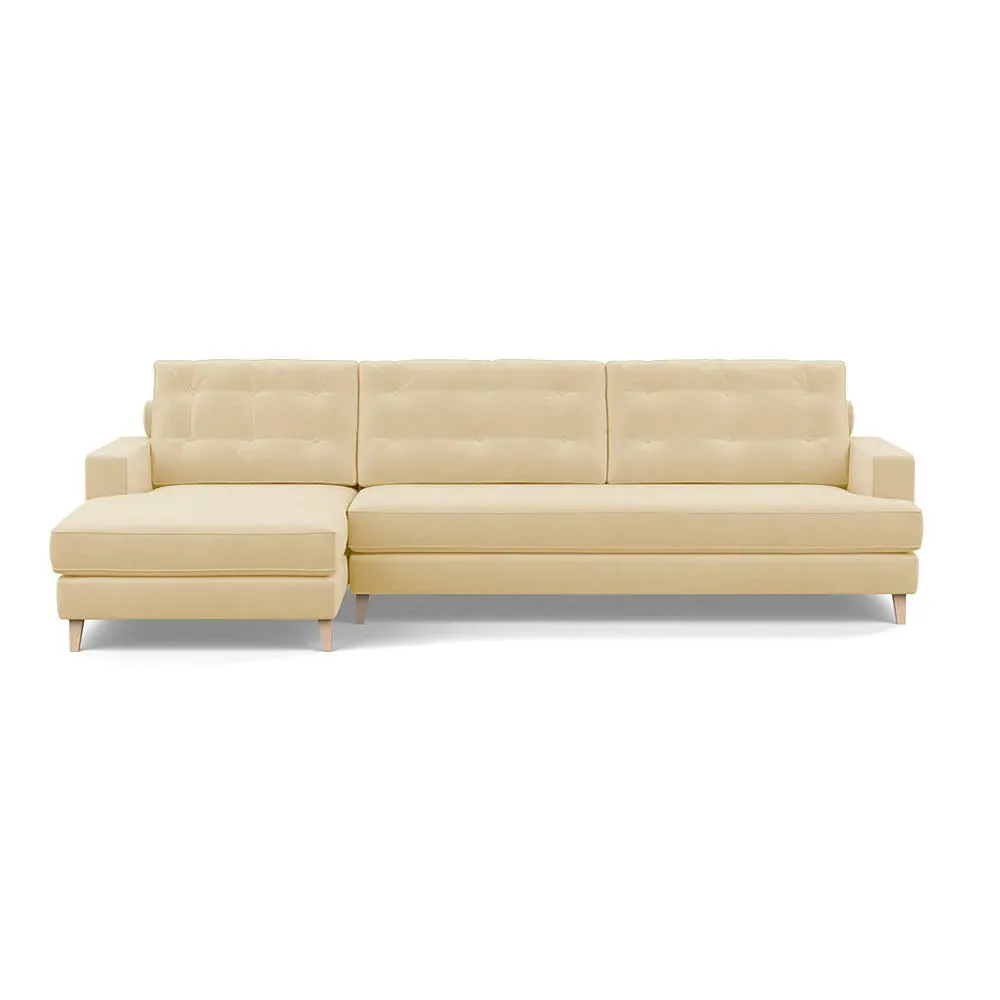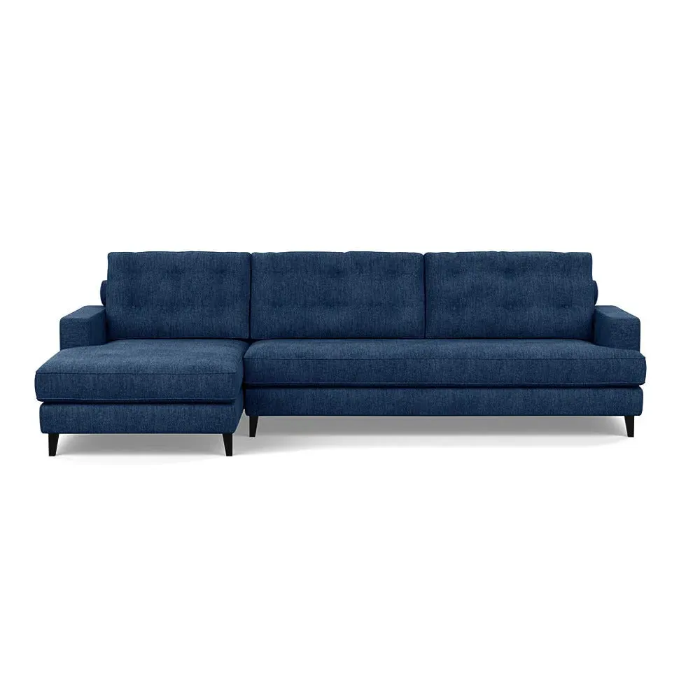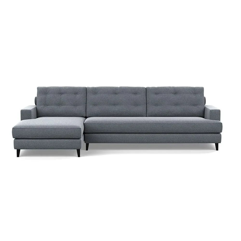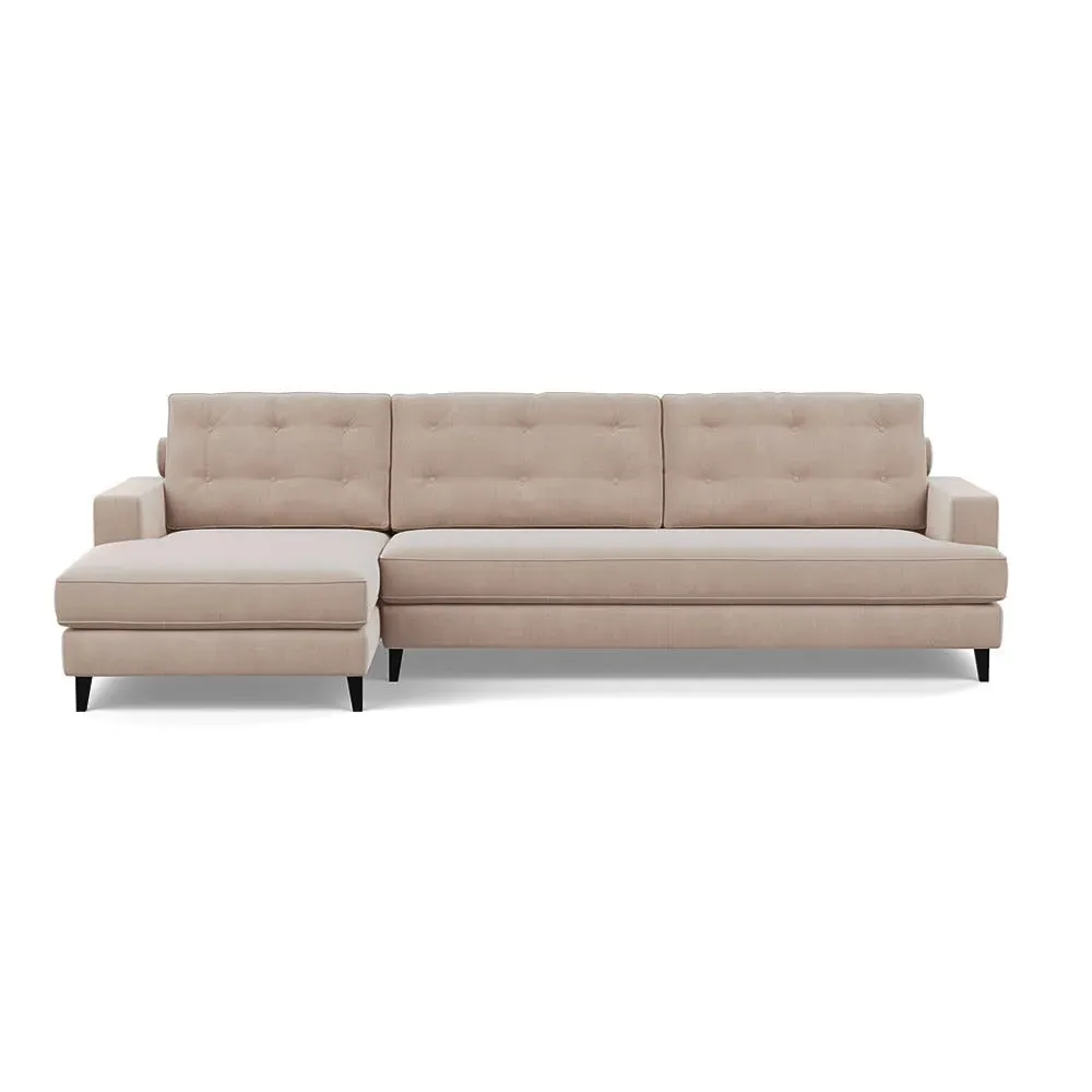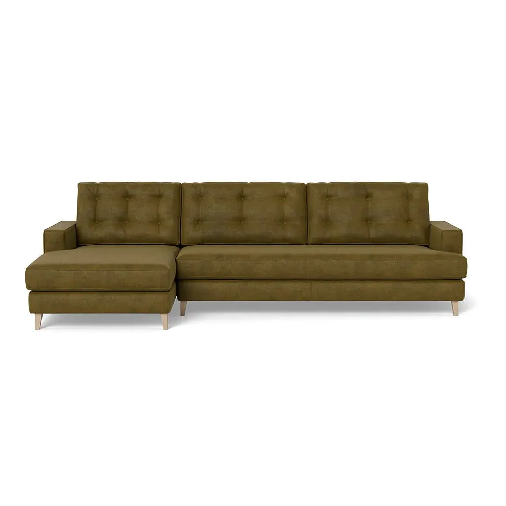 The corner sofa combines mid-century design with contemporary comfort, featuring a built-in chaise longue for extended relaxation. Its sturdy birch wood frame provides lasting support, while the supportive webbed seat structure and foam cushioning ensure optimal comfort. The button-cushioned back rest with bolster adds extra support, and the sleek tapered beech wood feet complete the retro-inspired aesthetic.