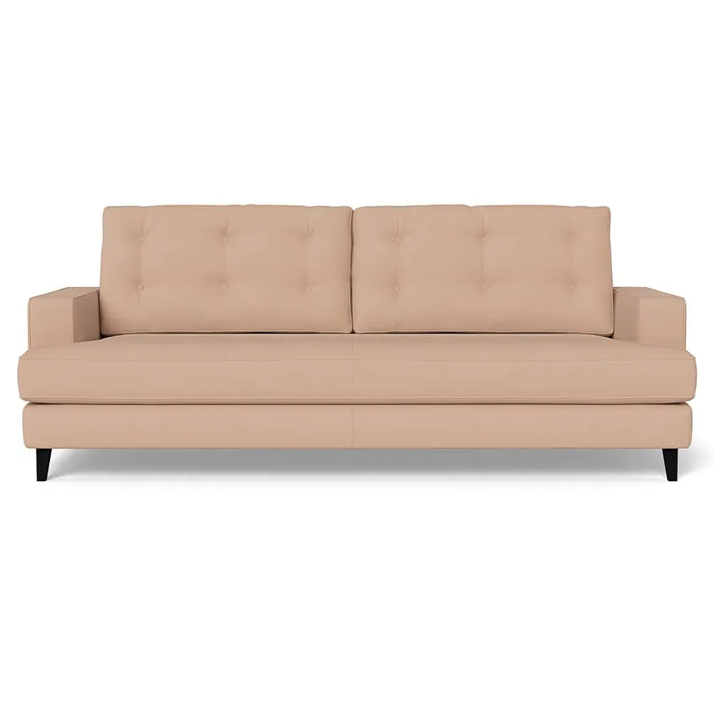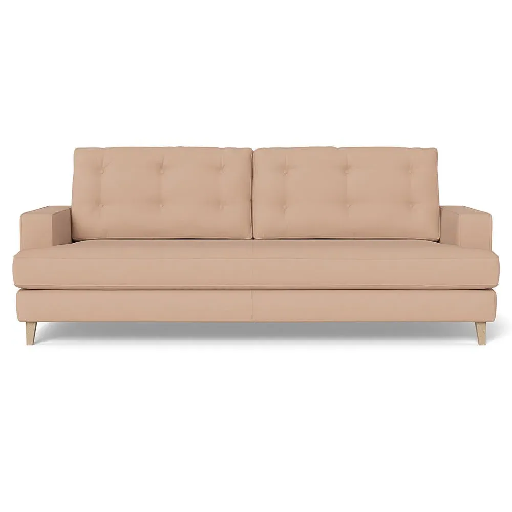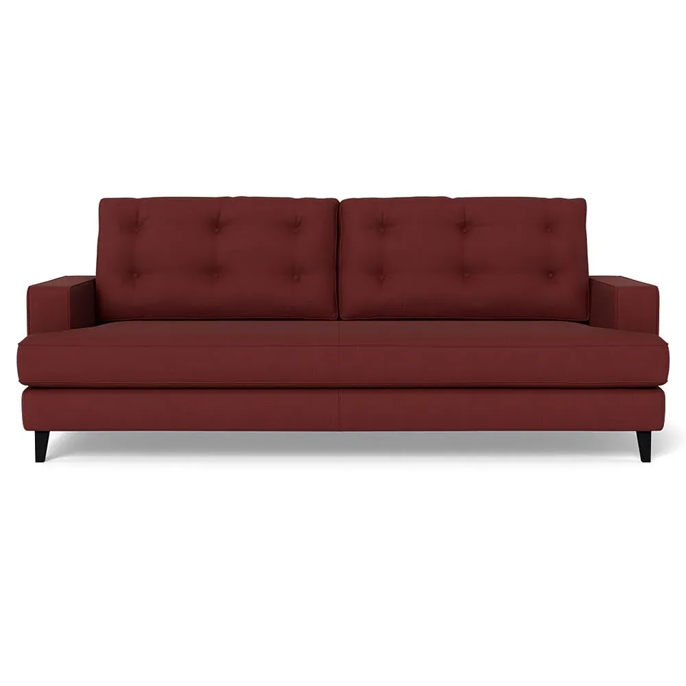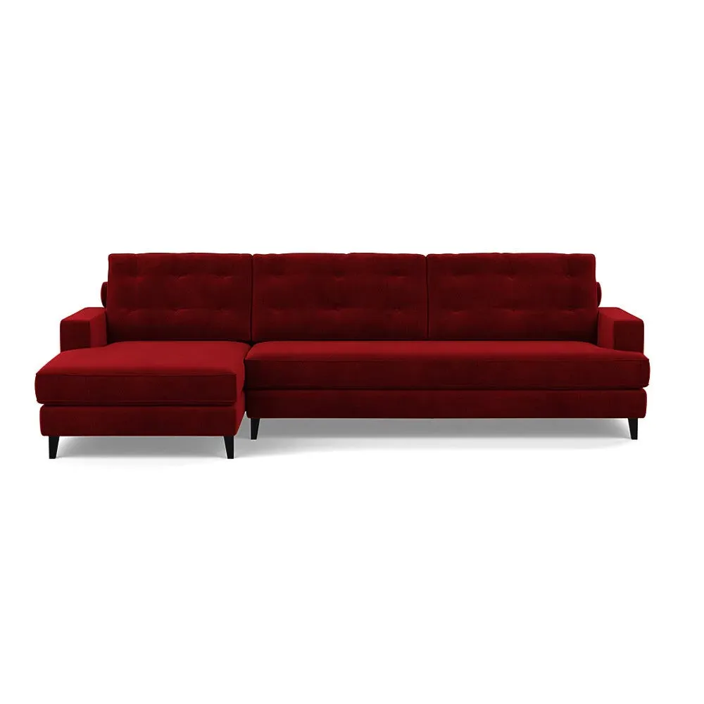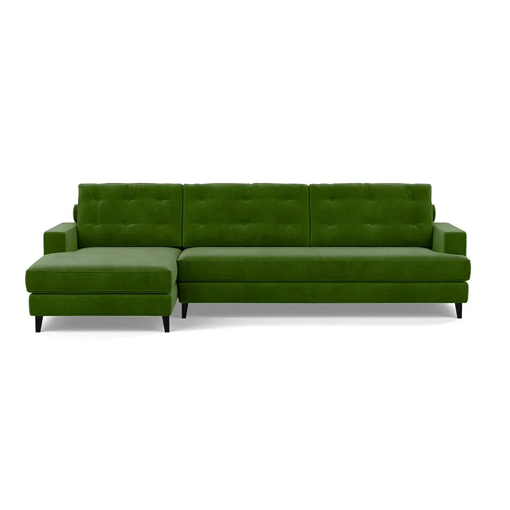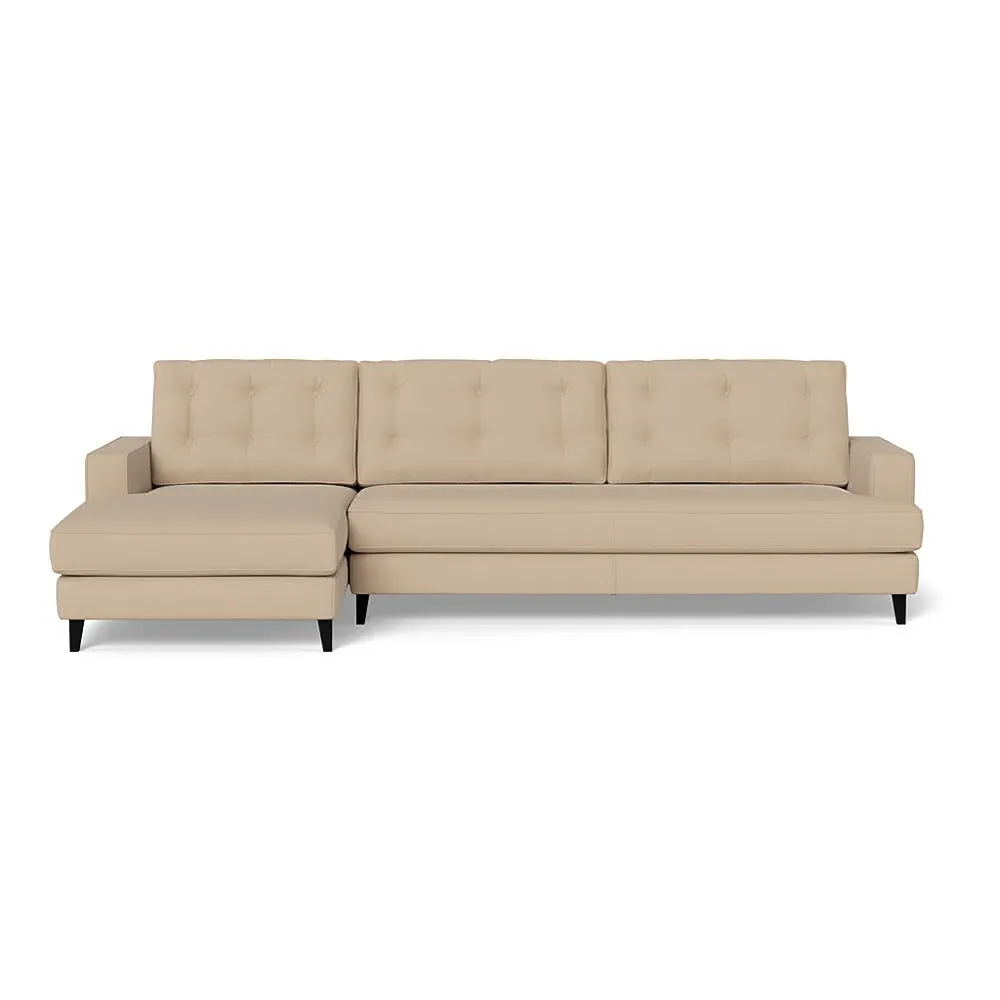The corner sofa combines mid-century design with contemporary comfort, featuring a built-in chaise longue for extended relaxation. Its sturdy birch wood frame provides lasting support, while the supportive webbed seat structure and foam cushioning ensure optimal comfort. The button-cushioned back rest with bolster adds extra support, and the sleek tapered beech wood feet complete the retro-inspired aesthetic.