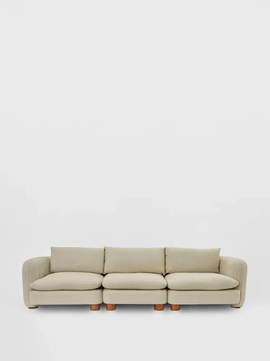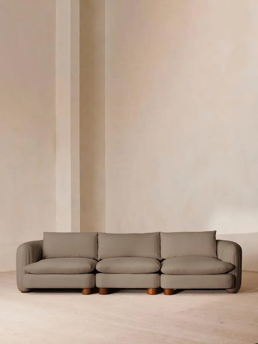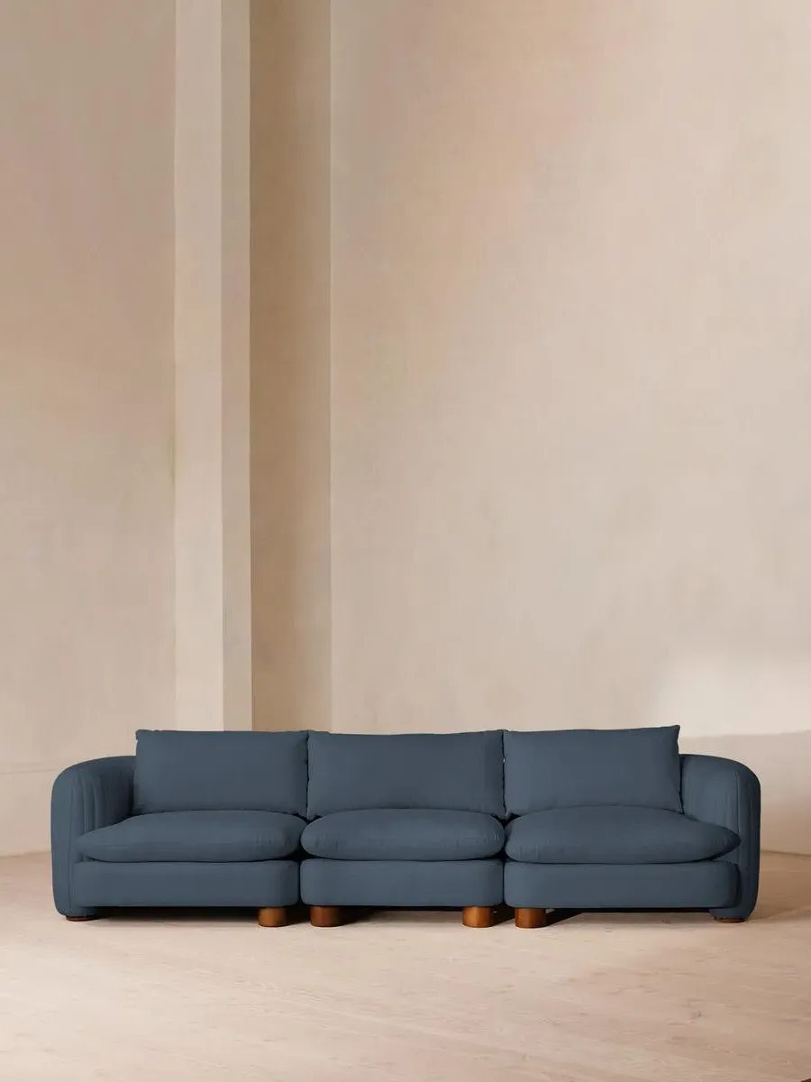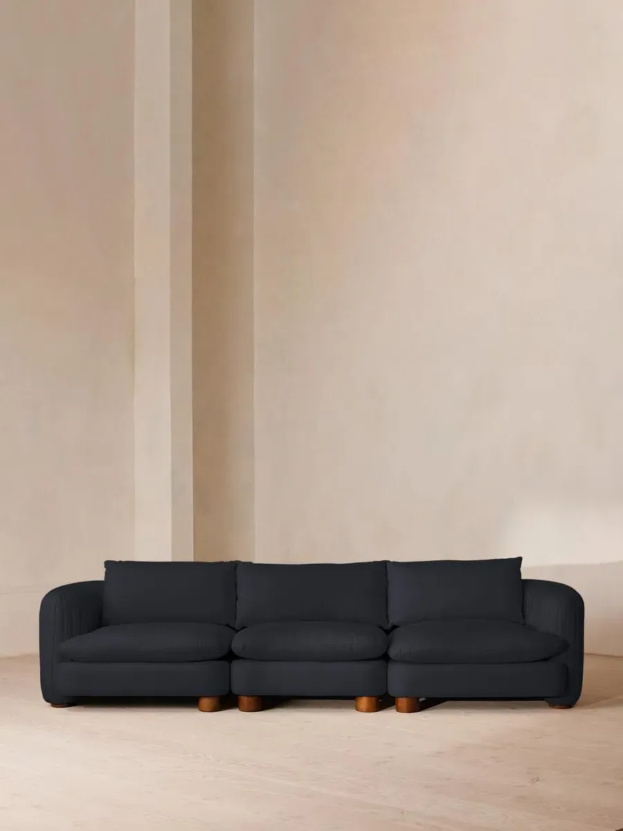 The eighth floor at White City House forms the inspiration for the Vivienne modular sofa. Upholstered in rich velvet, it features pleated stitch detailing, cylindrical legs and a wraparound back. Low lounge sitting makes this piece ideal for cosy evenings. Coordinate and configure with other pieces in the Vivienne collection for the sofa shape of your choice.