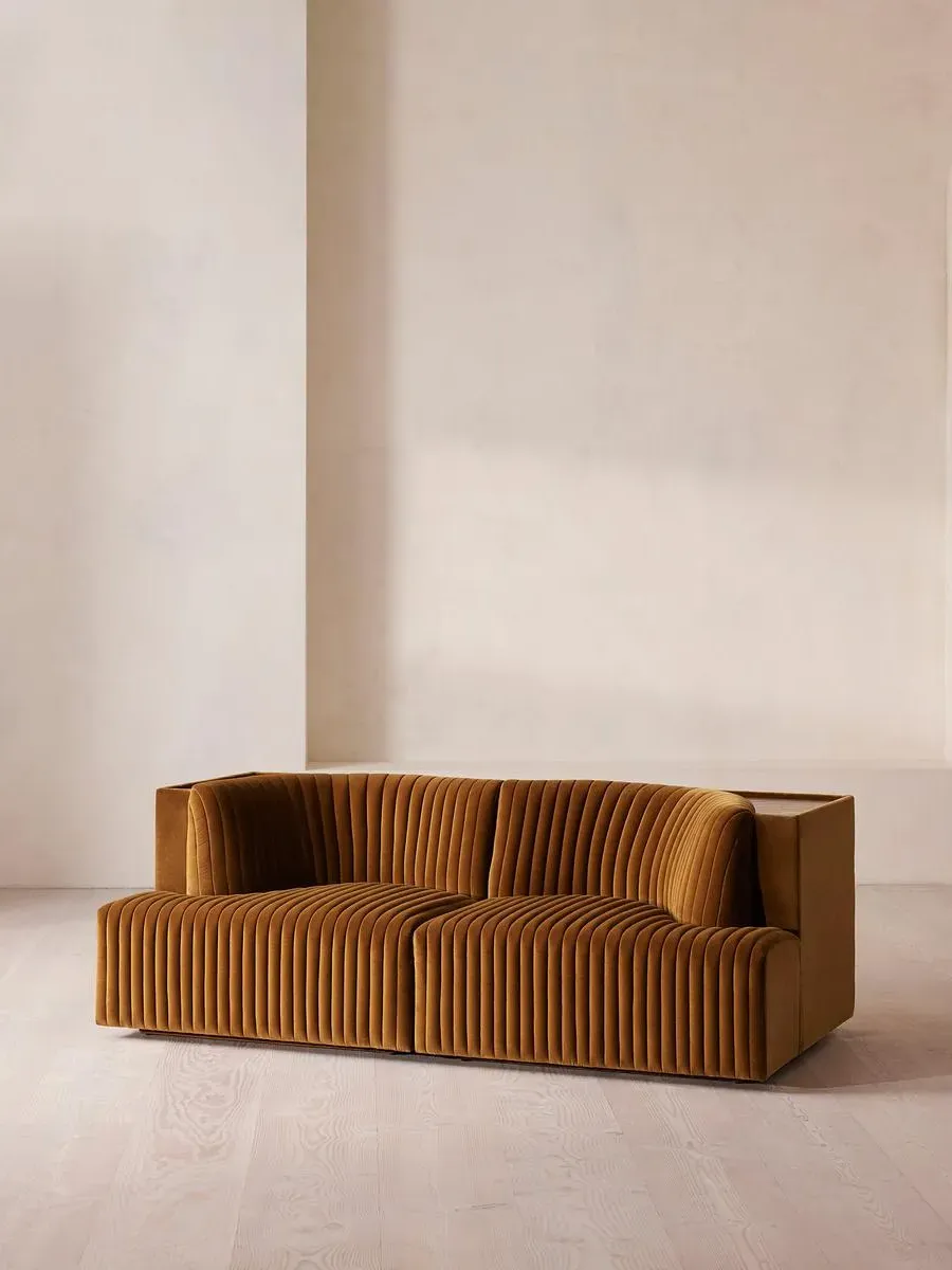 Channelled velvet upholstery in bespoke shades is mixed with a multi-functional oak inlay shelf made to perch drinks, lamps and other decor on. Filled with curved silhouettes and tactile materials, the interiors of 180 House inspired the design of our Hamish sofa. Made to order in your choice of bespoke colour, its silhouette is defined by channelled velvet upholstery and a wavy backrest, finished with a shelf to perch lamps or drinks on. Choose between three and four-seater or corner configurations to create a layout that's specially built for your space.