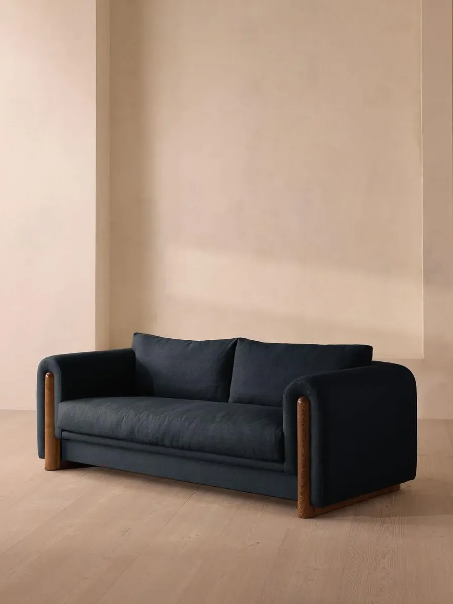 The sofa combines a solid oak frame with cotton velvet upholstery in a low-rise silhouette. Its curved arms blend seamlessly with the frame construction, while the three-seater design provides comfortable seating. The oak frame ensures durability and the velvet finish adds softness to the overall structure.
